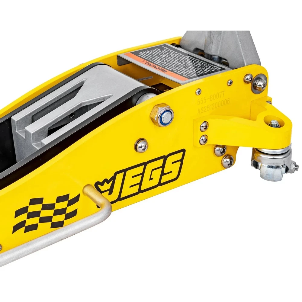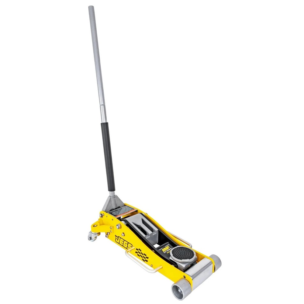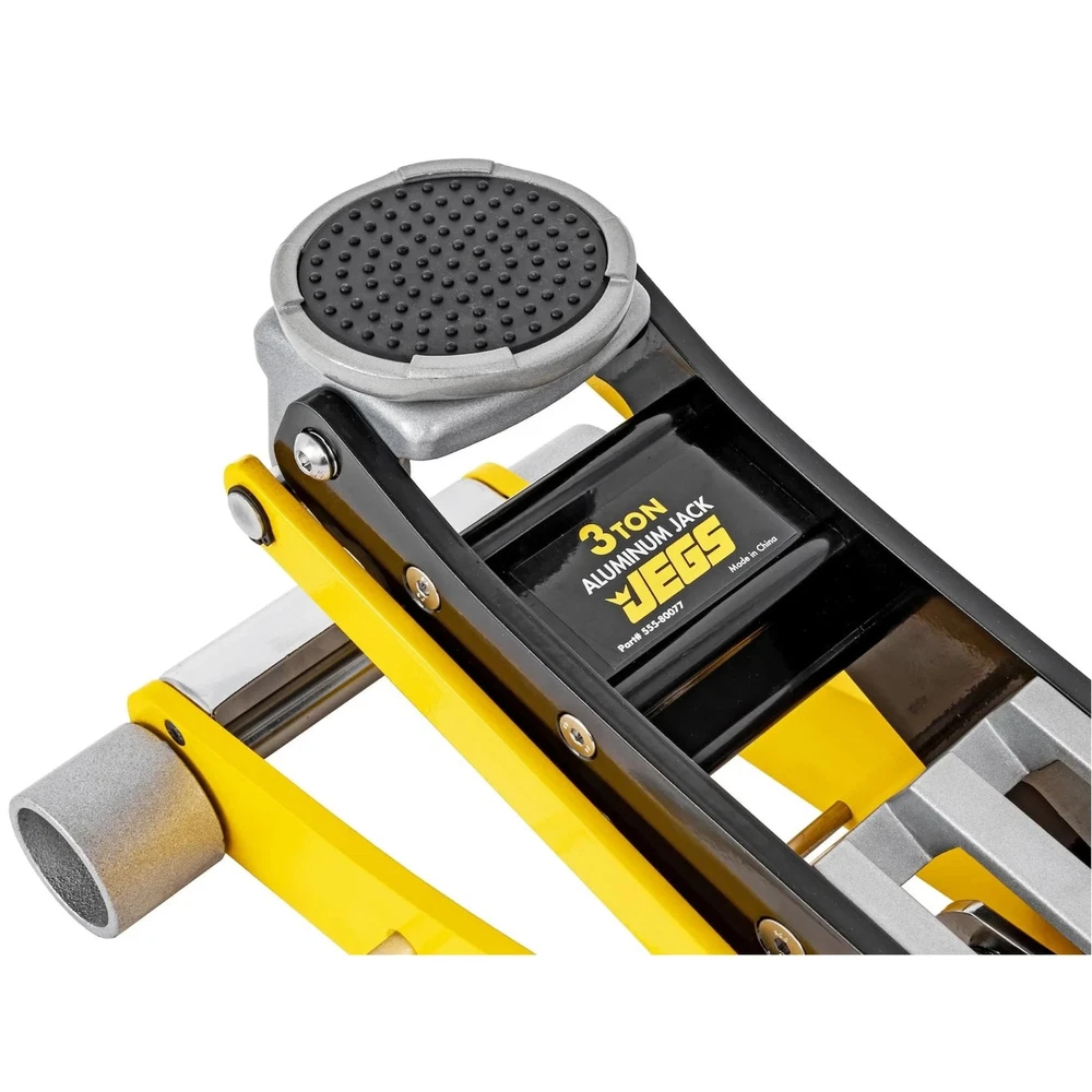 3-Ton Aluminum Floor Jack JEGS 555-80077 3-Ton Aluminum Floor Jack Features: Aluminum construction Lightweight The saddle rotates 360 degree Minimum Saddle Height: 3 7/8 in. (good for low-clearance vehicles) Maximum Saddle Height: 19 1/2 in. 45 3/8 in. two-piece handle with sleeve (protects vehicle during use) Knurled grip reduces slippage Dual side handles simplify maneuvering/positioning Hydraulic Lift: 15 5/8 in. Rubber lift pad prevents marring Chassis Length: 25 1/2 in. Chassis Width: 13 in. Seals protect the hydraulic system from contaminants Overload & bypass valves prevent the jack from being used beyond its rated capacity Specifications: Part Type Jack Product Line Professional Low Profile Floor Jacks Jack Capacity 3-ton Jack Color Yellow Jack Material Aluminum Jack Type Floor Maximum Lift Height 19.50 in. Minimum Lift Height 3.875 in. Overload Protection Yes Package Depth 8.00 Package Height 32.00 Package Width 16.00 Part Category Accessories Part Fitment Universal Shipping Weight 67.00 Weight Capacity Per Jack Stand Sold Individually