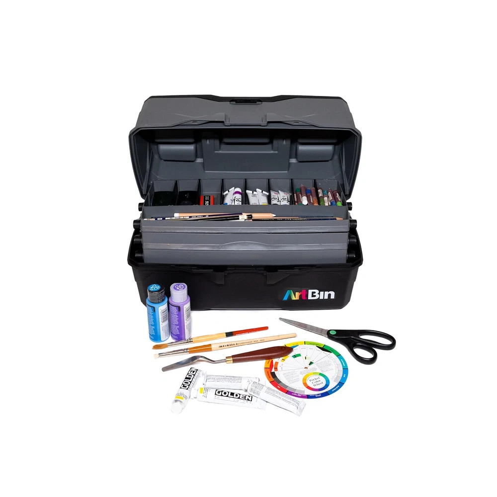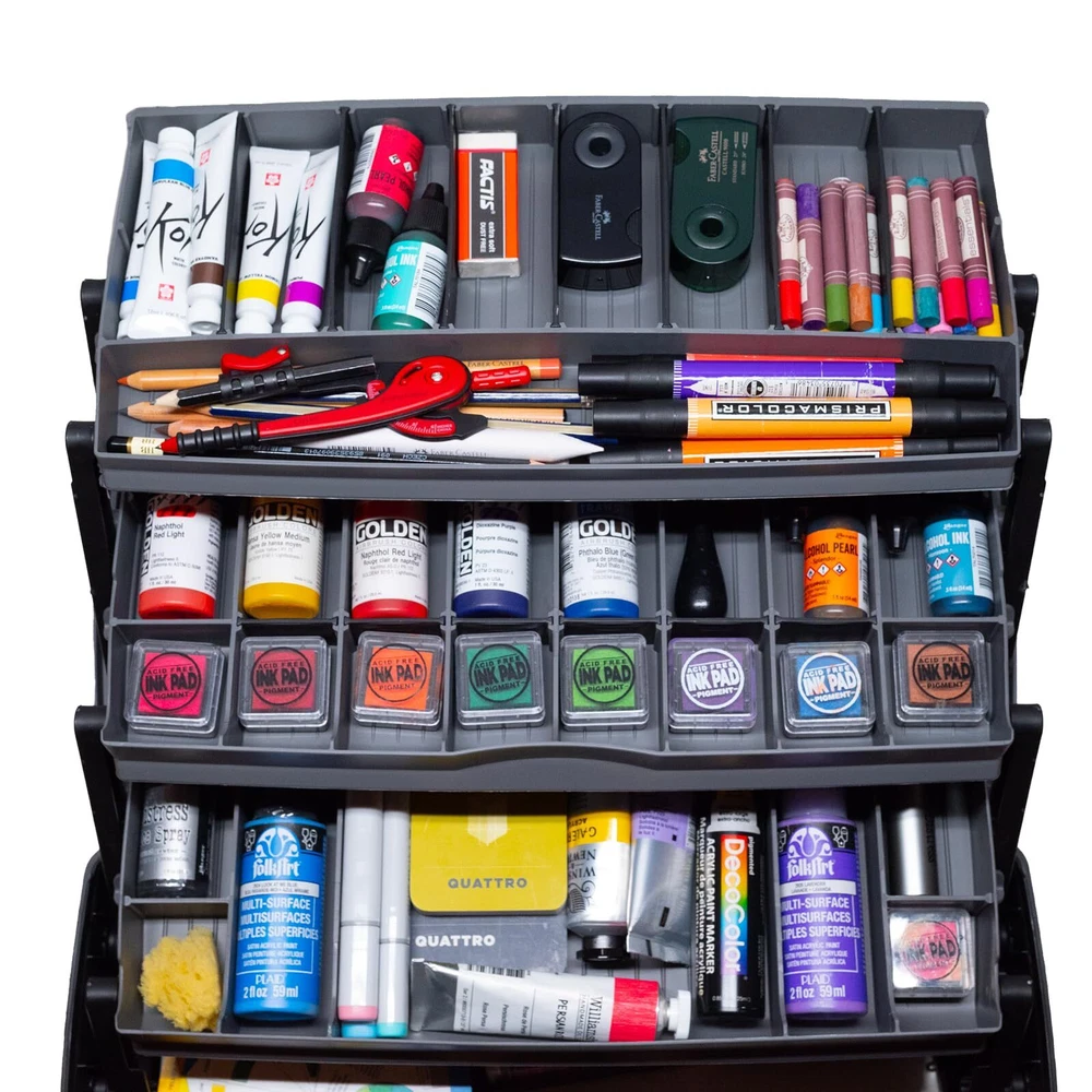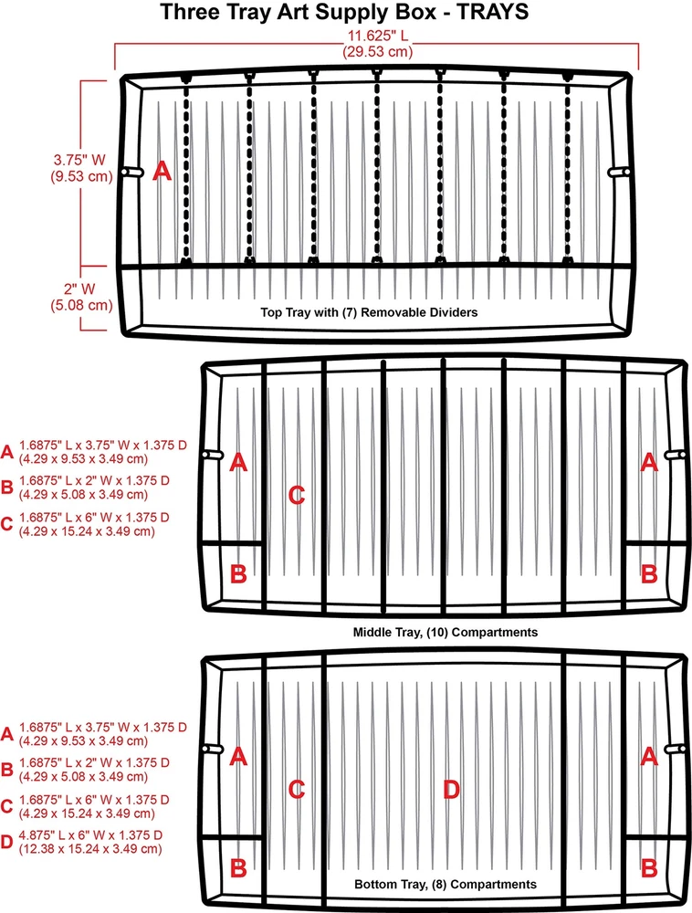 Introducing the 3 Tray Art Supply Box, an essential storage solution designed for art enthusiasts, students, and professionals alike. This functional supply box is tailored to organize and protect your valuable art tools, including paint brushes, pencils, and markers.Ideal for both seasoned artists and aspiring students, this art tool storage box boasts a cantilever tray with removable dividers, providing customizable compartments to accommodate various supplies. The spacious open area at the bottom of the box allows for convenient storage of bulkier art materials, ensuring you have everything you need at your fingertips.Efficiency meets accessibility with the in-lid storage area, offering quick and easy access to your essential tools. Crafted with durability in mind, this organizer is wear and tear-resistant, promising longevity even with frequent use. The tip grip tray with dividers ensures versatile storage, allowing you to tailor the space to your specific needs.The lockable latch adds an extra layer of security, keeping your art supplies safe and organized. Transporting your creative essentials is a breeze, thanks to the sturdy plastic handle that makes carrying the box effortless.Step up your art organization game with the NEW improved Three Tray Box. Featuring three cantilevered trays with removable dividers, this box provides enhanced storage options. The top tray is specifically designed for longer items such as paint brushes, pencils, and markers. The large open area at the bottom of the box remains perfect for storing bulkier supplies, catering to the diverse needs of both professional artists and art students alike.Elevate your artistic experience with the Tray Art Supply Box – the epitome of functionality, durability, and organization. Secure your creative essentials with this thoughtfully designed storage solution and enjoy the convenience of having everything you need right at your fingertips. Experience the perfect blend of practicality and versatility with the Tray Art Supply Box. Art Supply Storage Solution: 3 tray supply box for organizing various arts and crafts supplies, including paint brushes, markers, paints, stamps, glues, and more. Versatile and Accessible Design: Quick access in-lid storage for smaller items, spacious open area at the bottom for bulkier supplies like paint bottles, stamp pads, scissors, glues, and vinyl rolls. Durable Construction: Made from tough, wear-resistant hard plastic. Tip guard trays prevent liquid spills from art and craft supplies. Secure Closure and Convenient Transport: 3-Tray Art Supply Box with lockable latch for secure content storage. Sturdy plastic handle for easy and convenient transport. Wide-opening lid for effortless access to all your supplies. Product Specifications: 3 Tray Art Supply Box dimensions - 14.5 x 8 x 7 inches. Features 3 top trays with removable dividers.