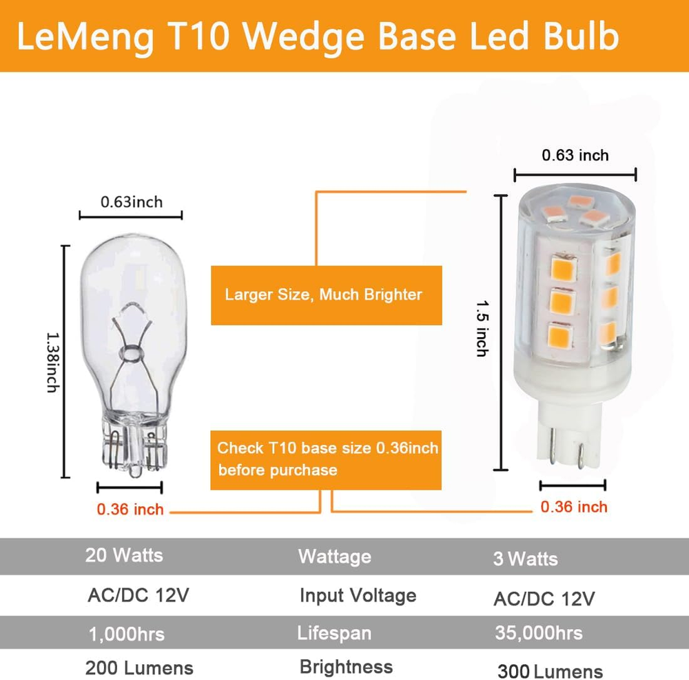Bulb Base: Wedge Shade Material: Plastic Incandescent Equivalent Wattage: 30 Watts Light Type: LED Shape: T10 Bulb gtin13: 7445047835872 White Brightness: 300 Lumens Average Life: 30000 Hours Item model number: LM-12VT10W-5W Type: Does not apply Power Consumption: 3 Watts Brand: LEMENG Color Temperature: 2700 Kelvin Manufacturer: LEMENG UPC: 7445047835872 Connectivity Technology: Normal bulb Brightness: 300 Lumen Light Source Wattage: 3 Watts Part Number: LM-12VT10W-3W Power Source: AC/DC 12V Material: Ceramic Clear plastic cover Color: 3watt T10 Base Special Feature: function(f) {var _np=(window.P._namespace("DetailPageProductOverv Number of Items: 1 Style: Modern Color Rendering Index: 83 Batteries Required?: No Unit Count: 6 Count Voltage: 12 Volts Light Color: Warm White Item Package Quantity: 6 Controller Type: Push Button Special Features: Work for both AC10-18V / DC 10-24V, 2700K warm white, 3W 300lm fo Specific Uses For Product: T5 T10 wedge base LED bulb for outdoor landscape garden yard pati Indoor/Outdoor Usage: Outdoor, Indoor Product Dimensions: 0.63"W x 1.5"H Wattage: 10 watts Bulb Shape Size: T3 Light Source Type: LED Item Weight: 2.46 ounces Light Direction: Up/Down Light Beam Angle: 360 Degrees Control Method: App