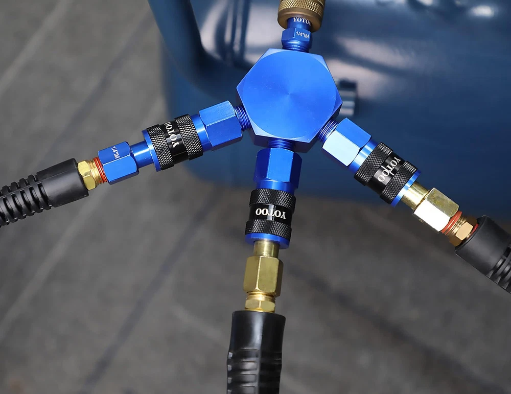 3 WAY AIR MANIFOLD: This air manifold has 3 outlets which allows to operate 3 different air tools at the same time. Meets requirements of only one air line inlet but need multi outlets. LIGHTWEIGHT DESIGN: The Quick Couplers, plug and hex flat manifold body are made of hgih quality aluminum. The lightweight design avoids to damage the air line because of heavy parts. UNIVERSAL QUICK COUPLERS: The universal Coupler connect to 1/4" industrial, automotive, and ARO plugs. Just push plugs to coupler, ONE HAND operation. Six balls design for connecting air fittings securaly and NO LEAKING. EASY TO USE: The quick connect couplers and plugs make it fast and easy to connect and disconnect air compressor or air tool fittings. WARRANTY&SUPPORT: ONE YEAR warranty. Any problem, please feel free to contact us.