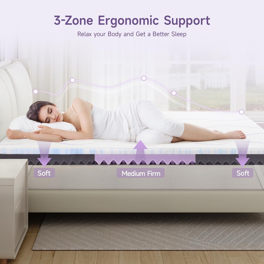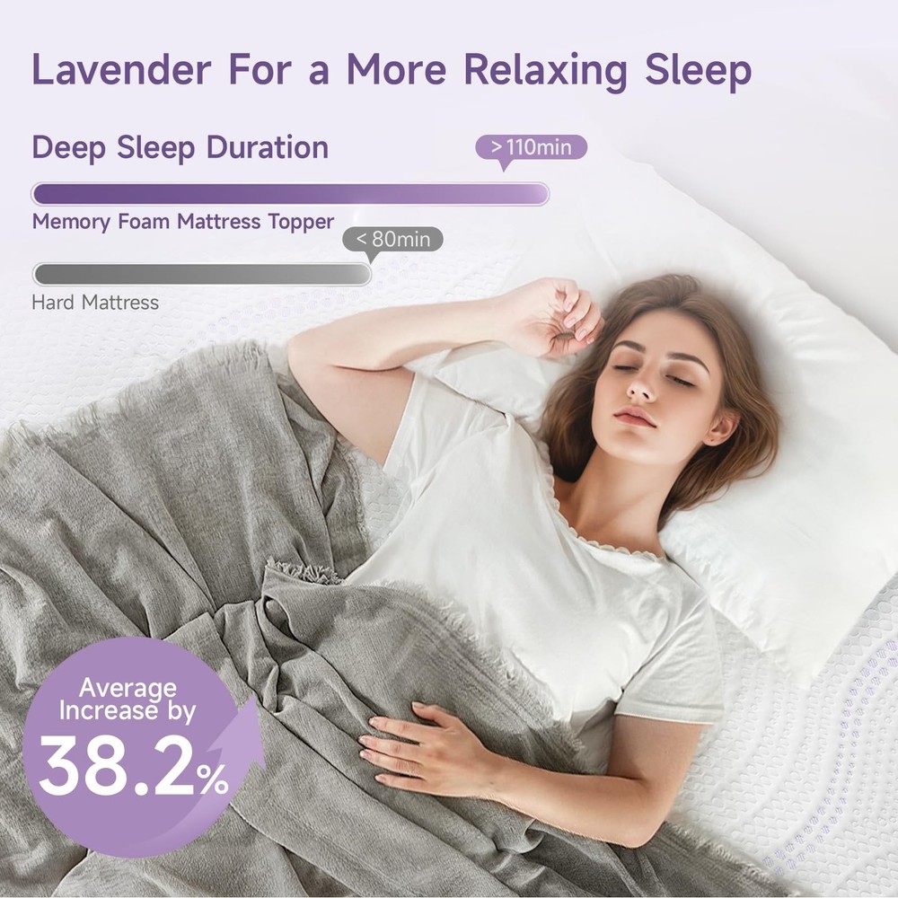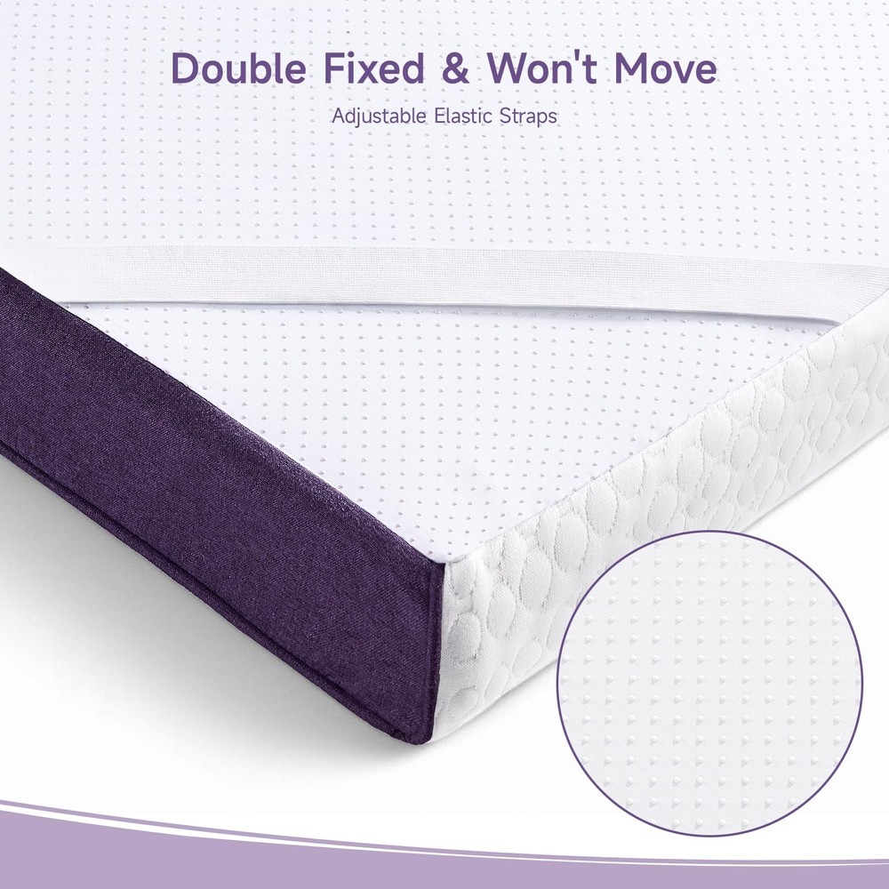 Dimensions: 80"L x 76"W x 3"H. Before first use, please lay the topper flat in a ventilated area for 48-72 hours until it is fully expanded. Low temperature may need more time Dimensions: 75"L x 54"W x 3"H. Before first use, please lay the topper flat in a ventilated area for 48-72 hours until it is fully expanded. Low temperature may need more time 3-Zone Directional Support: According to the curvature of the human spine, the memory foam mattress pad is divided into 3 zones: the two ends of the foam are slightly soft to gently support the shoulders and hips, and the middle is firmer to give sufficient support to the lumbar and back Luxurious Lavender Fabric: 's upgraded mattress padding is made of high-end lavender fabric, which is not only skin-friendly and soft, but also relaxing. The cover is removable for machine washing Dual-layer Egg-shaped Memory Foam: The top layer of memory foam infused with cooling gel, which can slowly rebound to better fit your body and keep you cool and refreshed all night long; the second layer is composed of egg-shaped bamboo charcoal sponge and lavender sponge, which not only provides support but also dissipates the heat better and relaxes your body Non-Slip Bottom & Four Elastic Straps: The bottom fabric is made of non-slip fabric to increase friction, plus four elastic straps to keep the mattress in place, you won't have to adjust the mattress frequently the next day Certified Mattress Topper: Our memory foam mattresses not only have the CertiPUR-US certificate (which measures odor, material, performance, and durability) but also the rigorous certification from OEKO-TEX