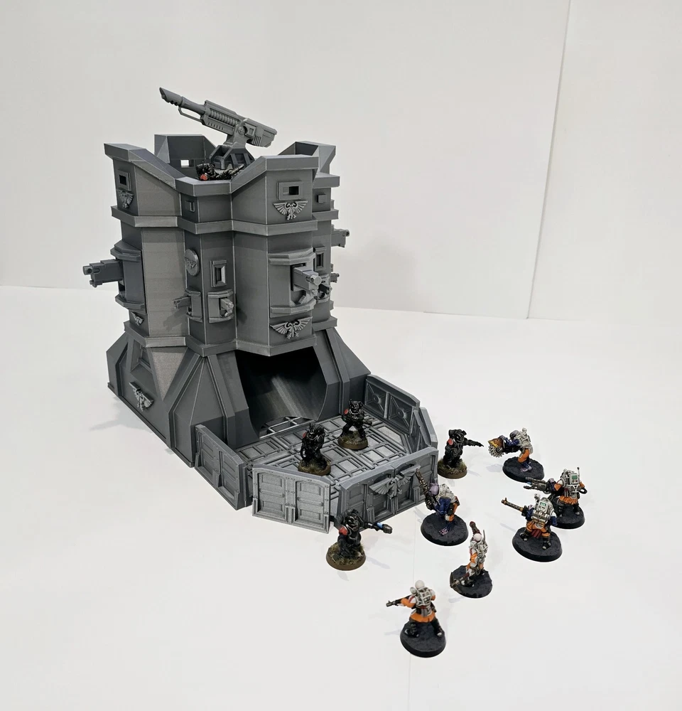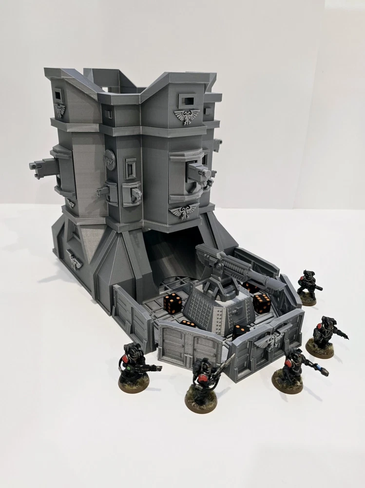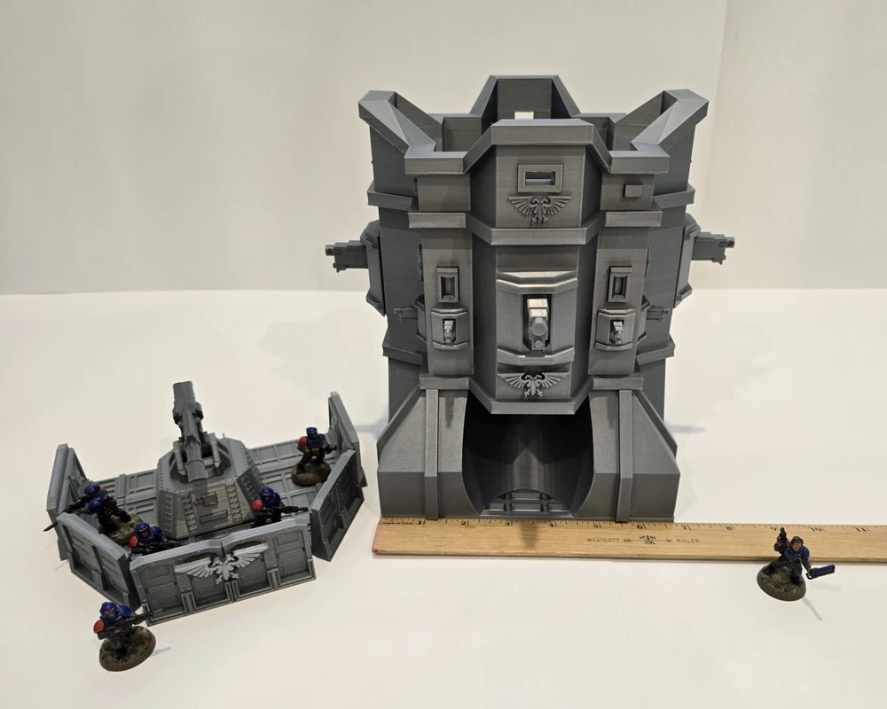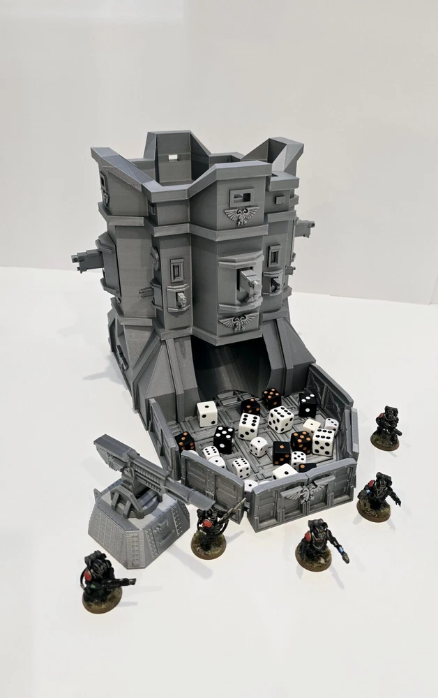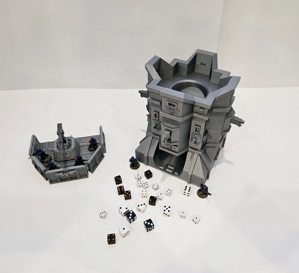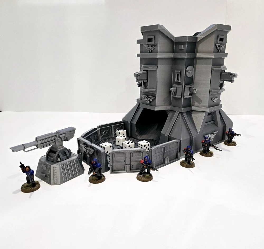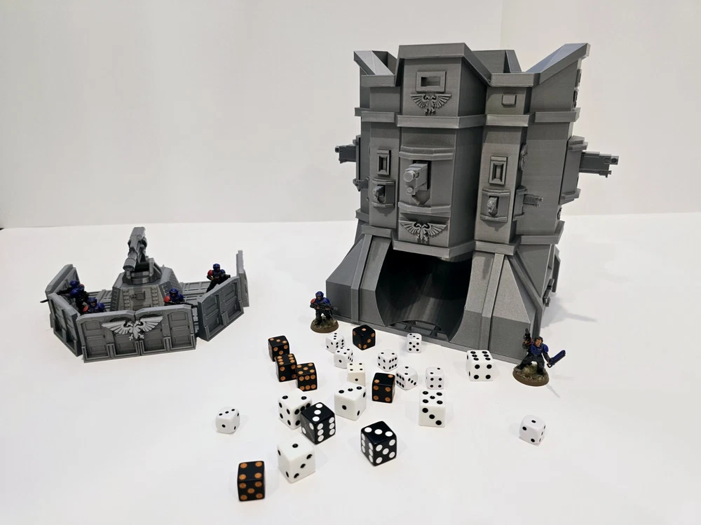 3d Printed Imperial Fortress / Bastion Proxy Dice Tower. 28mm Wargamming Dice Tower. Condition is New. May be printed in either gray or silver aluminum PLA plastic Includes: Imperial Dice Tower This item is a mutilpurpose terrain piece. Not only is it a great looking terrain piece for your tabletop games, it also can serve as a dice tower to roll your dice into without having to worry about them rolling all over the table, knocking over your miniatures, or getting lost under other terrain. It's also very large, measuring almost 9" tall, 7" wide, and 12" long (when tray is connected) and 7" long (when tray is not connected) so it can serve as a centerpiece or objective on the table for your armies to battle over. 3D printed in high-quality PLA plastic. Ready to paint. Disclaimer: Miniatures, Dice, and Ruler in photos are for scale only and are not included. May be printed in either gray or silver aluminum PLA plastic. The piece can be painted with a variety of materials to create great looking terrain fixtures or can be played as is. Wargaming Terrain Scenery D & D D and D Dungeons and Dragons Alien Terrain 28mm Star Wars Legion This item is 3D printed using PLA plastic. The 3D printing process consists of a machine producing layers of melted plastic to create the item. Due to the layering process, lines and minor defects may be noticed. We upload as many pictures as possible to show the lines and imperfections so the buyer is aware of the item's appearance.