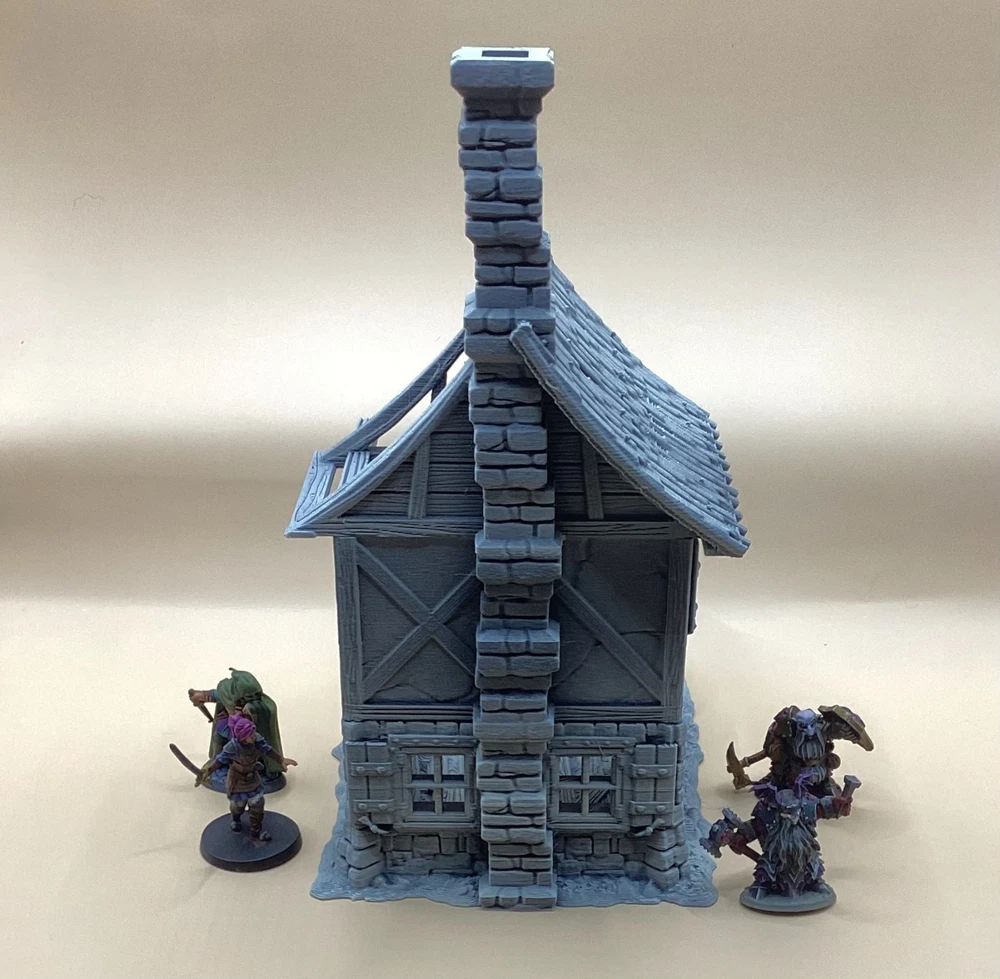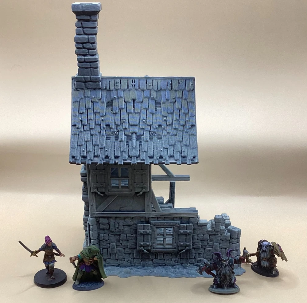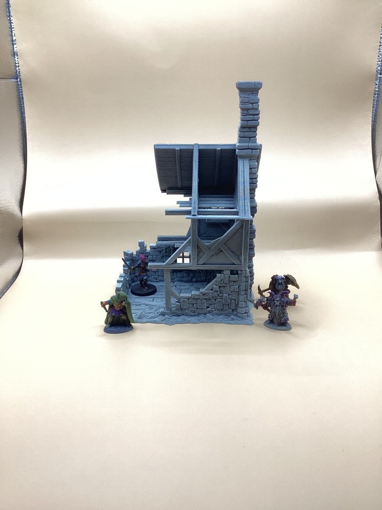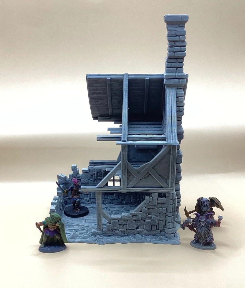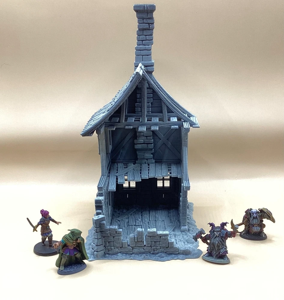 Note: Set is delivered unpainted in Grey or Black PLA. Pictures shown in listing that are painted are only for demonstration purposes. If you have any questions regarding assembly of this item, please message me for additional detail. Minis for reference are 28mm scale. This 3d printed ruined house is perfect for tabletop roleplaying games and scenery. It's a great addition to any miniature or war game collection. The intricate details and high-quality printing make it a must-have for any fantasy enthusiast. The house is ideal for creating a unique and exciting atmosphere for your games whether in a spooky horror setting, an abandoned village, or one that's under attack. This tower covers 3 floors, comes in 3 pieces and we have variants for28mm and 32mm miniatures. Returns are accepted if the item does not match the listing description or is not accurate as advertised. If you have any questions or concerns please contact me. Accreditation Designer: 3dpforU Check them out on myminifactory. https://www.myminifactory.com/users/3dpforu I am a licensed printer of 3dpforU