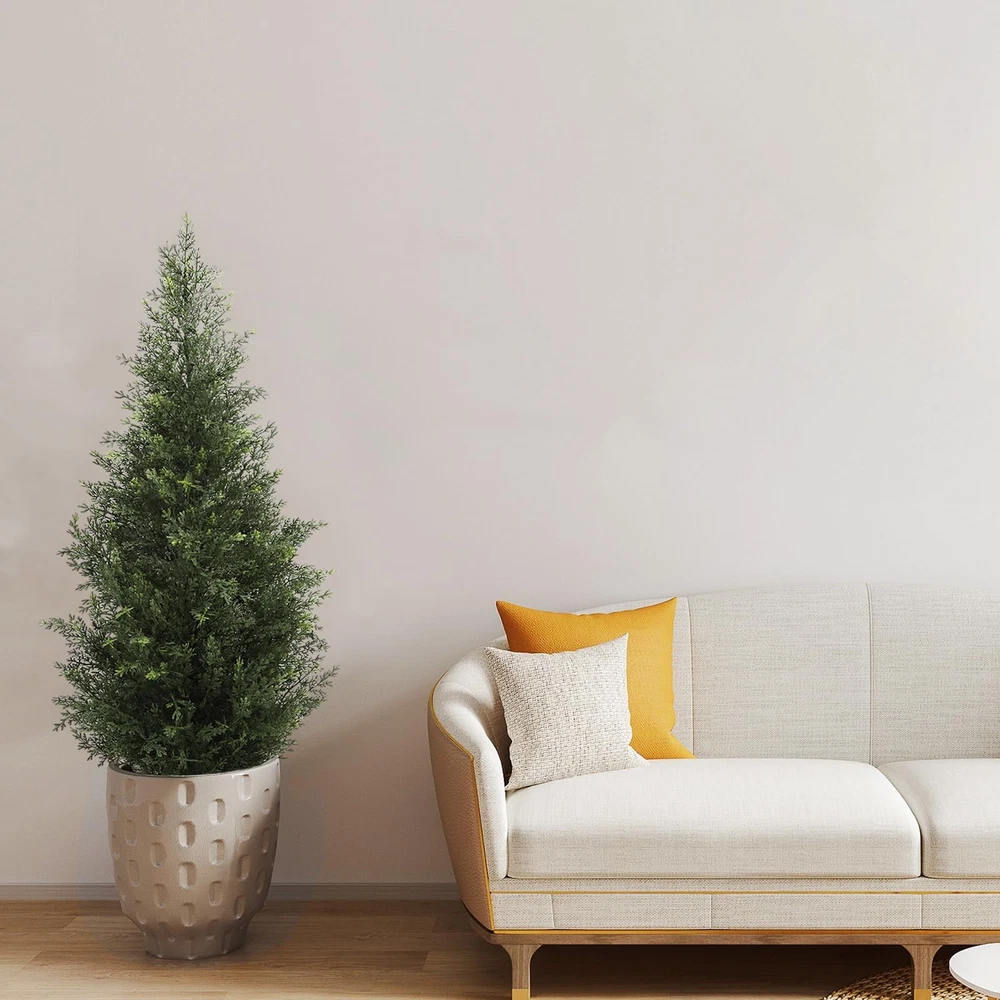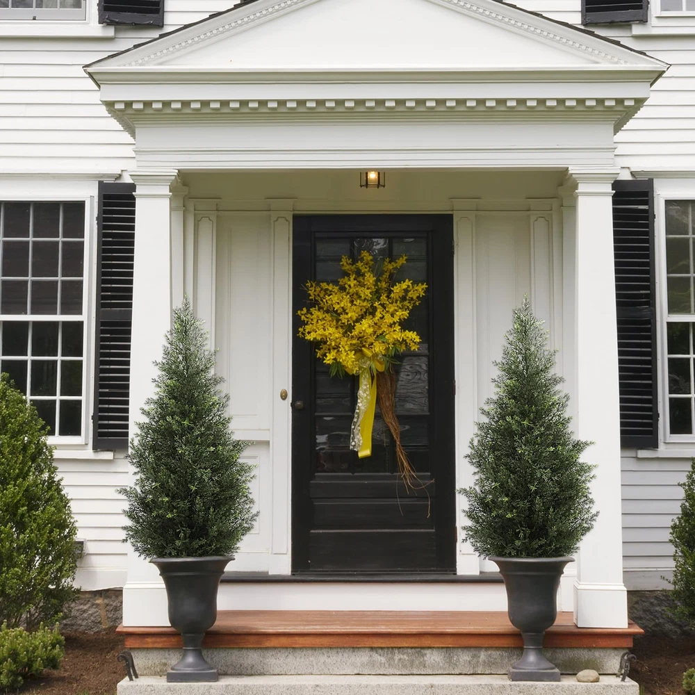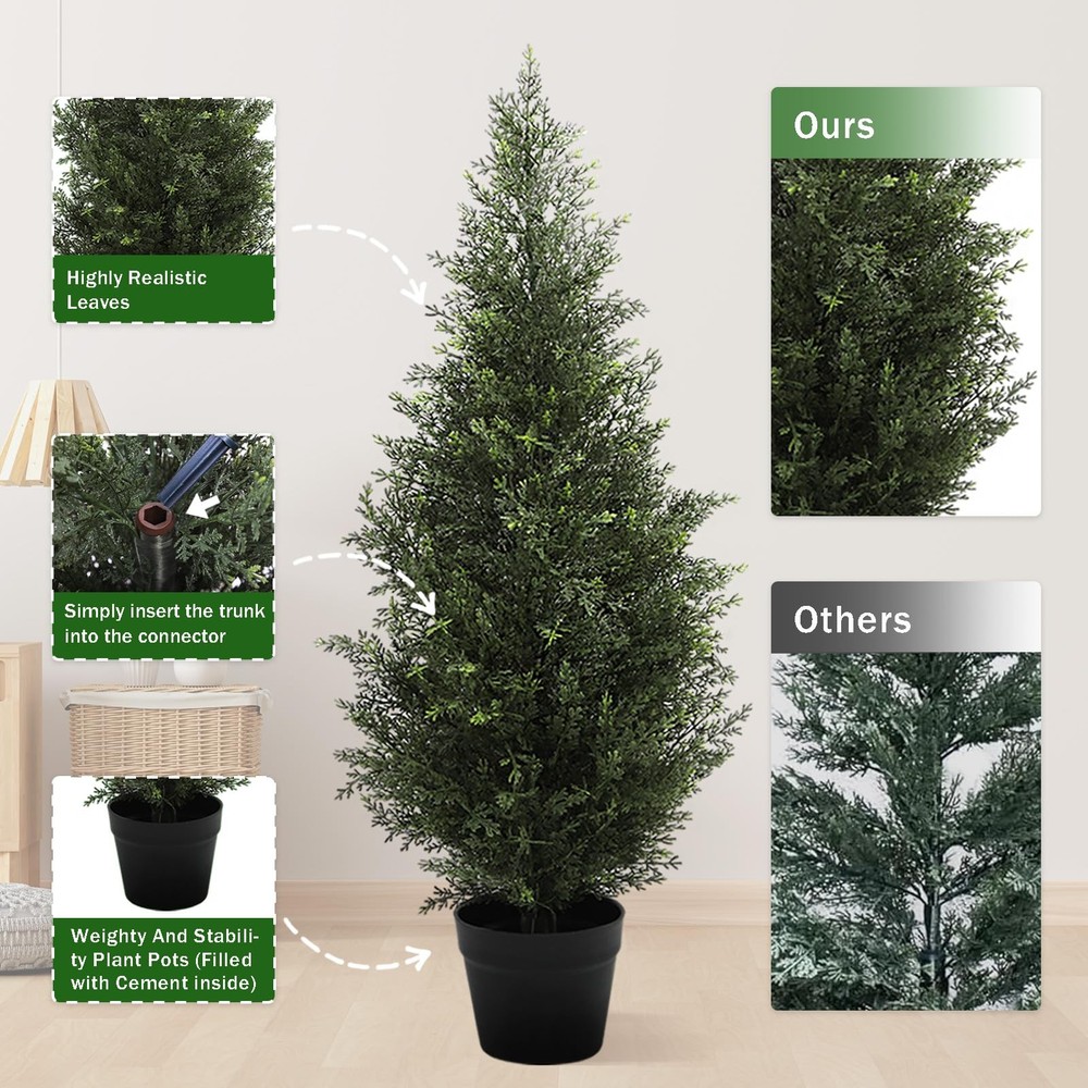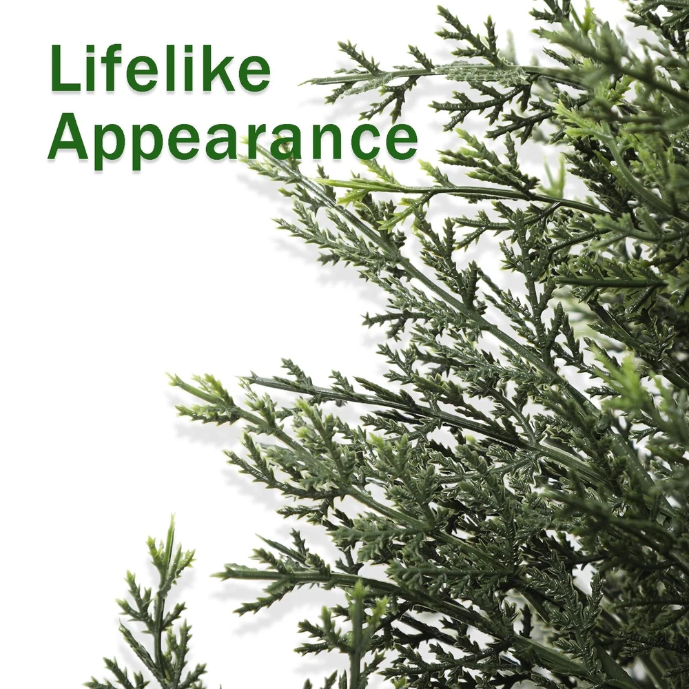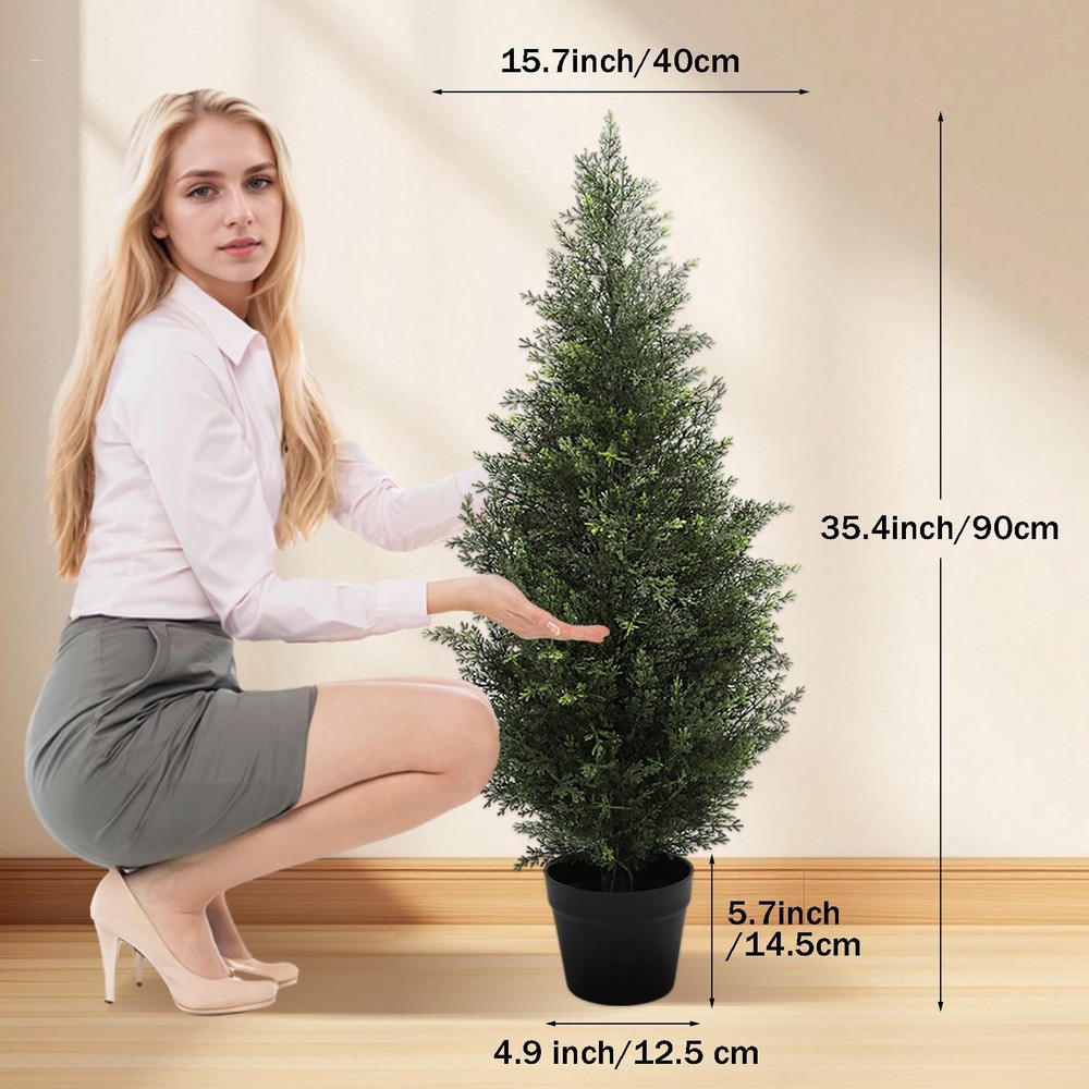 Transform your outdoor space with these stunning 3-foot or 4-foot artificial cedar topiary trees. This set of 2 potted cypress trees brings the timeless elegance of manicured landscaping without the maintenance. Each tree features meticulously detailed, UV-resistant foliage that maintains its rich green color throughout the seasons. The classic conical shape and dense branch arrangement create a sophisticated silhouette perfect for framing entrances, enhancing porches, or adding structure to garden designs. Arriving in sturdy black planters, these versatile decorative trees can be used straight away or transferred to decorative containers of your choice. Their realistic appearance and durable construction make them ideal for both indoor and outdoor use, offering year-round greenery without watering or pruning. At 3 feet or 4 feet tall, these topiaries provide the perfect scale for entryways, patios, or as accent pieces in your landscape design. ALL-WEATHER UV PROTECTION OUTDOOR TOPIARY TREES: Engineered with premium UV-resistant foliage that withstands intense sun exposure & heavy rainfall while maintaining true evergreen coloration. Perfect for permanent outdoor display on patios, porches, or garden landscapes without fading concerns ULTRA-REALISTIC ARTIFICIAL CEDAR TREES: Realistic textured cedar foliage and natural green coloring creates a convincing evergreen look; Two height options (3 ft and 4 ft) for versatile indoor/outdoor display coordination MULTI-FUNCTIONAL DECOR FOR EVERY SPACE: Creates effective visual barrier when placed in pairs; Use as windbreak partitions for pool areas, driveway border markers, or commercial property accents. Ideal for enhancing porches, front doors, gardens, patios, or indoor spaces with maintenance-free greenery, whether it is for home, office, commercial space, or holiday decorations, this cedar tree can easily create a different atmosphere and style ZERO MAINTENANCE ARTIFICIAL CEDAR TOPIARY TREES: Bring the beauty of nature into your space without the hassle of maintaining traditional plants. Special updated coating on the leaves helps maintain color and prevents fading when placed in outdoor settings. The premium construction makes them resistant to fading and weather damage. Perfect alternative for high-traffic commercial spaces or busy homeowners MULTI-LOCATION READY USE: Pre-potted in weighted planters for immediate placement stability, these topiary trees require no assembly and can be placed immediately for instant decoration. Weighted bases prevent tipping in windy conditions; Compatible with various outdoor surfaces (concrete deck gravel); Neutral planter complements modern and traditional decor schemes