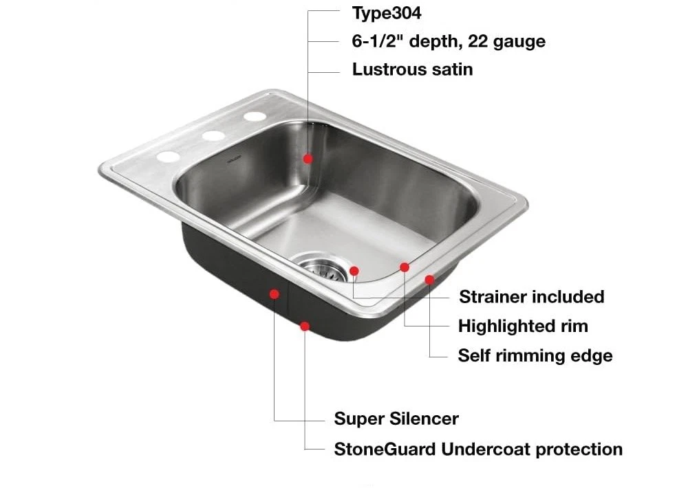 Colador de barra de 3 orificios de acero inoxidable con montaje superior, NEW US DURADERO: Este fregadero está fabricado con acero inoxidable T-304 de primera calidad y calibre 22, lo que garantiza su resistencia al agua, los alimentos y los productos químicos. ACCESORIOS INCLUIDOS: Colador de cesta (190-9180). COMPATIBILIDAD CON MUEBLES: Diseñado por expertos para integrarse fácilmente en un armario de 53 cm, lo que garantiza un ajuste perfecto a la distribución de su cocina o bar. FÁCIL DE INSTALAR: Incluye tornillos e instrucciones para una fácil instalación. REDUCCIÓN DE RUIDO: La almohadilla Super-Silencer minimiza el ruido en la zona del bar. DISEÑO ELEGANTE: Con un acabado satinado brillante y un borde resaltado, añade un toque de elegancia a su bar. CONVENIENCIA: Cuenta con una abertura de drenaje de 8,9 cm, lo que garantiza un drenaje eficiente del agua para su fregadero.