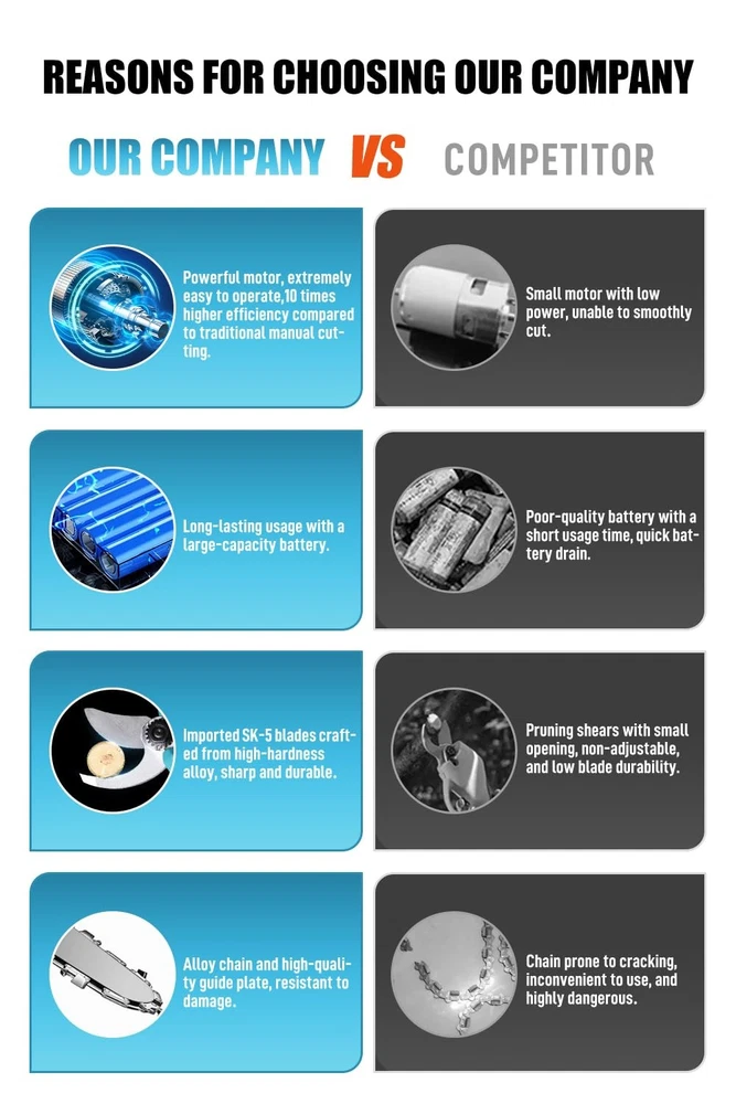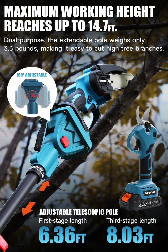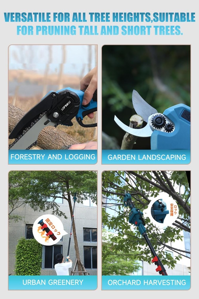 Electric Pruner Kit, 3-in-1, Max 8 ft Reach, 2x 21V Batteries, 6-inch Cordless Chainsaw & Electric Pruning Shears with Extension Pole, SK5 Blades – Ideal for Yard Work & Tree Trimming 【All-in-One Electric Pruner Kit for Homeowners & Gardeners】 Designed for yard work, garden trimming, and DIY landscaping, this 3-in-1 electric pruner kit includes a 6-inch cordless chainsaw, electric pruning shears, and an 8ft adjustable extension pole, perfect for seasonal tree pruning. The stylish blue color adds a pop to your tool set, making it both practical and attractive for home users. 【Powerful Brush & Brushless Motors for Efficient Cutting】 Equipped with a pure copper brushed motor (chainsaw) and a high-efficiency brushless motor (shears), this pruner kit delivers smooth, consistent power. Suitable for cutting thick branches and trimming shrubs, it’s ideal for spring and autumn cleanup in residential yards or small orchards. The SK5 steel blades ensure long-lasting sharpness. 【2×21V Rechargeable Batteries for Extended Use Outdoors】 With two 21V lithium-ion batteries, this kit provides extended runtime to complete larger pruning projects without interruption. Whether you’re maintaining tall hedges or cutting limbs in your backyard, this cordless design supports portable, cable-free operation during any season. 【Safe Design for High-Reach Tree Cutting Tasks】 Built with safety and stability in mind, the kit features a dual-lock trigger to prevent accidental starts and a secure rivet-lock extension pole for reaching up to 8 feet high. Ideal for older users or small-statured gardeners, the lightweight design and compact size make pruning safer and easier—no ladder needed. 【Complete Kit & Responsive Customer Support】 This blue pruning kit includes all essentials: chainsaw, shears, extension pole, 2 batteries, charger, and blades. Ideal for gifting to garden lovers or DIY users. If you have questions, contact us anytime via Amazon—our team is ready to offer prompt, professional service within 24 hours.