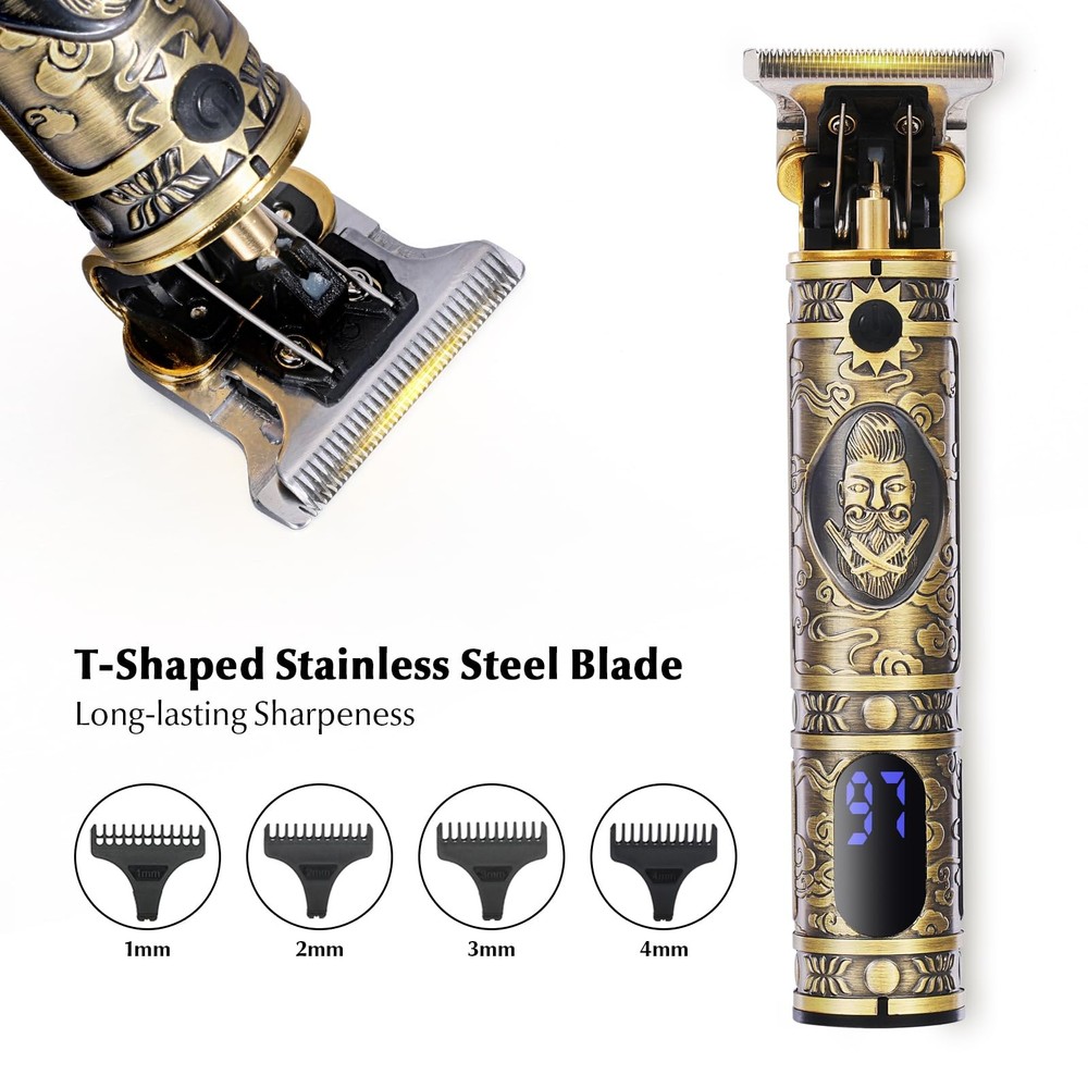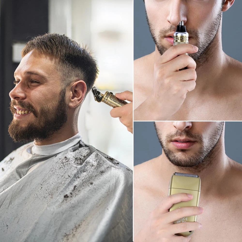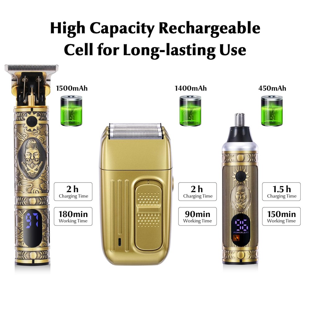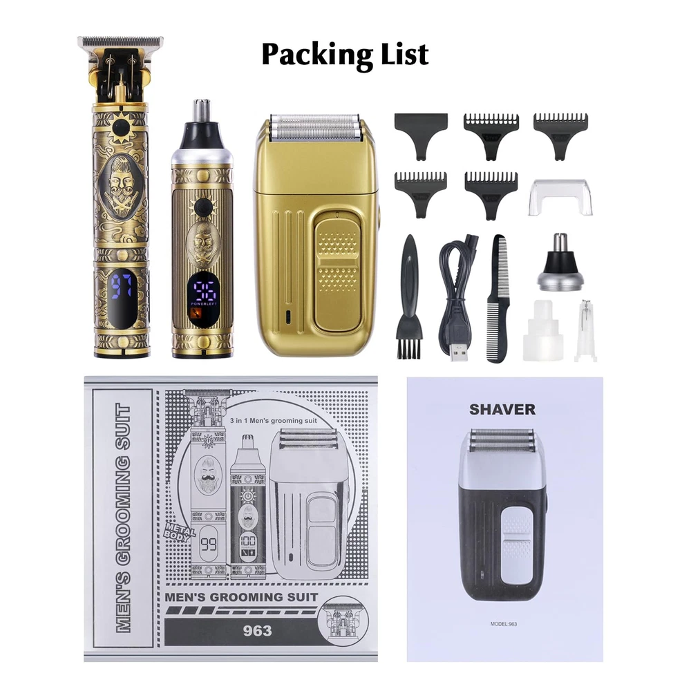 Features: LCD display for cell volume, energy prompt, high clear display. Including 1mm, 2mm, 3mm, 4mm guide combs and a cleaning brush, you can precisely trim hair and get the hairstyle you want easily. Refined steel cutting h ead, ergonomic handheld design, fit your hand, comfortable to use. Comes with USB c-harging port design, flexible to be charged and built-in high capacity rechargeable cell for long-lasting use. Nice for hair salon and for the old and the young baby to get modern haircut at home. Specifications: Color: Gold Size of Guide Comb: 1mm, 2mm, 3mm, 4mm Power voltage: 100-240v / haircutter 10w, shaver 5w, nasal trimmer 5w. Battery capacity: 1500/1400/450mAh (hairdresser/ shaver/ nose hair) Hair cutter: 2 hours charge, 180 minutes use Shaver: 2 hours charge, 90 minutes use Nose hair cutter: 1.5 hours charge, 150 minutes use Package List: 1 * Hair cutters 1 * Razor 1 * Nose hair remover 3 * USB cable 1 * Comb 2 * Head protection cover 2 * Cleaning brush 1 * Nose hair cutter head 4 * Limit comb(1/2/3/4mm) 【Professional Hair Clipper and Trimmer Set 】Our professional barber clippers kit includes: a cordless hair clipper equipped with 4 guide combs (1/2/3/4mm), a beard trimmer and a nose hair trimmer, 2 head protection covers, 2 cleaning brush, 3 USB charging cables, a nose hair cutter head and a barber's comb. 【Sharp T-Shaped Stainless Steel Blade】Ergonomic handheld design with a refined steel cutting head for comfortable and precise trimming. Both hair clipper and beard trimmer is equipped with precision stainless steel blade to ensure that you do not pull your hair or beard, so you can easily and safely trim your hair. The blade is resistant to corrosion and wear, perfect for wet and dry hair. 【USB Rechargeable & Digital Display】Convenient USB charging port and long-lasting rechargeable battery for flexible and reliable use. High-quality LCD display for clear and easy-to-read cell volume and energy prompts. 【Home & Professional Use】Versatile trimming options with 1mm, 2mm, 3mm, and 4mm guide combs and a cleaning brush included. This hair cutting kit is suitable for all ages and perfect for both professional hair salons and at-home haircuts. 【Exquisite Appearance & After-Sales Service 】The embossed design and delicate pattern make the cordless hair clipper unique, and ergonomic design is very comfortable to hold and easy to use. Please contact us if you have any questions or issues so that we can address any concerns you may have.