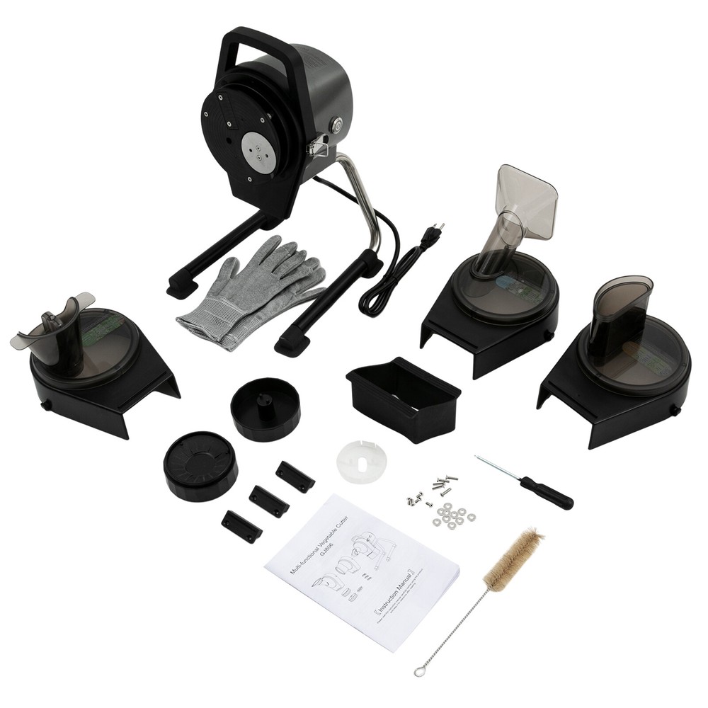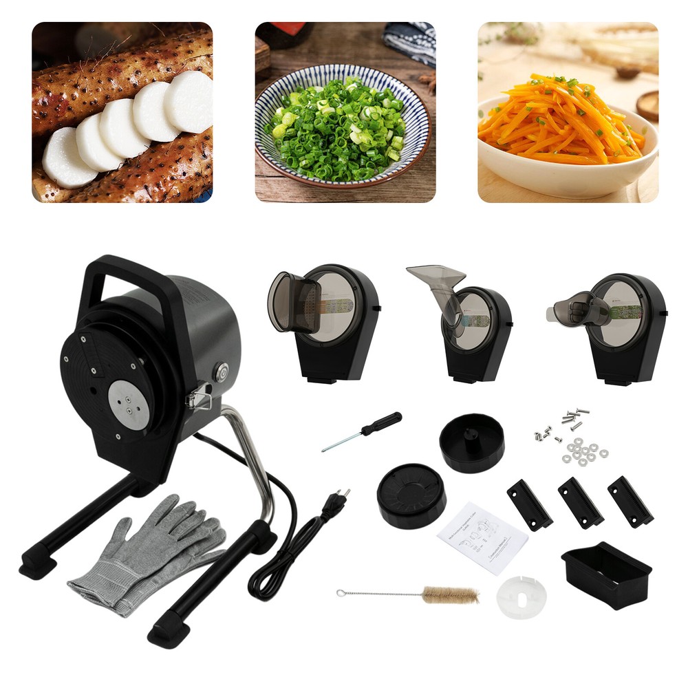 Description Are you still worried about needing to chop a lot of ingredients? When it comes to chopping a lot of vegetables, you can easily get overwhelmed and struggling. This food processor will free your hands by allowing you to successfully prepare vegetables in minutes. Its multi-function can easily dice, slice and shred fruits and vegetables to meet your different needs. It is simple to use and easy to disassemble and clean. With it, you can enjoy a more convenient life! Application This product can be used on many occasions, like in restaurants, cafeterias, hotels, and fruit shops. It is used for making potatoes, radish, cucumber, onion, pumpkin, watermelon, cantaloupe, papaya, cucumber, apple, diced ham slicing, and so on. Specifications Material: Die-cast Aluminum, Stainless Steel, PPS Color: Black Style: Modern Assembly Required: Yes Mount Type: Tabletop Operation Mode: Semi-Automatic Recommended Uses For Product: Vegetable Motor Type: Pure Copper DC Motor Power Source: Corded Electric Plug Type: US Standard Working Hours: About 30min Voltage: 120V, 60Hz Power: 200W No-load Speed: 6000±10%RPM Power Cord Length: 1m/3.28 ft Production Efficiency: 120kg/264.55lbs/Half-Hour Dicing Range: 1-5mm/0.04-0.2in Shredding Thickness: 1mm/0.04in, 1.5mm/0.06in, 2mm/0.08in Slicing Thickness: 1-5mm/0.04-0.2in(Adjustable According to Different Ingredients) Gross Weight: 7.5kg/16.53lbs Net Weight: 6.4kg/14.11lbs Product Size: 27.5*31.6*44.3cm/10.83*12.44*17.44in Package Size: 50*38*35.5cm/19.68*14.96*13.98in Package Included 1* Food Processor 3* Feed Ports 3* Shredding Knives 1* Discharge Port 1* Knife Removal Protective Cover 1* Cleaning Brush 2* Pushers 1* English Manual 1*Pair of Gloves All Accessories for Assembly Key Features Build to Last: The product is mainly made of high-quality PPS, die-cast aluminum and stainless steel, with high strength, heat resistance, and wear resistance, and it is safe to use. Powerful Function: Three different feed ports designs for different ingredients. Blade thickness can be manually adjusted according to different ingredients (1-5mm), and the thickness of three shredding knives can be freely selected (1mm, 1.5mm, 2mm), allowing you to cut vegetables easily. High Efficiency: With 200W high power, pure copper DC motor, 6000±10%RPM no-load speed and sharp stainless steel blades, it can cut 264.55lbs ingredients in 30 minutes, allowing you to realize fast cutting vegetables or fruits. Safety Guard: It is equipped with a waterproof safety microswitch that automatically stops when the lid is opened, which ensures your safety. In addition, the cooling holes and overhanging bottom ensure good heat dissipation, which can effectively prevent the body from getting too hot, thus prolonging the service life of the product. Thoughtful Design: The knife removal protection cover protects your fingers from injury when removing and installing the blade. Cutting Assistant: With it, you can easily achieve chopping freedom and can get the ingredients you need to cook in a short time. Easy to Clean: The smooth surface and removable design allow you to easily clean it with a soft towel (not included) or the cleaning brush that comes with the product. Easy to Use: The simple structure, one-touch switch and detailed English manual make it easy and convenient for you to use this product. Even if you are new to the kitchen, you can learn easily. Practical Gift: Its excellent functionality and beautiful appearance make it an ideal gift for friends, loved ones, and family members who love to cook! Quality Service: We are honored that you have chosen our product. We have sufficient confidence in the quality of the product so that you can buy it confidently. But if you have any questions, you can contact our customer service, he will patiently answer and solve your problems. Details 4 Non-slip Suction Cups: They can improve the stability of the product in use and better care for your table. Sharpening Box Upper Cover: It contains sandpaper, which is used to sharpen the blades by rotating with the lower cover of the sharpening box. 2 Food Pushers: They tightly fit the feeding port and are not easy to fall off or lose. It can keep you away from injuries caused by accidentally touching the blade. Large Feeding & Discharge Port: The large feeding port allows you to directly put vegetables into the machine, saving pre-treatment time. The larger spout prevents food clogging and splattering and improves efficiency. Safety Snaps: The safety snaps on both sides ensure a tight cover of the lid, making the operation safer. Carrying Hand: The integrated carrying handle helps you move the product with ease. Notes Please note that sharp blades are strictly prohibited from touching any part of the body. Please read the user manual carefully before use and pay special attention to the safety matters inside. Please note that the product does not contain food. Please note that the main unit is strictly prohibited from cleaning or soaking, and other accessories are strictly prohibited from being placed in the disinfection cabinet and dishwasher. This product is not suitable for foods with a soft texture, a soft outer skin, a structure that is not compact and uniform enough, or a small volume. When cleaning, disassembling, or assembling parts, make sure the machine is powered off. After using the machine, please switch it off and unplug it from the power supply for safety. Please do not directly press the food into the feeding port by hand. Use the food pusher when pushing food to avoid safety accidents. Please be careful when changing blades. Please keep the machine out of the reach of children and pets. Please allow the slight color difference caused by the shooting light and 1-3cm error due to manual measurement, and make sure you do not mind before you order. Payment Delivery details Terms of sales About us Contact us Payment We accept ebay payment 。 Fees such as import duties, taxes are not included