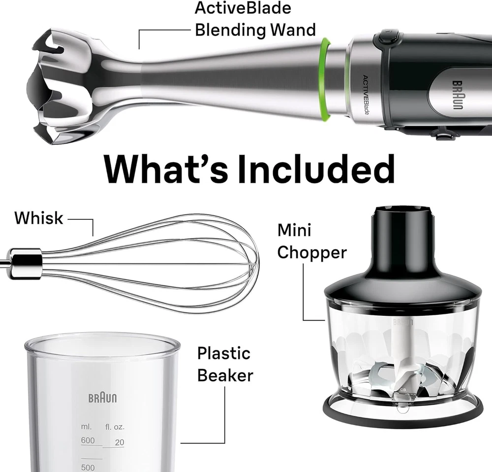 From the manufacturer Smoother Blending. Faster Results. MQ7035X The Braun MQ7035 MultiQuick Hand blender with revolutionary Easy SmartSpeed technology and 500 watts of power opens up a whole new world of cooking possibilities. With the world’s first ACTIVEBlade technology and patented PowerBell Plus system, it blends faster and finer while reducing suction and splashing. It comes with a blending beaker and the EasyClick Plus Accessory System to let you switch from the included blending wand, whisk, and 2-cup chopper. Easy SmartSpeed The world‘s first Easy SmartSpeed technology - no predefined speed settings, just follow your intuition for the results you want. Push gently for coarse and roughly chopped results and increase the push of the button for more power and finer results. SplashControl Technology Advanced SPLASHcontrol technology prevents splashing and delivers the best blending results to keep you and your kitchen clean. The MQ7 has 25%* less suction for effortless handling and perfect control. * Compared to Braun MQ500. EasyClick Plus System With the EasyClick Plus system, you can easily switch attachments as you prep. Blend, chop, whisk, mash, and puree your ingredients effortlessly. PowerBell Plus The patented PowerBell Plus features an extra milling blade provides more slices per rotation, blending large pieces and hard ingredients more easily. Included Accessories Corded Hand Blender, ActiveBlade Blending Wand, 20oz. BPA Free Beaker, Whisk, 2C Chopper & Blending Wand Top Pick: Ergonomic & Easy Use Highly recommended by America’s Test Kitchen, emphasizing its comfortable grip and well-placed trigger-style power button. Comparison Chart On Jan 14, 2026 at 23:59:39 PST, seller added the following information: