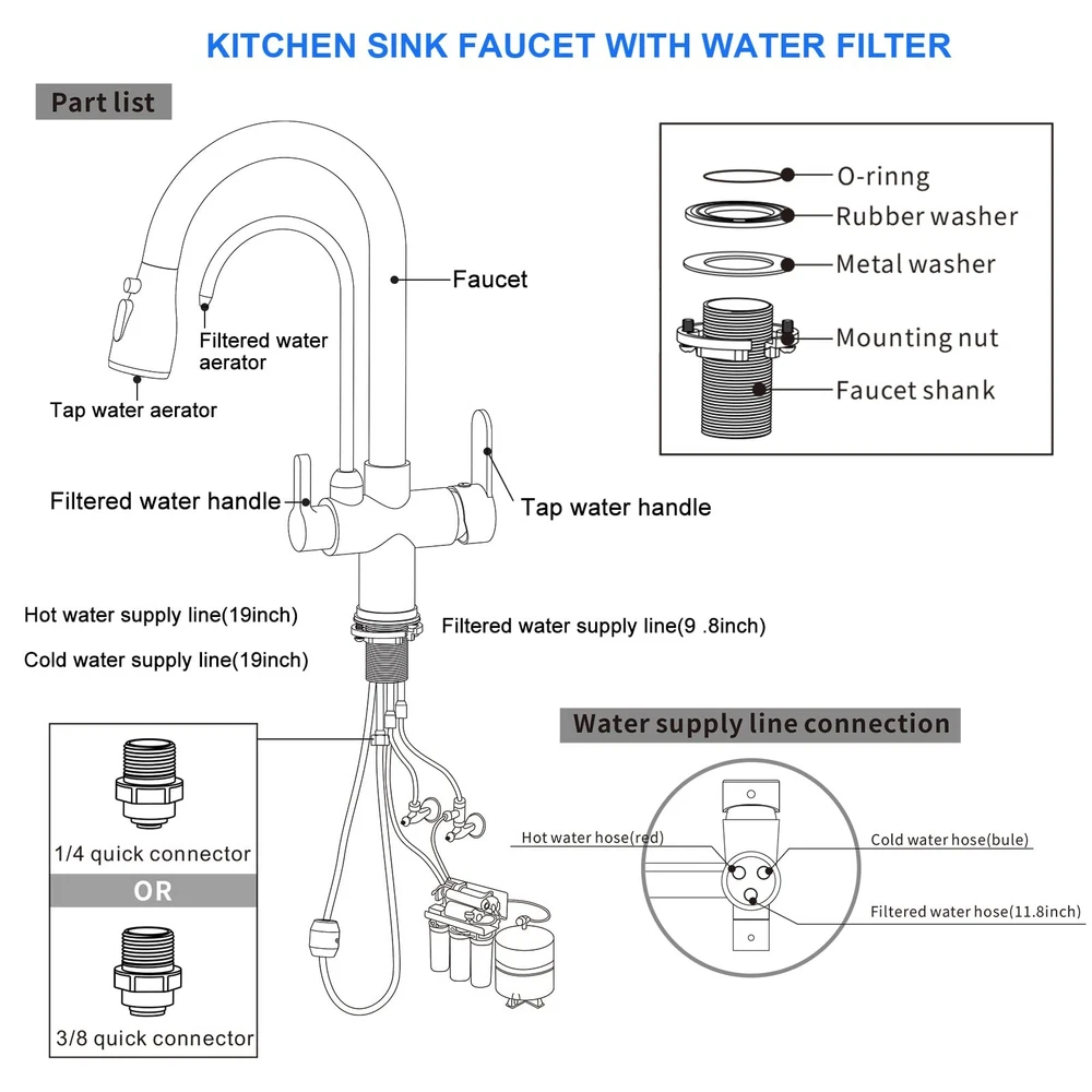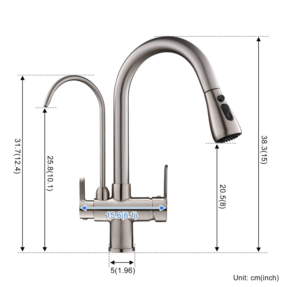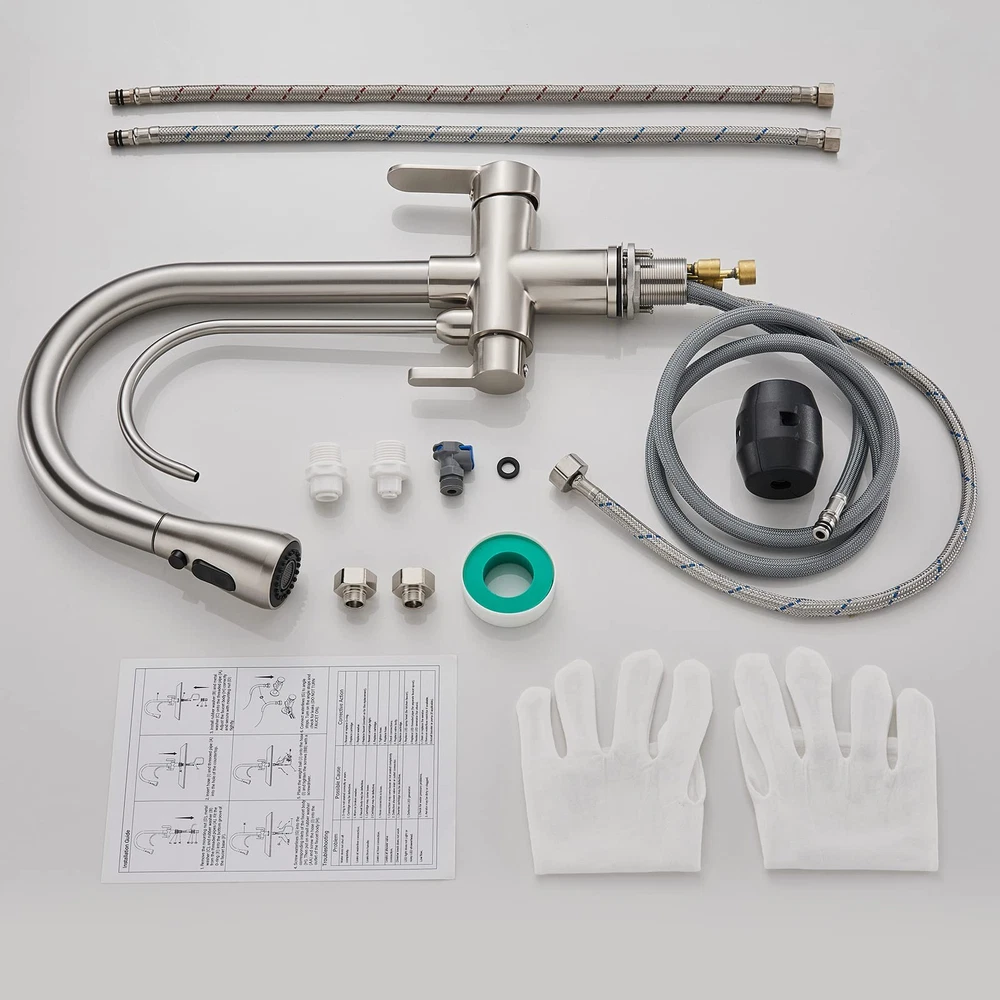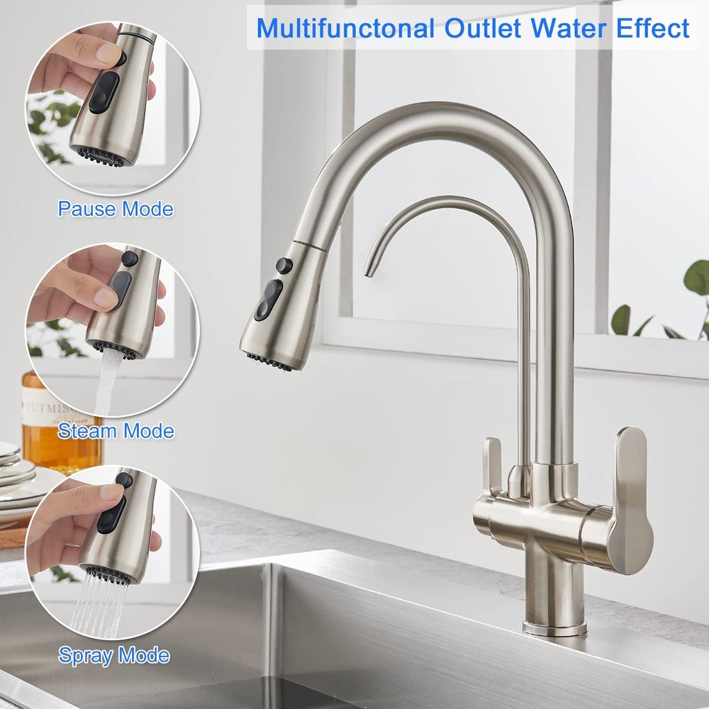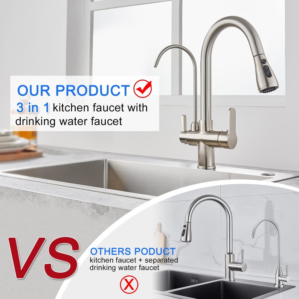 3 Way Drinking Water Commercial Spring Kitchen Faucet with 2 Function Pull Out Sprayer 3 Way Kitchen Faucet - Include Hot & Cold and RO water (under sink filtration system ) faucet function for save your space and money. The faucet has 1/4" filter water tube connection adapter for the RO reverse osmosis system. Specifications: Body Material: Brass Finish: Brushed Nickel Handle Type: Dual lever Handle Valve Type: Ceramic Valve Pull Down Sprayer Type: 2 Function(Stream/ Spray) Pulling length:18inch Water Feature: Mix Hot & Cold Faucet Water and Pure Drinking Water Installation: Single Hole Deck Mount Packing list: Kitchen sink faucet. A pair of 20 "(50 cm) cold and hot water inlet hoses. 24 " (60 cm) water purification hose. 3/8-inch & 1/4-inch filter purge hose adapters. Paper installation instructions. Install accessories. 【Reliable Durability and Stability】 The kitchen faucet with pull down sprayer made of Solid brass construction and premium ceramic valve ensure high standard durability, multiple and repeated test for structure and appearance before manufacturing ensure super stability 【3-in-1 Water Filter Faucet】3 Way kitchen faucet,include Hot & Cold and RO water (under sink filtration system ) faucet function,you can save on the cost of purchasing drinking water faucets or pull-down kitchen faucets.Water filter faucet connect to any water filtration system to eliminate heavy metals, and other contaminants for 100% purified water,for drinking, cooking, or filling water bottles 【Commercial Pull Down Design】18 inch Pull down flexible hose easy to clean the sink without blind spots and fit almost any kitchen cabinet and bar sink. Superior corrosion & rust-resistant finish prevent dirty from sticking to faucet surface 【Dual Function Sprayer】Two spray modes,3 way spray setting(STREAM,SPRAY,PAUSE),stream for filling water, spray for rinsing, pause for avoiding splashing in multitask mode 【Easy to Install】Dual Handle design kitchen faucet water filter, including 3/8'' & 1/4 "quick connectors, easily connect to your reverse osmosis system. The right handle for controlling the kitchen faucet sprayer, the left handle for controlling the drinking water faucet
