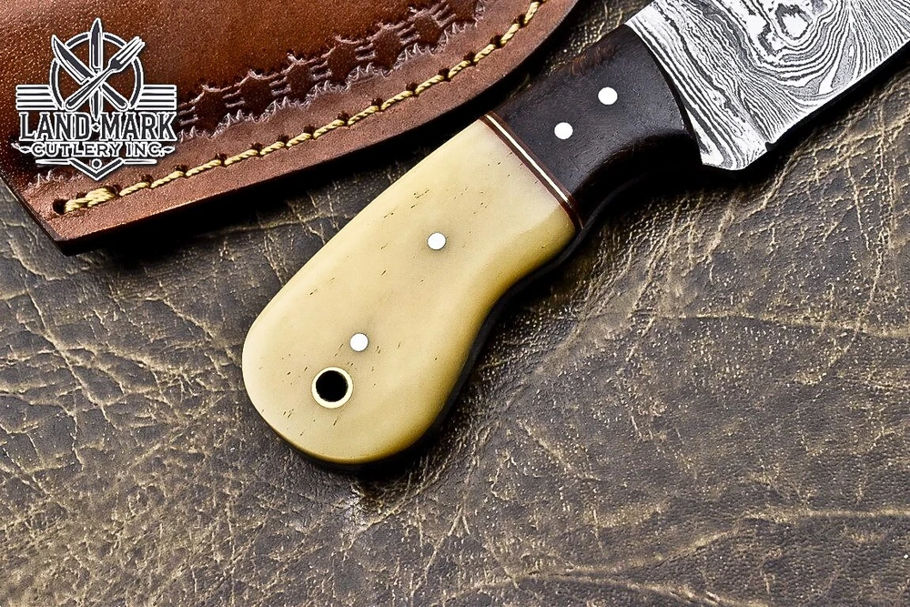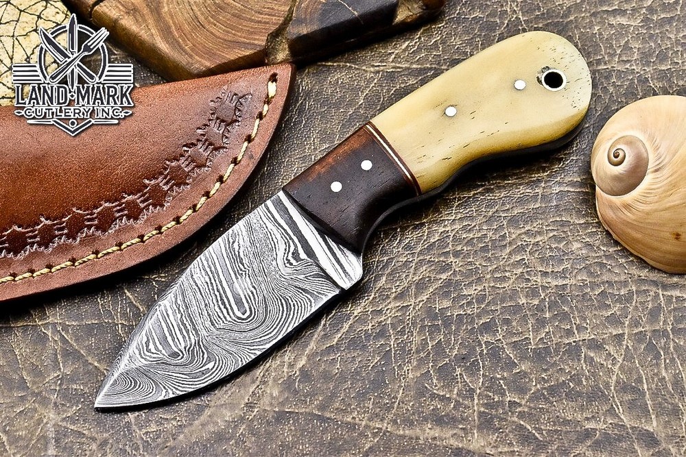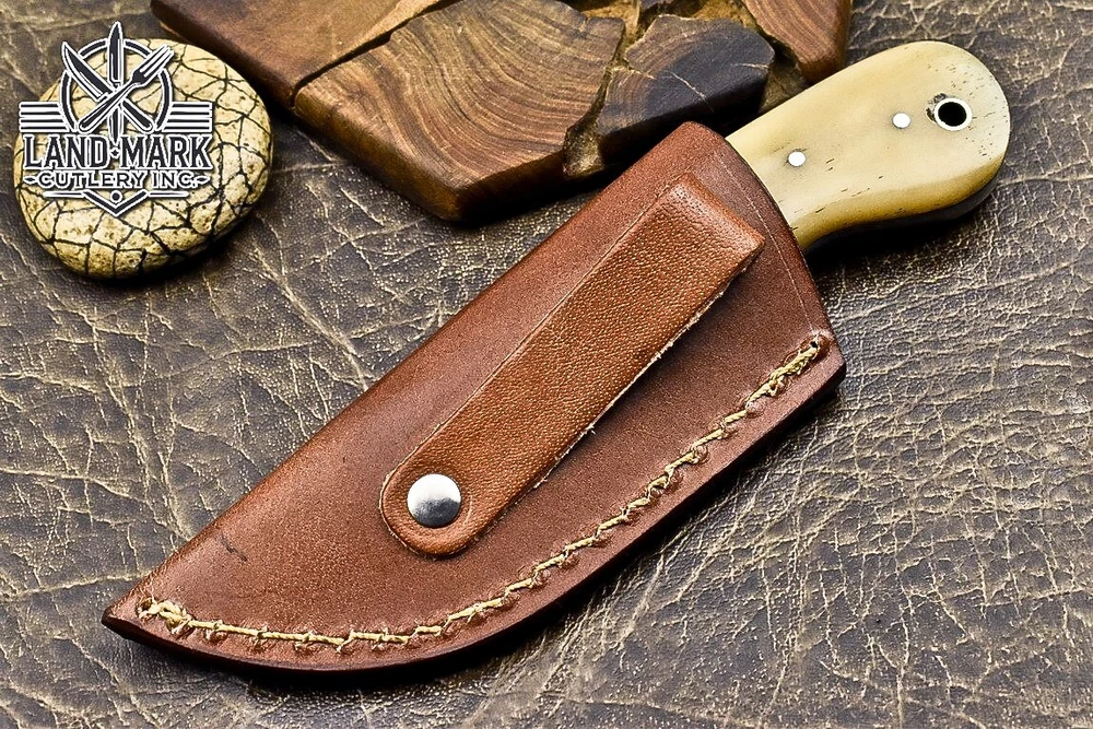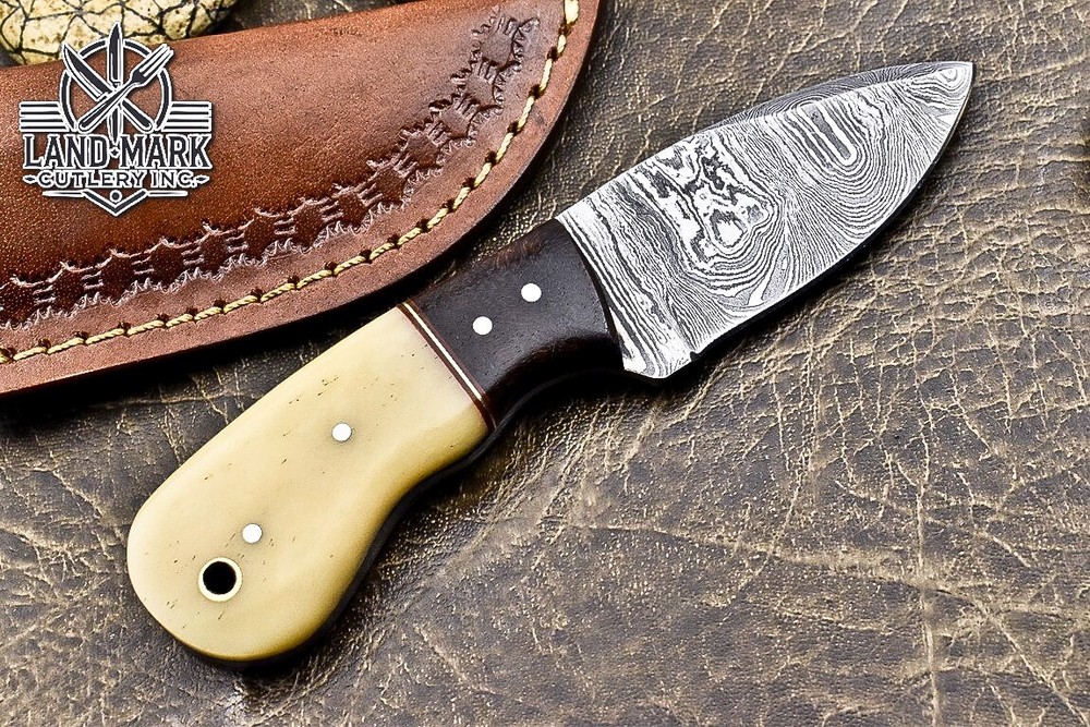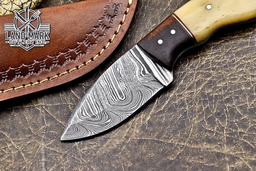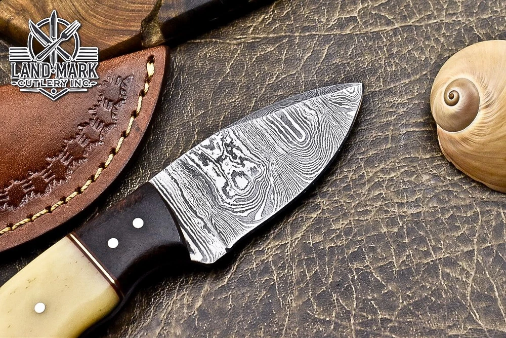 Custom Hand Made DAMASCUS STEEL HUNTING KNIFE WITH CAMEL BONE HANDLE We offer a shipping discount for More then one purchased . And discount will be apply on combine invoice, Discount will not apply on separate payment. ITEM DETAILS OVER ALL LENGTH 3.0 inches long (Approx) HANDLE LENGTH 1.5 inches long (Approx) BLADE LENGTH 1.5 inches long (Approx) BLADE HARDNESS 58-60 HRC Which Holds The Sharp Edge For Long Time. HANDLE CAMEL BONE COVER LEATHER SHEATH This Awesome custom made KNIFE has a nice hand forged with the combination of 4340 & 1080 steel. HOW OUR DAMASCUS IS MADE: All our Damascus is real and not just an acid etch. Damascus is a mixture of 1080HC and 4340 nickel carbon. You heat them up together and then fold the bar over and over to get the desired layers, ours are 396 layers. Then you burn the blade in acid, and it turns the nickel satin color and the high carbon turns blackish gray. This is how the layers are exposed to show the layers of the new steel created coined "Damascus". All Damascus is acid etched to show the layers. If you high polish the metal it will be shinny satin like all steels. Only after you burn the sides of the blade with acid do you see the layers of the two steels. Makes sense? After we make our knives we high polish the handles and put an edge on the blade. The high polishing buffs off the acid burned layer of the handle, and the blade edge is sharpened and the acid burned edge becomes satin. You can re-burn the tang of the blade near the handles and the edge of the blade and it will show the layers once more. All our knives are hand made, durable and unique ***** YOU WILL RECEIVED THE SAME KNIFE Qality Standards Our Damascus blades are made from high quality non-stainless steels which rival or exceed any Damascus blade made from the 10 series with 4340. Our Damascus combination has taken years to perfect and has been tested under a variety of application which will offer professional performance in categories of toughness, strength (lateral stress) and edge honing and holding ability. In a 5 spot Rockwell test our blades will average near or close to 58 which offers a perfect balances between its toughness and strength.Our blades due to carbon content need to be regularly treated with wax and/or 3 in 1 oil to maintain its superior quality. Questions if you have any question feel free to send us message we aim to answer all questions within 24 hours Feedback If you are not satisfied with our service please contact us before leaving any negative or natural feedback. We will resolve all issues as quickly as possible. Disclaimer We are not responsible for any injuries associated with the use of our tools. Our products are intended for legal use only by responsible buyers. Therefore, we will not sell our products to anyone under the age of 18. Before bidding please check your country laws as some countries Custom don't allow this. If your purchase is held by Custom Authorities in your country/State we will not be responsible for that and no refund will be issued Shipping We offer a 20% shipping discount for More then one purchased . And discount will be apply on combine invoice, Discount will not apply on separate payment We ship within 24 hours after receiving complete payment but this can be delayed due to week ends or Governments and Religious Festivals . . This is beyond our control and we apologize for this inconvenience. Precautions Our Tools are very sharp so open and use them very carefully We are not responsible for any injuries associated with the use of our tools Tips to Care knife 1. NEVER STORE YOUR KNIFE FOR LONG TIME IN LEATHER SHEATH. 2. LEATHER CAN ABSORB WATER, WHICH WILL RUST THE KNIFE. 3. ALWAYS CLEAN THE BLADE AFTER USING WITH OIL OR WAX
