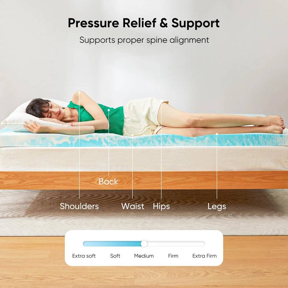 Pressure Point Relief: If you suffer from back or joint pain, the added support provided by a memory foam mattress topper can significantly improve sleep comfort. Our mattress pad is composed of high-density memory foam that conforms to body contours for ultimate relaxation in all sleep positions. Rejuvenate Your Mattress: Extend the life and add softness to your current mattress with our gel-infused memory foam topper. Enjoy superior comfort that can revitalize an aging mattress for that brand-new bed feeling without the hefty price tag. Certified Quality: Our memory foam mattress topper is backed by CertiPUR-US and OEKO-TEX mattress certifications. These industry-leading certifications ensure that our mattress pad is made with skin-friendly materials for an exceptional level of quality. Cooling Gel Infusion: This memory foam bed topper is infused with cooling gel beads that help to dissipate heat for less sweating and more comfort. The topper features innovative channels that promote better airflow to allow hot air to escape away from your body. Easy to Unroll: Setting up our mattress topper is as easy as opening the package, unrolling the topper, then allowing 24–48 hours for full expansion. Whether you are upgrading a sofa bed, air mattress, or conventional bed, the mattress topper effectively resists deformation for long-lasting use.