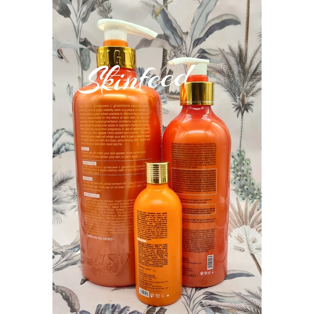 3pc. Easy Glow 3x skin glowing Body Lotion, Shower gell, & Serum. Carrot oil .. Mix lotion 250ml with 60ml serum. TIP. add anti reaction oil to this lotion because of its Strong fast action. Get your bel Eclat kenacol, shenic oil, beauty series oil or style clear serum to add into this fast action lotion for an amazing results.