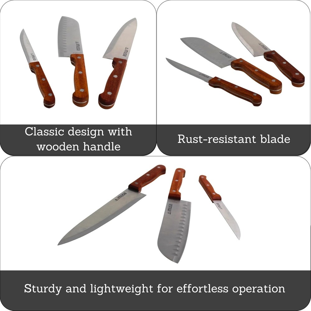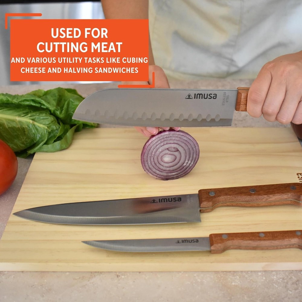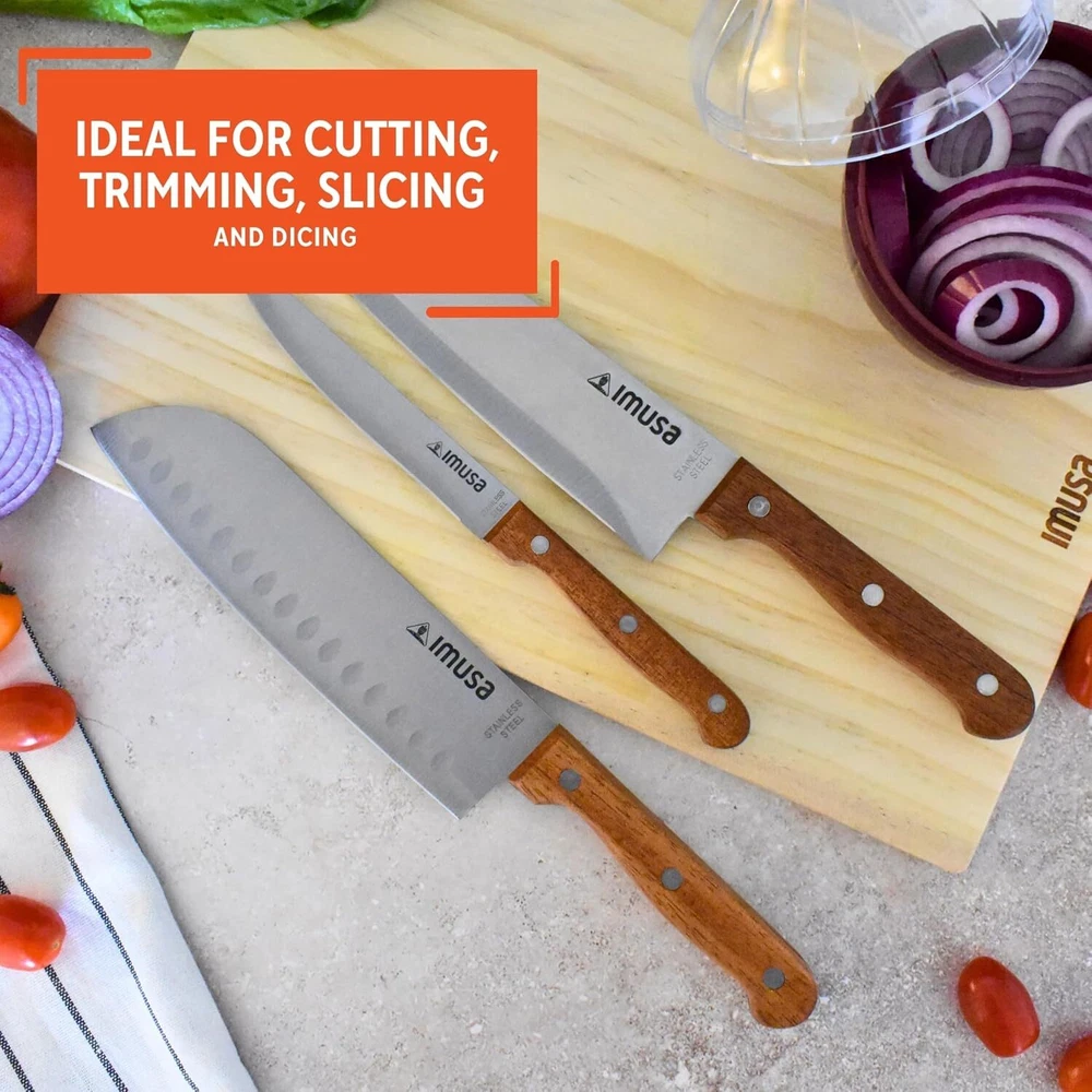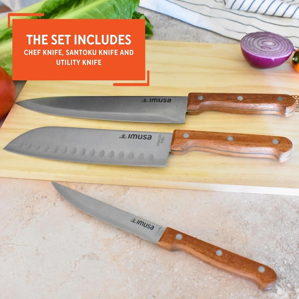 3pc Knife Set with Wood Handle, 8” Chef Knife, 7” Santoku Knife & 5” Utility Knife, Sharp Kitchen Knives for Cooking, Stainless Steel Blade VERSATILE SIZES FOR EVERY KITCHEN TASK: Available in 5", 7", and 8" sizes, this set offers the ideal variety for all kitchen tasks, from mincing to slicing and dicing, providing precision and ease in preparing a wide range of dishes DURABLE STAINLESS-STEEL CONSTRUCTION: Made from high-quality stainless steel with a natural blade finish, this set is rust-resistant and easy to clean; the wood handle provides a comfortable, secure grip, combining durability and style EXCEPTIONAL SHARPNESS & CONTROL: The sharp blades offer effortless cutting and extra control, making them ideal for precise food preparation; the ergonomic design ensures balance and comfort, whether you're cutting meats, fish, vegetables, etc DESIGNED FOR EVERYDAY USE: This set includes a Chef knife, Santoku knife, and Utility knife, ideal for daily kitchen tasks like mincing, slicing, dicing, and chopping, making it perfect for both quick meals and more elaborate dishes IDEAL FOR COOKS OF ALL LEVELS: This set is perfect for both beginners and experienced cooks; whether you're cooking daily meals or experimenting with new recipes, these knives provide the quality and performance needed for any kitchen task