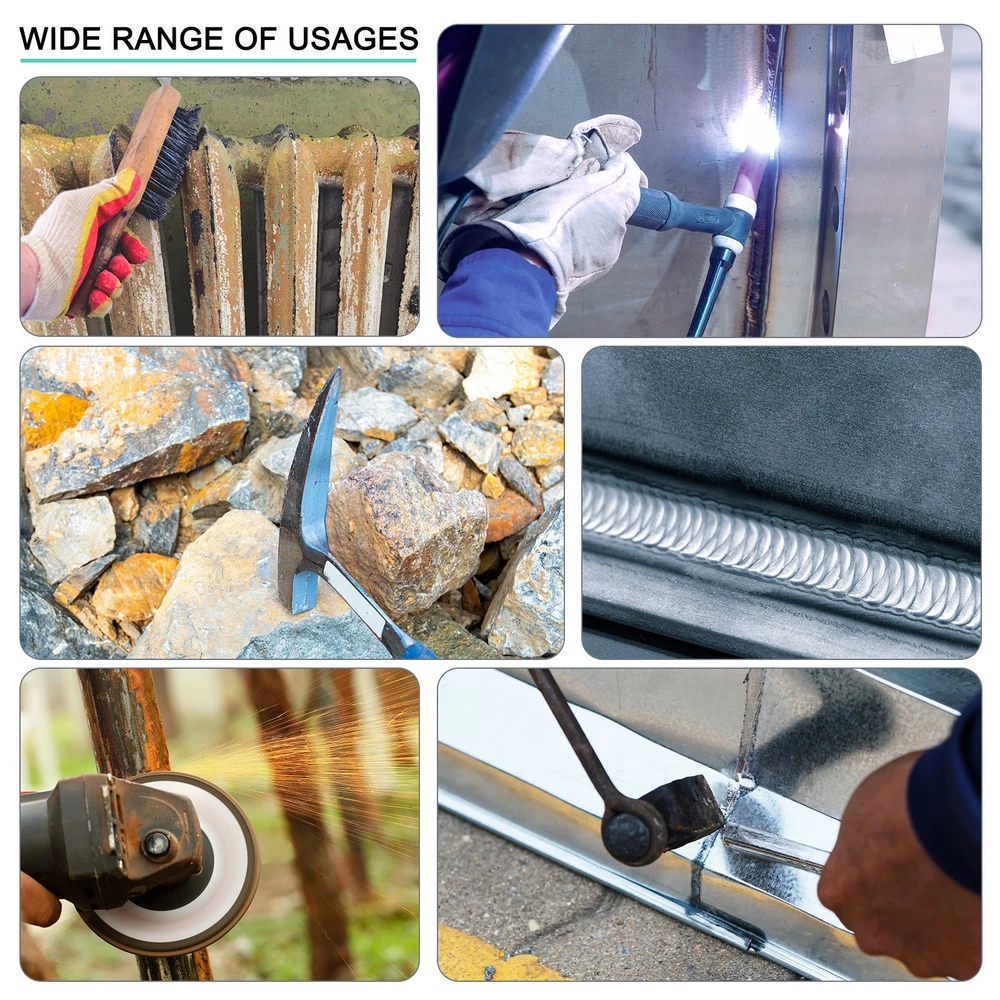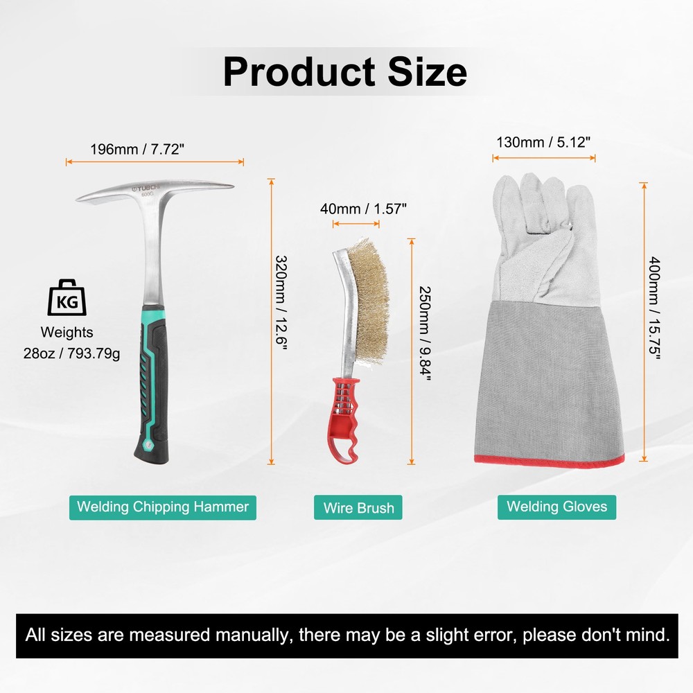 Document The weight of the welding slag hammer is 28oz / 793.79g; the measurement size: 12.6 inch x 7.72 inch (320mm x 196mm); the wire brush size is 9.84 inch x 1.57 inch (250 mm x 40 mm); the welding gloves size is 15.75 inch x 5.12 inch (400 mm x 130 mm).Welded chisel hammers are made from high carbon steel for strength and stability. The copper-plated stainless steel wire has greater toughness and wear resistance, which can reduce wire breakage and extend service life, helping you remove dirt quickly. The gloves are made of soft leather.Our welding slag hammers are designed with ergonomic handles and lightweight construction to reduce arm strain, which significantly reduces strain during use and dramatically improves your work efficiency. The gloves are resistant to oil, heat and cuts, which will give you nice protection during the operation.Use the welding spatula hammer and wire brush for effective cleaning tasks. The narrow side of the brush and fine hammer are specifically designed for intricate and tight spaces, ensuring thorough cleaning results.Regularly inspect the hammers for any signs of wear or damage, and if you notice any problems, stop using them to ensure safety and product effectiveness. 3pcs Slag Remove Tool 28oz Welding Hammer with Wire Brushes & Gloves,White The weight of the welding slag hammer is 28oz / 793.79g; the measurement size: 12.6 inch x 7.72 inch (320mm x 196mm); the wire brush size is 9.84 inch x 1.57 inch (250 mm x 40 mm); the welding gloves size is 15.75 inch x 5.12 inch (400 mm x 130 mm). Welded chisel hammers are made from high carbon steel for strength and stability. The copper-plated stainless steel wire has greater toughness and wear resistance, which can reduce wire breakage and extend service life, helping you remove dirt quickly. The gloves are made of soft leather. Our welding slag hammers are designed with ergonomic handles and lightweight construction to reduce arm strain, which significantly reduces strain during use and dramatically improves your work efficiency. The gloves are resistant to oil, heat and cuts, which will give you nice protection during the operation. Use the welding spatula hammer and wire brush for effective cleaning tasks. The narrow side of the brush and fine hammer are specifically designed for intricate and tight spaces, ensuring thorough cleaning results. Regularly inspect the hammers for any signs of wear or damage, and if you notice any problems, stop using them to ensure safety and product effectiveness. Hot Item Payment 1.We accept eBay payment . 2.Payment must be received within 7 business days of auction closing. Shipping 1.We ship to your eBay or Paypal address. Please make sure your eBay and Paypal address is correct before you pay. 2.Items will be shipped within 1-3 business day when we received payment. 3.Delivery time depends on destination and other factors. Description Policy 3pcs Slag Remove Tool 28oz Welding Hammer with Wire Brushes & Gloves,White The weight of the welding slag hammer is 28oz / 793.79g; the measurement size: 12.6 inch x 7.72 inch (320mm x 196mm); the wire brush size is 9.84 inch x 1.57 inch (250 mm x 40 mm); the welding gloves size is 15.75 inch x 5.12 inch (400 mm x 130 mm). Welded chisel hammers are made from high carbon steel for strength and stability. The copper-plated stainless steel wire has greater toughness and wear resistance, which can reduce wire breakage and extend service life, helping you remove dirt quickly. The gloves are made of soft leather. Our welding slag hammers are designed with ergonomic handles and lightweight construction to reduce arm strain, which significantly reduces strain during use and dramatically improves your work efficiency. The gloves are resistant to oil, heat and cuts, which will give you nice protection during the operation. Use the welding spatula hammer and wire brush for effective cleaning tasks. The narrow side of the brush and fine hammer are specifically designed for intricate and tight spaces, ensuring thorough cleaning results. Regularly inspect the hammers for any signs of wear or damage, and if you notice any problems, stop using them to ensure safety and product effectiveness. Hot Item Payment 1.We accept eBay payment . 2.Payment must be received within 7 business days of auction closing. Shipping 1.We ship to your eBay or Paypal address. Please make sure your eBay and Paypal address is correct before you pay. 2.Items will be shipped within 1-3 business day when we received payment. 3.Delivery time depends on destination and other factors.