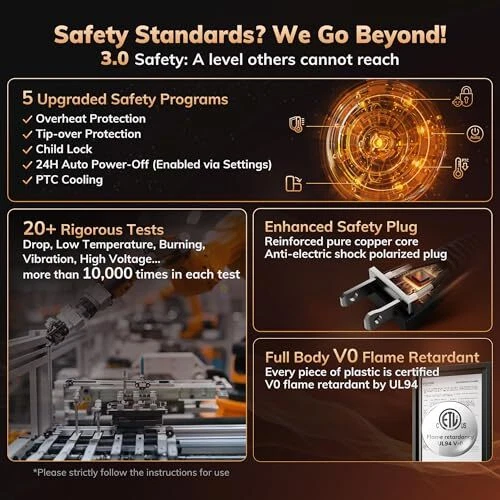 【The Era of 3.0 Heater Has Arrived】From 1.0 heater using resistive wire to 2.0 with PTC plates and blade fan, has now led the industry into the 3.0 era. The 3.0 heater features innovative Matrix PTC Ceramic Heating Plate and Inclined Blade Cross-Flow Wind Wheel. And it has been fully upgraded with ECO 3.0 Algorithm, 0 Odor Heating, 360° Enclosed Shaded-Pole Motor, and Polarized Plug. These innovations aim to address all the shortcomings of old heaters, including low heat, high energy, odors, noise, and low safety. 【The 16-Inch 3.0 Heater Offers an Experience That Surpasses the Older 24-Inch Models】16-inch 3.0 heater not only outperforms the 24-inch older model in heat output, safety, and energy efficiency, but also achieves utmost silence running, 0 odor, and a durability of three years. Technological innovation brings an upgraded experience, allowing the 16-inch model to easily outperform the older 24-inch model! has successfully elevated the heater experience to an unmatched new height. 【3.0 Materials Achieve an Exceptionally Rare 0 Odor Heater】We are incredibly proud to have solved the odor problem that has plagued heating industry for over a decade. Through more than 5,000 material formulation experiments and setting factory standards that exceed market expectations, finally balances 0 odor with high flame retardancy. Unlike older models on the market that often produce a pungent odor after heating, we have eliminated harmful odors at the source, ensuring that only the feeling of normal air being heated remains! 【Surging Warmth From the 3.0 Heater】heater is equipped with unprecedented 3.0 heating hardware in the industry. Compared to the previous generation's resistive heating wires and blade fans, the Matrix PTC Ceramic Heating Plate increases heat output by 62%, while the Inclined Blade Cross-Flow Wind Wheel improves airflow and distance by 35% and 21%, respectively! Thanks to the Heatflare tech with a 47% increase in thermal efficiency, heater delivers over 1.5 times the heating experience with the same 1500W maximum power! 【3.0 ECO Delivers Unprecedented Energy Efficiency】Not everyone dares to use the highest setting for energy-saving tests! heater not only enhances thermal efficiency but also features ECO 3.0 tech powered by AI. With millisecond-level calculations and 18 independently controlled ceramic heating modules, heater can automatically and dynamically adjust to the optimal output power. This allows our heater to enhance temperature control accuracy to 1°F while being 32% more energy-efficient than traditional ECO models! 【The Pinnacle of Quiet Heaters】heater has reached the 3.0 utmost silence level, running at only 37dB even at full power! Additionally, 's self-developed QuietWave tech provides our heater with an ultra-even frequency spectrum. It is not only quiet to the point of being imperceptible, but it also eliminates the risk of hearing damage caused by long-term appliance noise. 【3.0 All-Around Safety Assurance】always prioritizes user safety. We have upgraded both the hardware and software of outdated industry heaters, raising safety standards to a new level! With 8 layers of safety protection and over 20 extreme environment tests, it completely eliminates all risks, making this your first heater that you won’t have to worry about regarding safety! (Please ensure that your operations comply with the instructions in the user manual.) 【Durability Far Exceeding 3 Years】We firmly oppose the common practice of planned obsolescence in the home appliance industry! We have set durability standards for our products that exceed market expectations, enabling heater to undergo a series of rigorous tests, including storage at 158°F, running at -4°F, drop tests, vibrations, and over 3,000 hours of continuous use. We are confident it can provide you with warmth for more than just three winters! No matter what issues you encounter, we're covered for three years! 【Details Always Stand Out】Features include an upgraded 24-H Timer, an 8-meter Remote Control, 70° Wide-Angle Oscillation, Auto Screen Off, Child Lock, Silent Mode and Smart Power-Off Memory. Even with the same functions, heater offers comprehensive upgrades to enhance the user experience!
