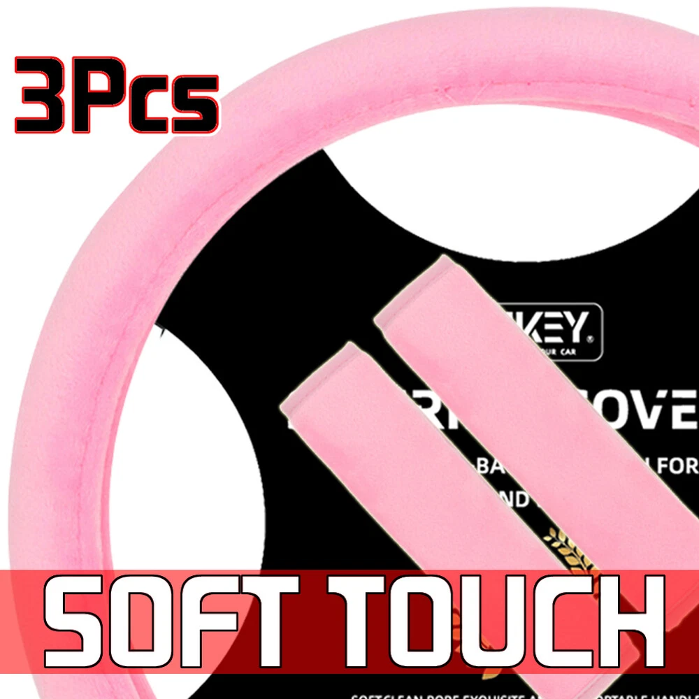 3x Car Pink Steering Wheel Cover Seat Belt Strap Pad Cushion Harness Plush Women