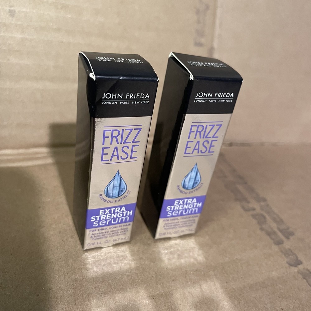 John Frieda Frizz Ease Extra Strength Serum - 2 Pack This listing includes two (2) travel-sized boxes of John Frieda Frizz Ease Extra Strength Serum. Specifically formulated for thick and coarse hair types, this serum utilizes bamboo extract to provide advanced smoothing and exceptional humidity resistance. The compact 4.7ml size is perfect for travel, gym bags, or trying out the product before committing to a full size. Brand: John Frieda Product: Frizz Ease Extra Strength Serum Size: 0.16 FL OZ (4.7 mL) per box Quantity: Set of 2 Benefits: Frizz control, humidity protection, and smoothing for thick hair