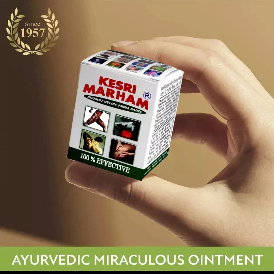 3x Kesri Marham Balm For Joint Pains, Headaches & Body Pain 100gm Each (Free Ship) Kesri Marham Balm is a balm designed with ayurvedic compounds that give relief from joint pain, body pain and headaches. It is manufactured with natural ingredients. It can be easily applied to the affected area to reduce the pain. Key Benefits: This marham can help in cases of pain like headache, joint and back pain This marham can be rubbed on the affected area to get relief from the pain Directions For Use: Use as directed on the label.