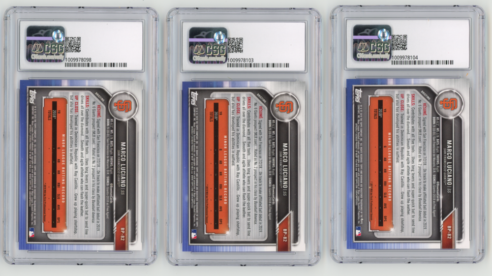 Lot 3x Marco Luciano 1st 2019 Bowman Prospects #BP-82 CSG 9.5 Gem Mint Graded You get the three cards shown in the scans. Gem Mint