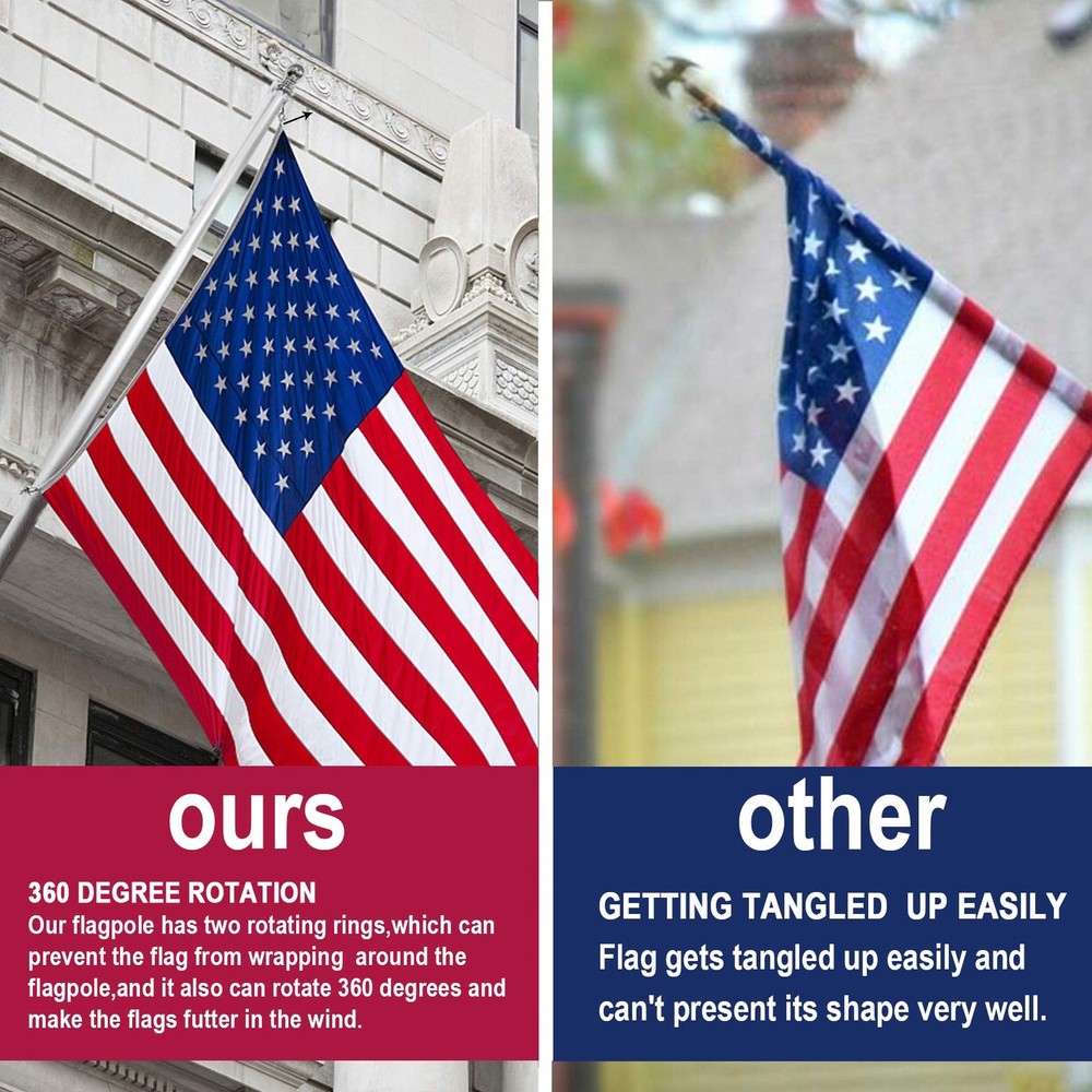 US FLAG WITH POLE - Everything includes the 3x5 Feet Polyester Amercian Flag, 6 Feet Aluminum Flag Pole and the base needed for an easy, worry-free 2-minute installation. TANGLE-FREE SPINNING FLAG POLE - Our American Flag Pole Kit includes a 6' spinning flag pole for the perfect outdoor american flag display. Our new tangle-free technology Utilizes sealed weather-proof ball bearings to ensure your us flag hangs properly. Made of Aluminum to make sure it durable and rust free so you dont have to worry about getting it changed too often. 3x5 AMERICAN FLAG - The American flag made of 100% polyester imported for long lasting use. Every star is embroidered as official US flag, each stripe is stitched together with double thickness and double stitching and strengthened by canvas header and two brass grommets. You will surprise at the embroidered stars and sewn stripes. The Best Ideal for residential, commercial and outdoor use. FADE RESISTANT US FLAG - You will immediately notice how amazing the print is. The color is very sharp and vivid. In addition, the dye has been processed for UV fade resistance, suitable for outdoor use. Package contains one 3x5 Ft American Flag. USA FLAG SATISFACTION - 3x5 American Flag with Pole wants you to be Happy and we stand behind our flag products. All purchases are backed by a one-year hassle-free warranty.