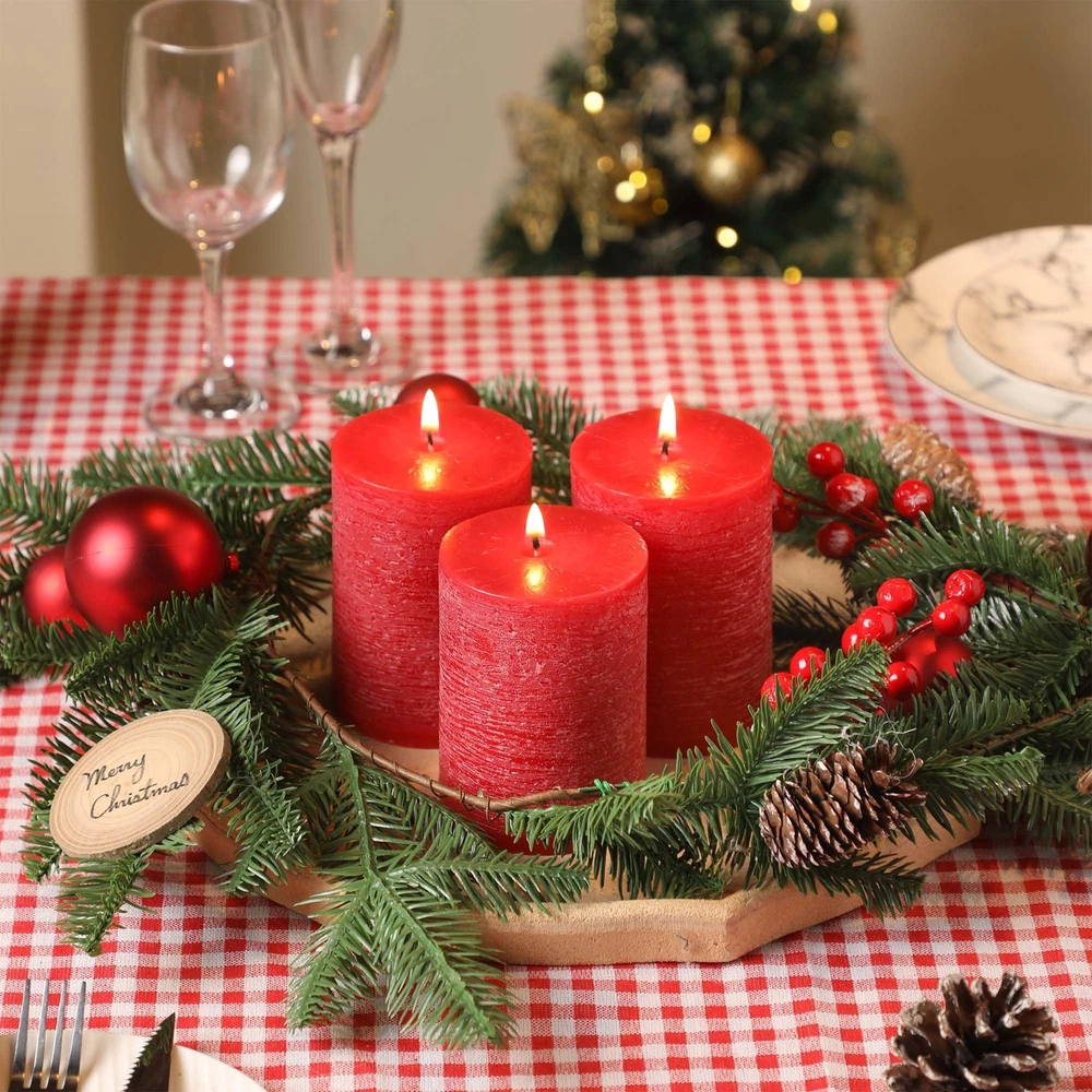 [Create a Warm Atmosphere]: Our unscented Pillar Candles provide a beautiful, smokeless, and dripless glow perfect for creating a warm and inviting atmosphere in any setting. Whether it's a romantic dinner, a family gathering, a Christmas celebration, or a moment of relaxation, our pillar candles bulk can set the mood for any occasion. [Christmas Home Decorations]: Red pillar candles can be used for Christmas decor, mantel decorations, Christmas table decorations, lighting solutions, aromatherapy, and even as emergency candles. Our pillar candles are incredibly versatile, adding elegance and charm to various situations. [Eco-friendly & Exquisite Craftsmanship]: Our pillar candles are crafted with a deep respect for nature. Made from high-quality, eco-friendly materials including 100% soy wax wax and cotton wicks, pillar candles offer a sustainable choice without compromising on elegance. Experience the exquisite craftsmanship and natural beauty of our hand-poured candles. [Product Size]: Pillar Candle Set comes with three 3×6 inch pillar candles! Each Pillar Candle is individually handmade and meticulously crafted for perfection. Enjoy the long-lasting burn time of our large and clean-burning candles, providing hours of beautiful illumination for your home or event. [Safe packaging]: We understand the importance of receiving your candles in perfect condition. That's why we have improved our packaging to prevent any damage during transit. If you're not completely satisfied with your purchase, please reach out to us directly. We are committed to ensuring your satisfaction and will promptly assist you to make things right.
