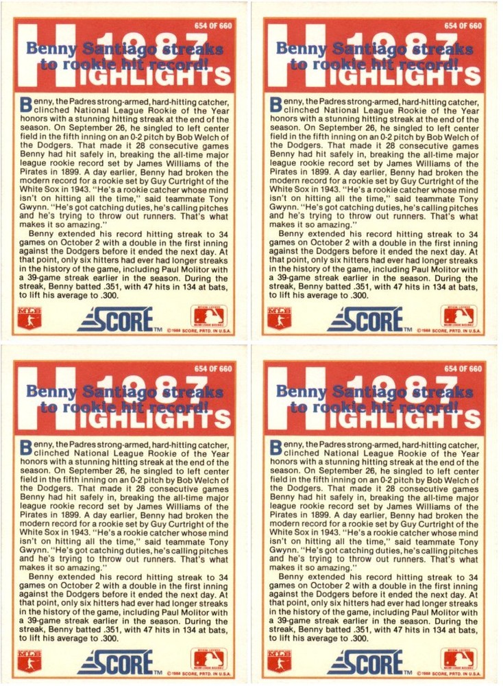 (4) 1988 Score #654 Benny Santiago San Diego Padres Card Lot Condition: NM-MT