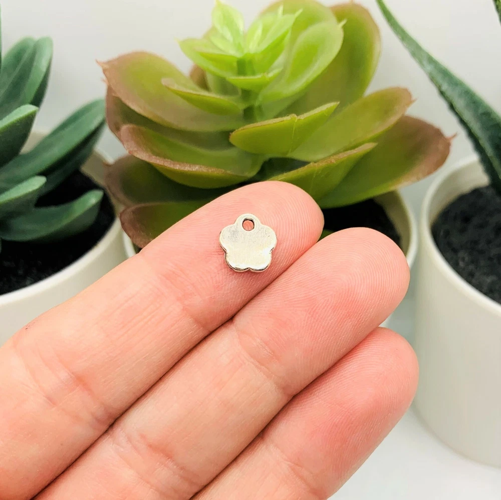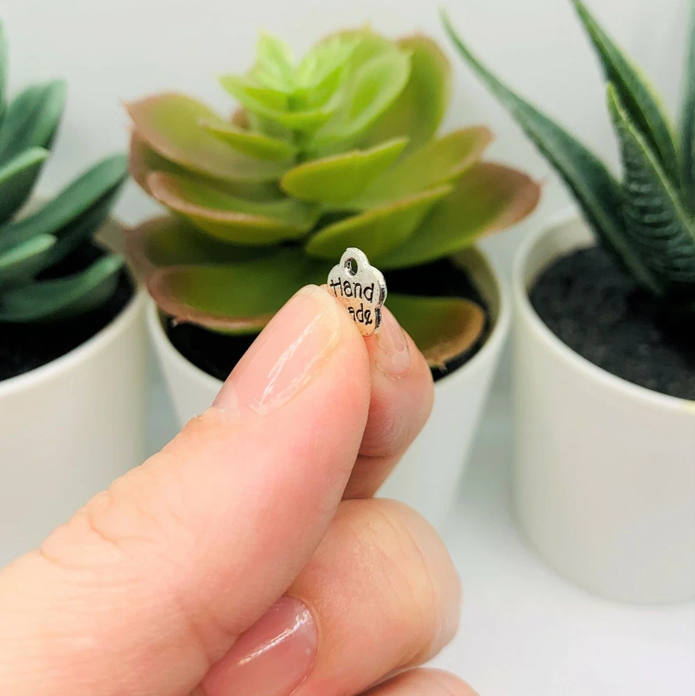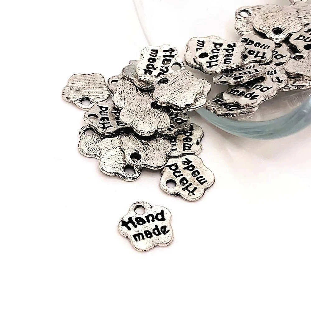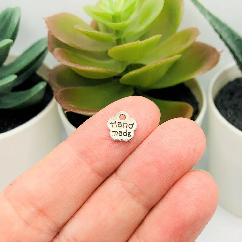 Handmade Flower Charms If you're looking for some unique and beautiful charms to add to your jewelry to highlight their craftsmanship, these delicate flower charms with 'Handmade' are a great choice! Whether you want just a few to accent a bracelet or necklace, or you need a larger quantity for a bigger project, you can choose from sets of 4, 20, or 50 pieces. 13 x 16 mm 1 mm hole Silver toned zinc alloy Nickel, lead, and cadmium free! Hand-packaged to ensure only the best quality! Perfect for necklaces, bracelets, and other DIY creations! Shipping Fast shipping within the USA! All orders shipped out within 24 hours of payment (aside from holidays and weekends). Combined shipping available! Return Policy Customer satisfaction is our priority! Returns, refunds, and replacements available for all unused items within 30 days. Contact us for any questions, comments, or concerns!