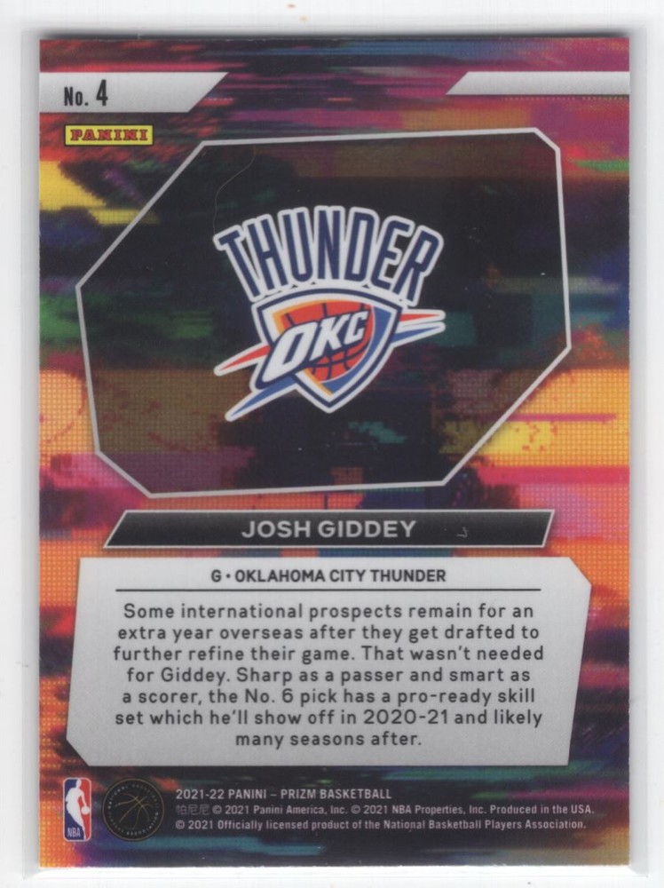 About Me Other Listings Feedback Add to Favorites Contact Me eBay Store Striking Cards 901 #4 2021-22 Panini Prizm Instant Impact Josh Giddey Rookie Oklahoma City Thunder No stock photo / These are real scans or pictures Details Description: Josh Giddey Category: Basketball Year: 2021 Product: Panini Prizm Instant Impact Team: Oklahoma City Thunder Card Number: 4 Rookie: Yes Dimensions: 3½" x 2½" SKU: BK B0001 R01 M (53) Listing By Kronocard trading cards software v2.8.1.2