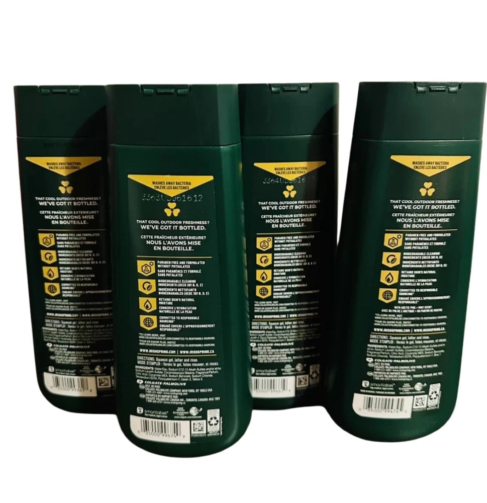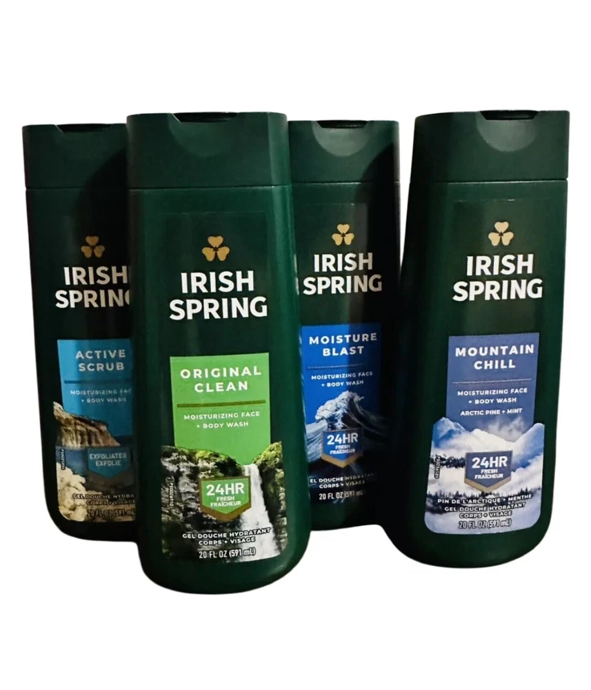 4 - 20oz Bottles Irish Spring Men’s Body Wash Assorted Scents. 1 bottle each of the following scents: Active scrub Original clean Moisture blast Mountain chill All new