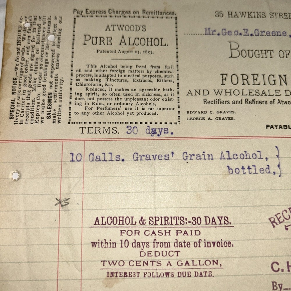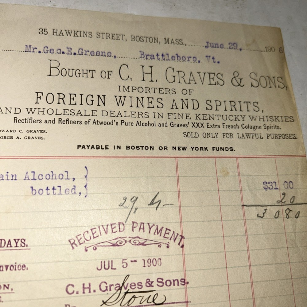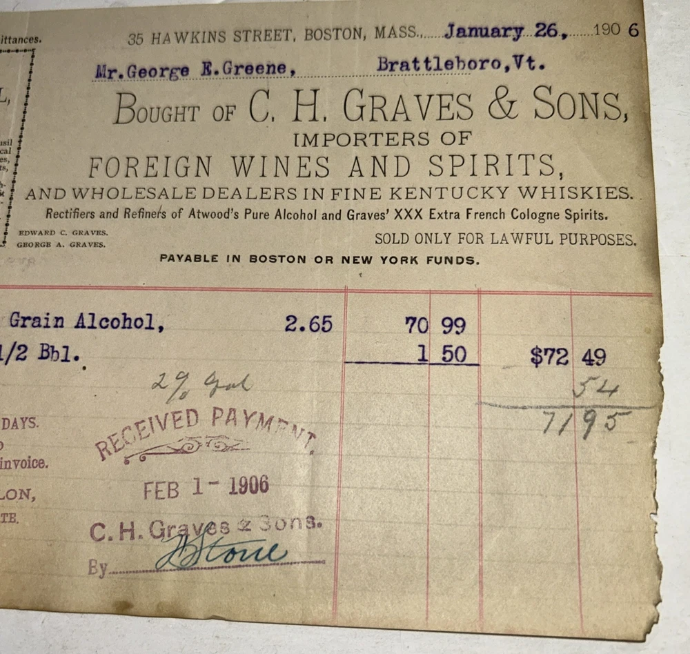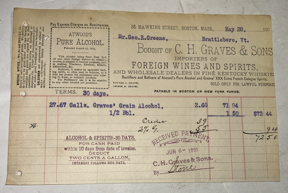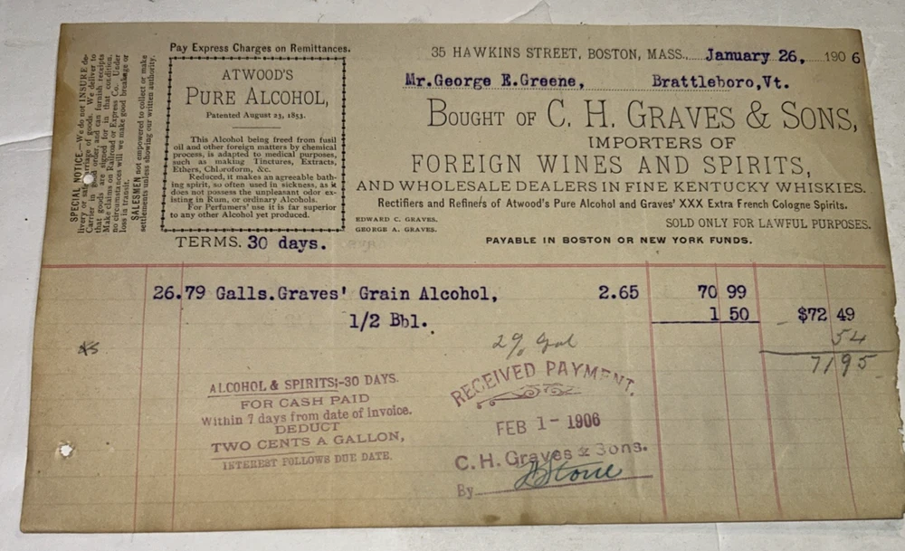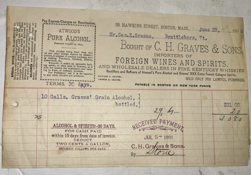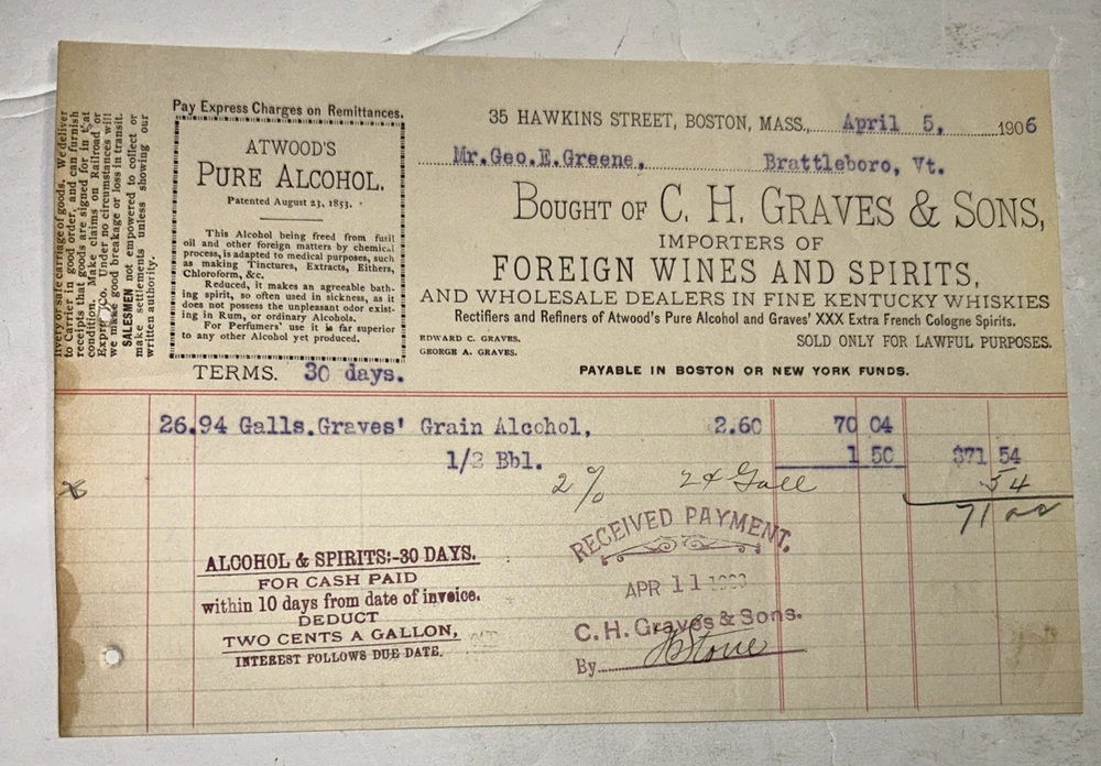 Four Billheads from January, April, May and June 1906. Sold to Geo E Greene, Brattleboro, Vermont. Atwoods Pure Alcohol. Each receipt is for grain alcohol. Please see photos and check my other sales. I combine shipping.