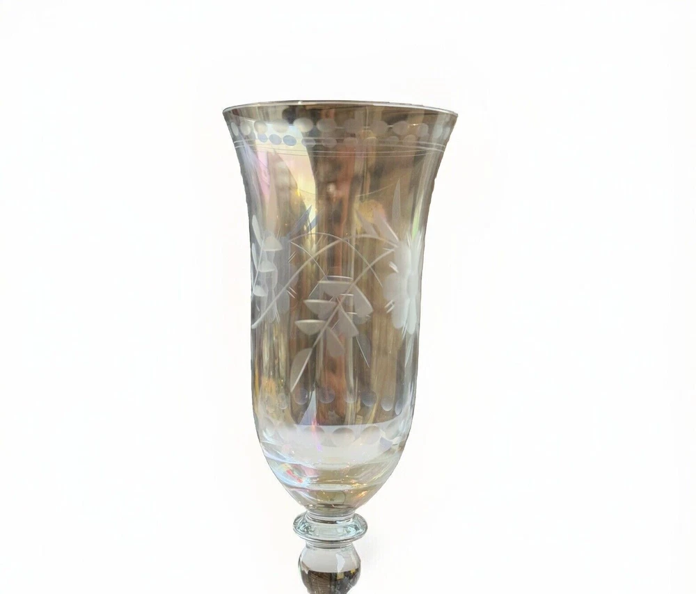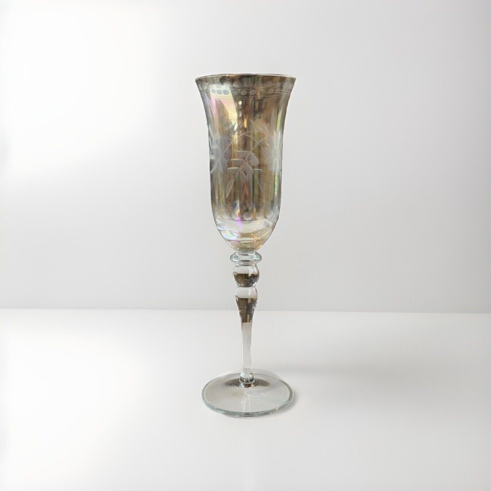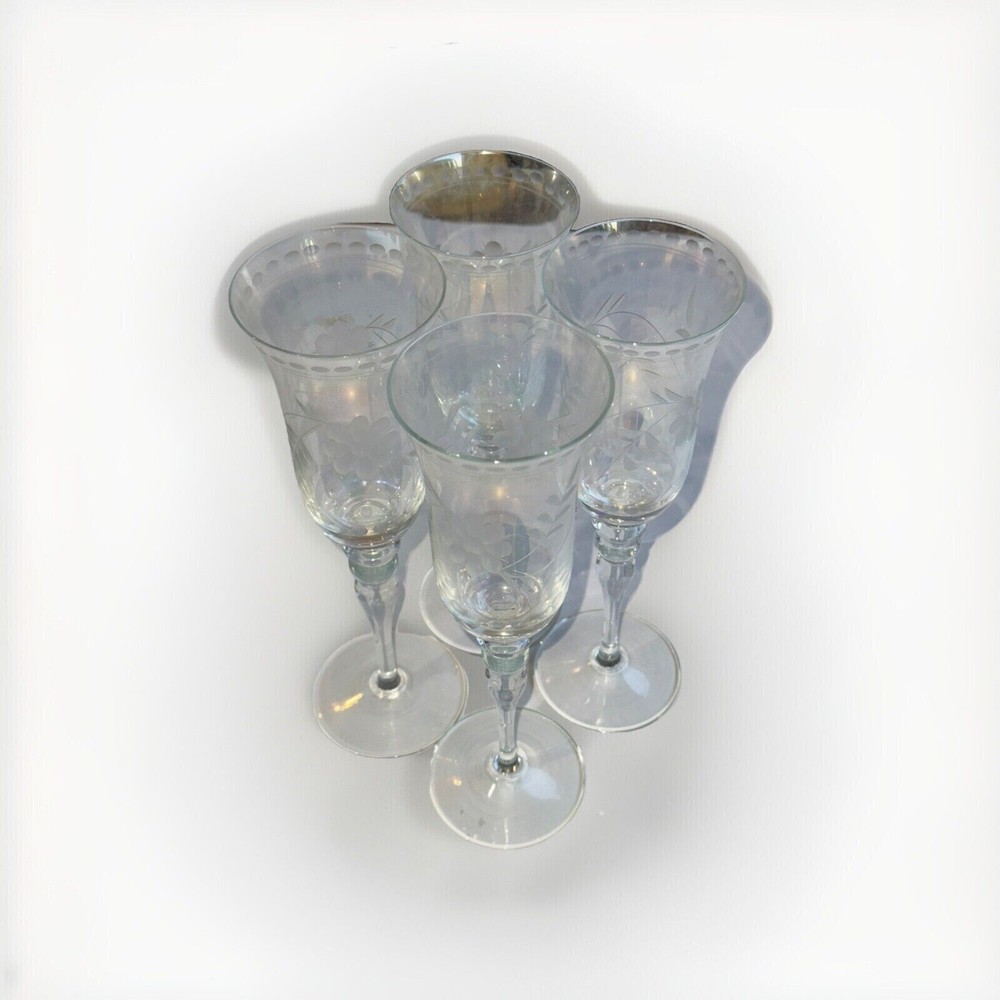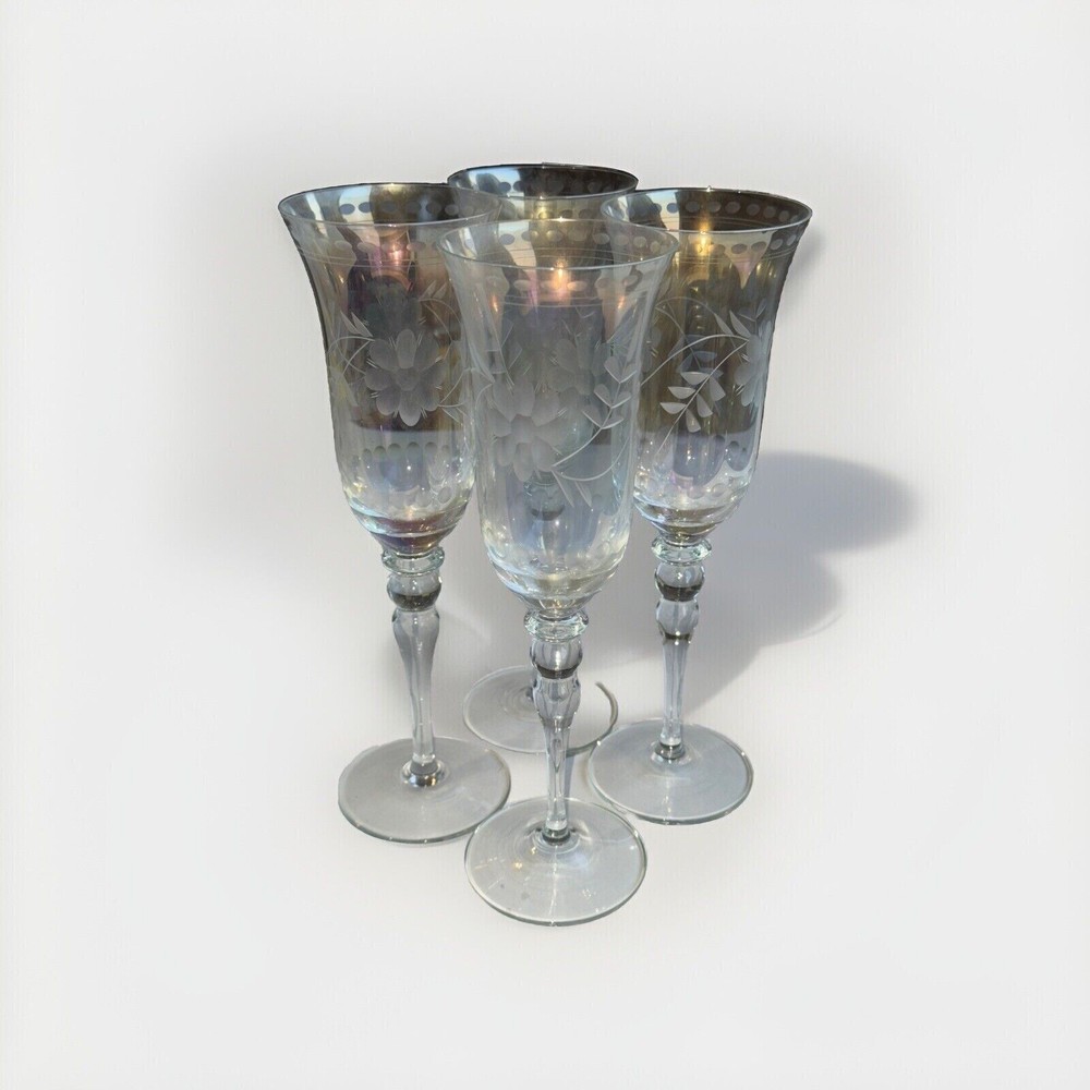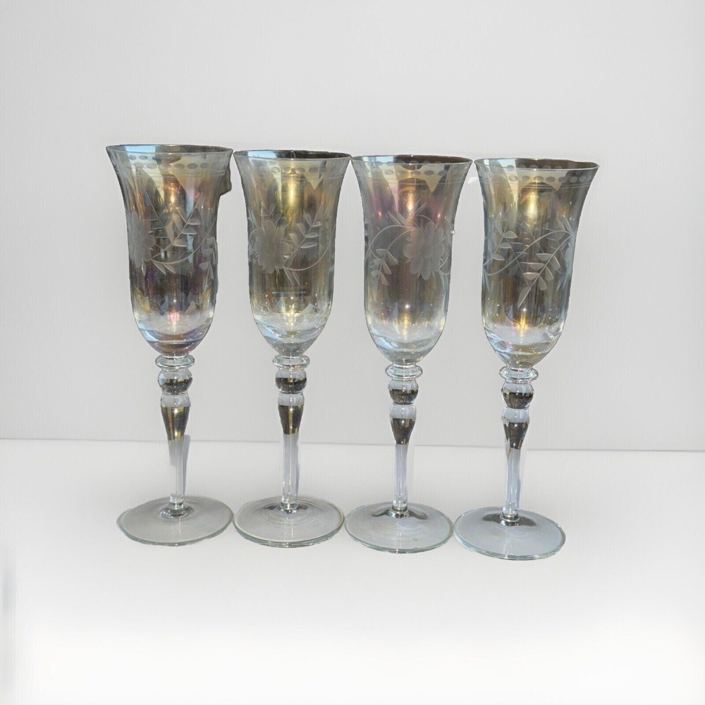 The product is a set of 4 blue champagne flutes made of glass. Each flute features a design with flowers, perfect for entertaining and dining. They are suitable for serving champagne or other sparkling beverages.