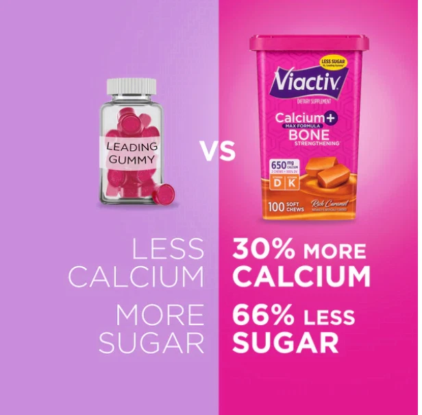 Department:Adult, UnisexFlavor:caramelUPC:Does not applyNumber of Pills:100Expiration Date:06/2025Features:Chewable Tabletsgtin13:Does not applyFormulation:ChewableBrand:ViactivMain Purpose:Muscle HealthActive Ingredients:Calcium, Vitamin DDosage:650mgType:VitaminIngredients:Calcium, Vitamin D