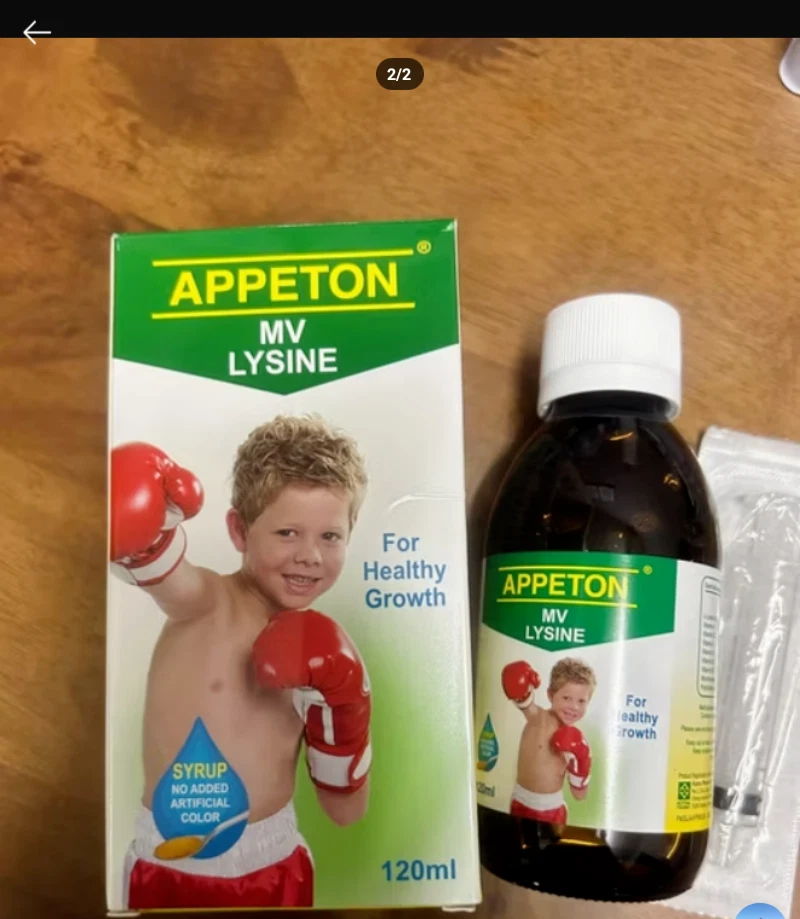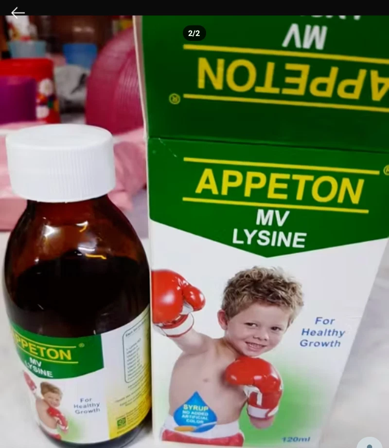 4 Bottles X Appeton Multivitamin Lysine Syrup 120ml DHL EXPRESS Product Description Appeton Multivitamin Lysine (Syrup) Appeton Multivitamin Lysine Syrup is a dietary supplement for children. Benefits: 1)Vital multivitamin helps promote overall healthy growth & prevention of nutrition deficiencies. 2)Lysine helps to improve appetite,promotes muscle growth and weight gain. 3)Product comes with a Dose- MasterTM,for better hygiene, accuracy and convenience to the user. Who are recommend to take Appeton Multivitamin Lysine Syrup 1) Children with poor appetite,fussy eaters,picky eaters. 2)Underweight and skinny children. 3)Children who frequently fall sick because of poor nutrition. 4)Children recovering from illness( poor appetite;need multivitamin booster. Nutrition Composition Contents Per 5 ml %US RDA* Lysine (L-lysine HCl) 100mg - Vitamin A 1000 IU 20% Vitamin D3 200IU 50% Vitamin E 5IU 17% Vitamin B1 0.5mg 33% Vitamin B2 0.5mg 29% Vitamin B6 0.5mg 25% Nicotiamide 6mg 30% Vitamin C 15mg 25% Pantothenic Acid 2mg 20% Vitamin B12 0.9mcg 15% *United States Recommended Dietary Allowance, US RDA Features Fruity flavor. No artificial coloring. No alcohol. Dosage Children 1-4 years old : 2.5 ml per day Children > 4 years old : 5 ml per day or As directed by physician. Can drop directly on tongue, milk, juice or liquid food. Packaging 120 ml per amber glass bottle. Attached together with Dose MasterTM for correct measurement.