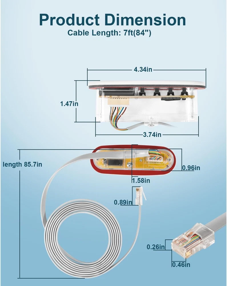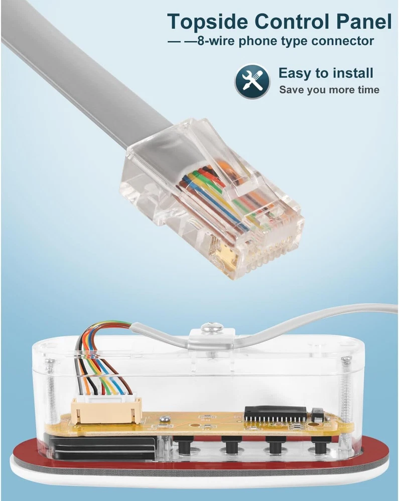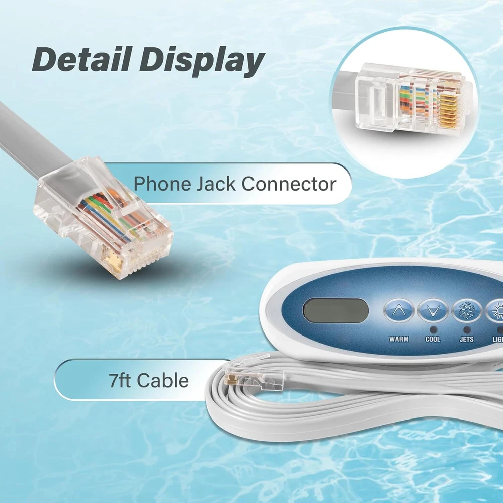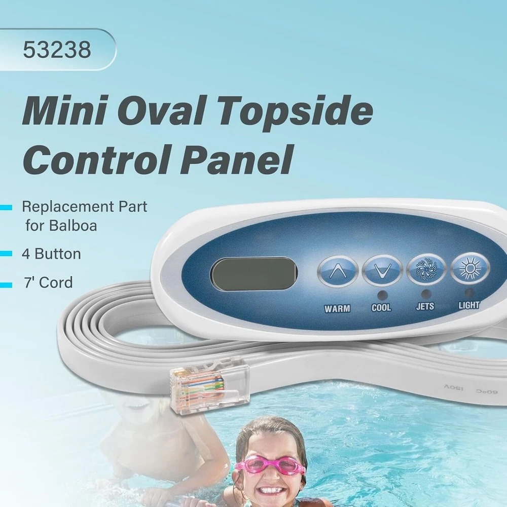 Fitment: This 4-Button Topside Control Panel is only fit for Balboa Heat Jacket Systems Features: 1) Part number is 53238. It can also replace for the following part numbers: 53636, 53280, MAS25, 52361, 407012, Topside Panel with Overlay 407016, 407014 2) This Topside Panel has 4 buttons, namely WARM, COOL, JETS and LIGHT, with LCD display on left. It uses a phone-type connector, 8-wire, with 7ft cord (About 85 inches). With Large & easy-to-read displays, Reliable communication interface, and Water-resistant connector 3) The Hot Tub Topside Control Panel can control the water temperature, light, and jets, allowing you to easily adjust the mode you need in the pool, giving you a pleasant and comfortable spa experience 4) The 53238 Topside Control Panel is made of durable material, anti-rust, anti-corrosion and long-lasting. Easy to install, no need any complicated tools Package included: 4-Button Topside Control Panel