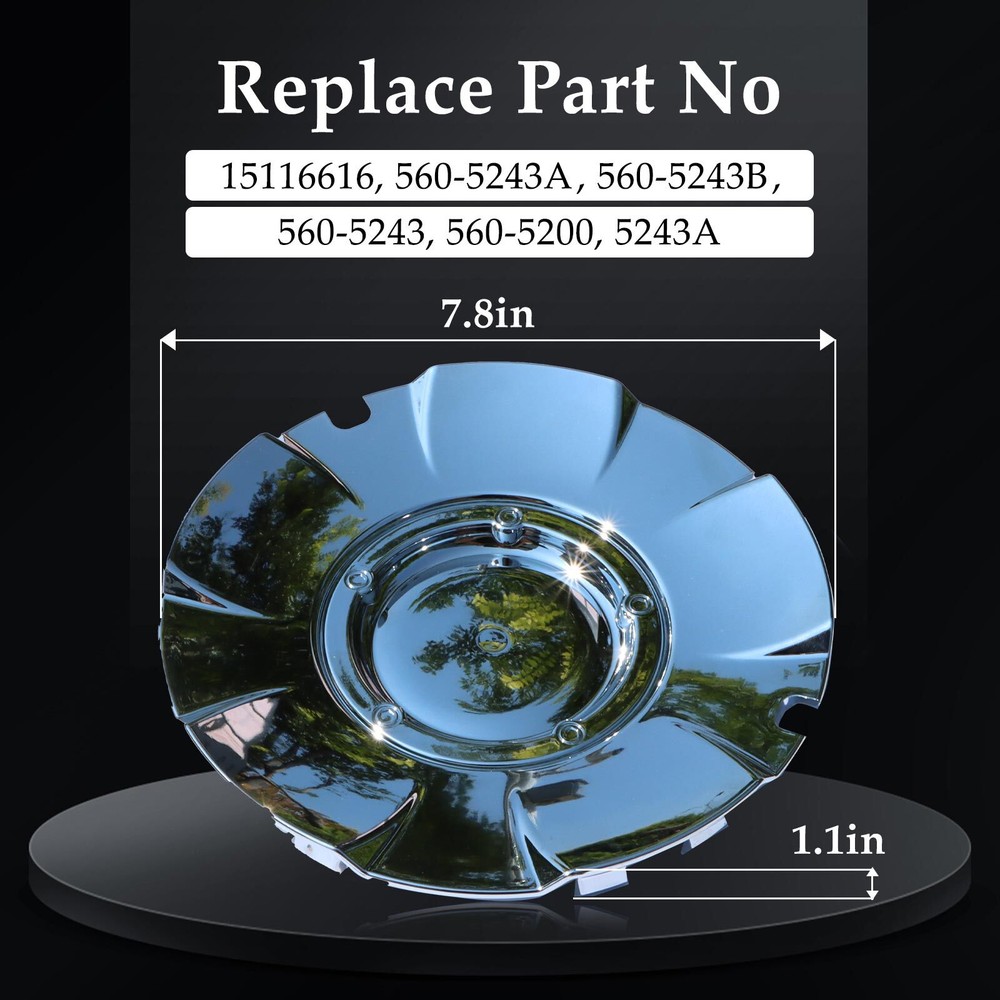 Finish: Silver Plastic Other Part Number: 15116616, 560-5243A, 560-5243B Brand: BROTHERAUTO Placement on Vehicle: Left, Right, Front, Rear Interchange Part Number: 560-5243B, 560-5243, 560-5200, 5243A gtin13: Does not apply Manufacturer Part Number: 15116616 Material: Plastic UPC: Does not apply Features: Chromed Number in Pack: 4 Superseded Part Number: 15116616