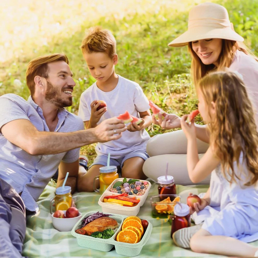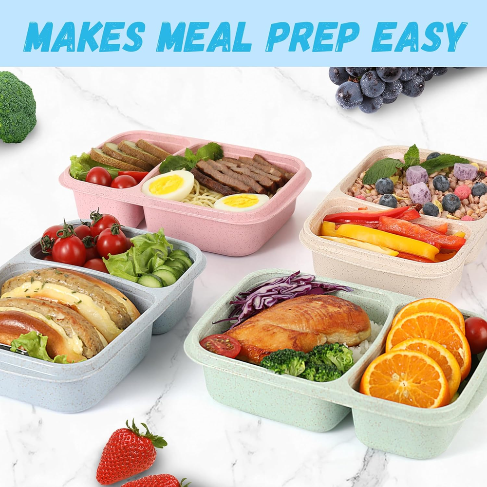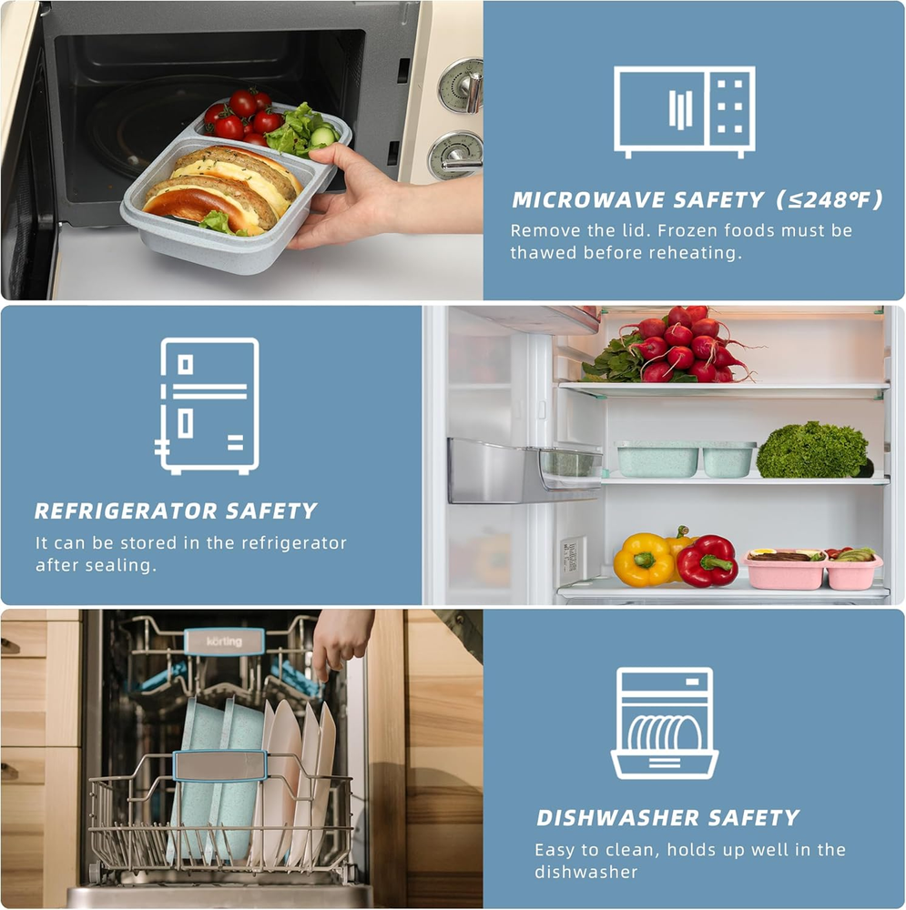 ✅ EASY MEAL PREP: Our 4 Pack Bento Lunch Box features 2 compartments in one container, making meal prep a breeze. Each container holds 34 oz, perfect for portion control and healthy eating. ✅ DURABLE & REUSABLE MATERIALS: Made with natural wheat straw, wheat fiber, and PP material, our lunch containers are food-safe and sustainable. Plus, the durable materials ensure they'll last for many meals to come. it's a must-have for anyone who wants to save money and reduce waste by packing their own meals.(Recommended age 5 years old and above) ✅EASY TO OPEN & CLOSE: Our 'cat ear' handle on the lid makes it easy to open. The lid fits perfectly to keep your meals fresh. The transparent lid makes it easy to see your food, and even if you have many containers in front of you, you can easily choose the right one. ✅ VERSATILE USE: These meal prep containers are perfect for meal prep, school lunches, or storing leftovers. Whether you're packing meals for work, school, or a day out, our bento boxes are the perfect solution. They're also stackable, making them easy to store in your fridge or pantry. ✅ MICROWAVE, DISHWASHER & FREEZER SAFE: UNlike other meal prep containers that crack or melt in the microwave, Our bento box can withstand temperatures from -40℃ to +120℃ (-40℉ to 250℉). Plus, Our bento boxes are dishwasher safe, making cleanup a breeze.(Please remove the lids before heating). Product Description HAVE A HAPPY SHOPPING JOURNEY! WHY CHOOSE OUR BENTO BOX HEALTHY EATING MADE EASY With our Bento Box, you can easily stick to your healthy eating plan. They're perfect for portion control and keeping your meals organized. EASY TO CLEANA Our bento lunch box are dishwasher safe, making cleanup a breeze. Plus, the durable materials ensure they'll last for many meals to come. MEAL-PREP MADE EASY Streamline your meal prep routine with This 2-Compartment Meal Prep Containers - trays and lids nest together, stack neatly, and are microwaveable for ultimate convenience. PERFECT FOR ANY OCCASION Whether you're packing snacks for work, school, or a day out, our bento box are the perfect solution for healthy eating. PERFECT GIFT Our bento lunch box is a great gift for anyone who wants to eat healthy and stay organized. It's a must-have for anyone who wants to save money and reduce waste by packing their own meals. WARM NOTE Please take off the lid before heating. Please note that liquid food cannot be 100% leak-proof, so please place the Bento Box flat and do not shake or put it upside down when placing liquid food. PRODUCT DETAILS Name: Wheat Straw Bento Box! Weight: 160g Size: 9.4x6.1x1.9inch Color:Blue/Pink/Beige/Green