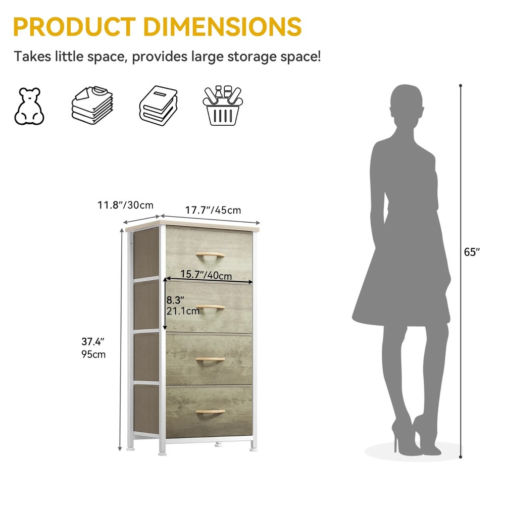 multifunctional dresser offers ample storage, perfect for bedrooms, closets, dorms, entryways, hallways, and living rooms. It features four spacious, foldable drawers ideal for clothes and daily essentials, with a large wooden top for displaying lamps and clocks. Built with a robust metal frame and premium MDF wooden top, its durability is enhanced by non-woven synthetic fabric. The 4-drawer chest is portable and foldable, with easy-to-pull handles for smooth operation, and folds flat for convenient storage. Minimal assembly is required, with clear instructions and a safety kit included. Overall dimensions: 17.7"L x 11.8"W x 37.4"H. High Light 4-Drawer Chest Spacious Drawers Multifunctional Dresser Robust & Durable Safety First Specifications Brand: Product Dimensions:11.8"D x 17.7"W x 37.4"H Color :Oak Greige Assembly Required :Yes Item Weight :13 Pounds Size :4-Drawer Robust & Durable: The sturdy metal frame supports the overall structure, while the premium MDF wooden top and non-woven synthetic fabric enhance durability. Safety First: Requires minimal assembly with clear instructions, safety kit, and accessories included. Wall anchoring is recommended to prevent tipping. Overall size: 17.7"L x 11.8"W x 37.4"H; Drawer size: 15.7"L x 11"W x 8.3"H. 4-Drawer Chest: This drawer chest features a portable and foldable design with easy-to-pull handles for smooth opening and closing. Folds flat for easy storage. Multifunctional Dresser: Uforic storage towers enhance various interiors with ample storage space. Ideal for the bedroom, closet, dorm, entryway, hallway, or living room. Spacious Drawers: Four deep foldable drawers provide ample room for clothes and daily essentials. The large wooden top is perfect for displaying lamps, clocks, and glasses.