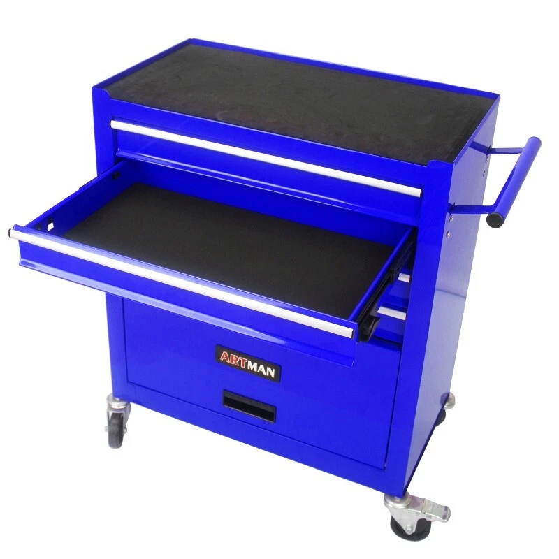 Features and Details: This assembly trolley has 4 steering wheels, 2 of which with parking brakes, so you can move the trolley freely in the garage, but also stop in one place. The storage surface provides additional space for storing and arranging tools you often need. The opening and closing of the drawers of the tool cabinet is very gentle thanks to the ball-bearing drawers. The robust and powder-coated steel construction is used for high wear resistance. Specification: Color:Blue Material:Cold Rolled Steel Surface Finish :Powder Coating Casters:4" Casters (2PCS with brake and 2PCS without brake) Product Dimensions:24.25"L×13"W×29.33"H Weight (lbs.): 41.89