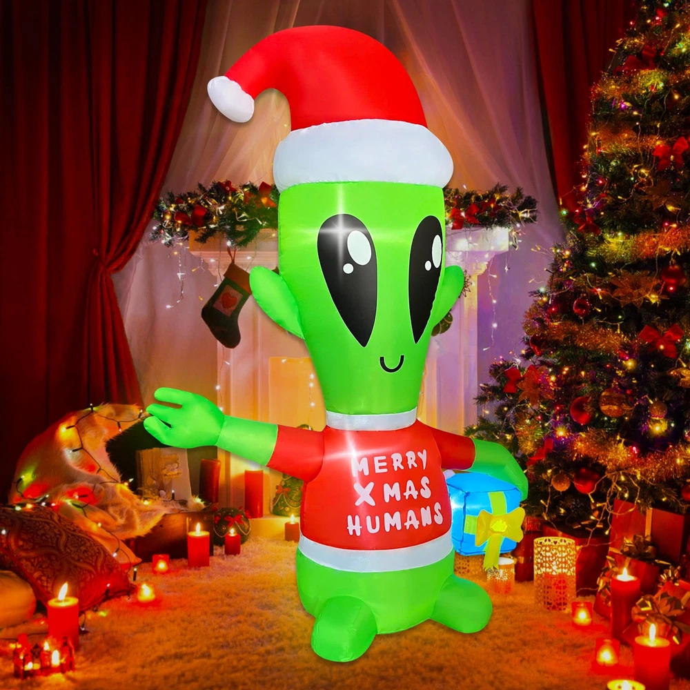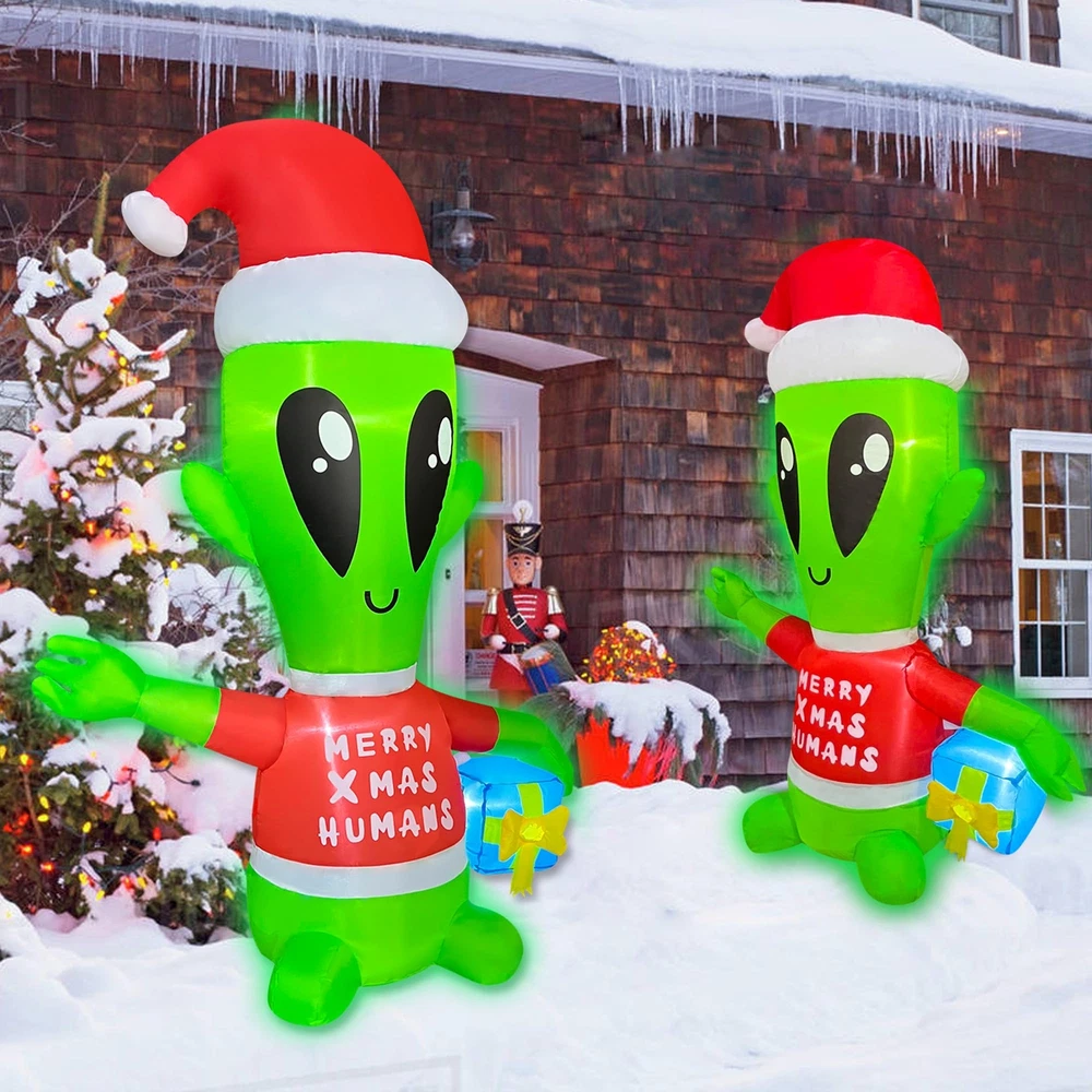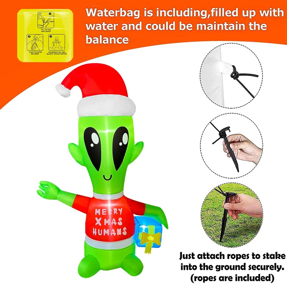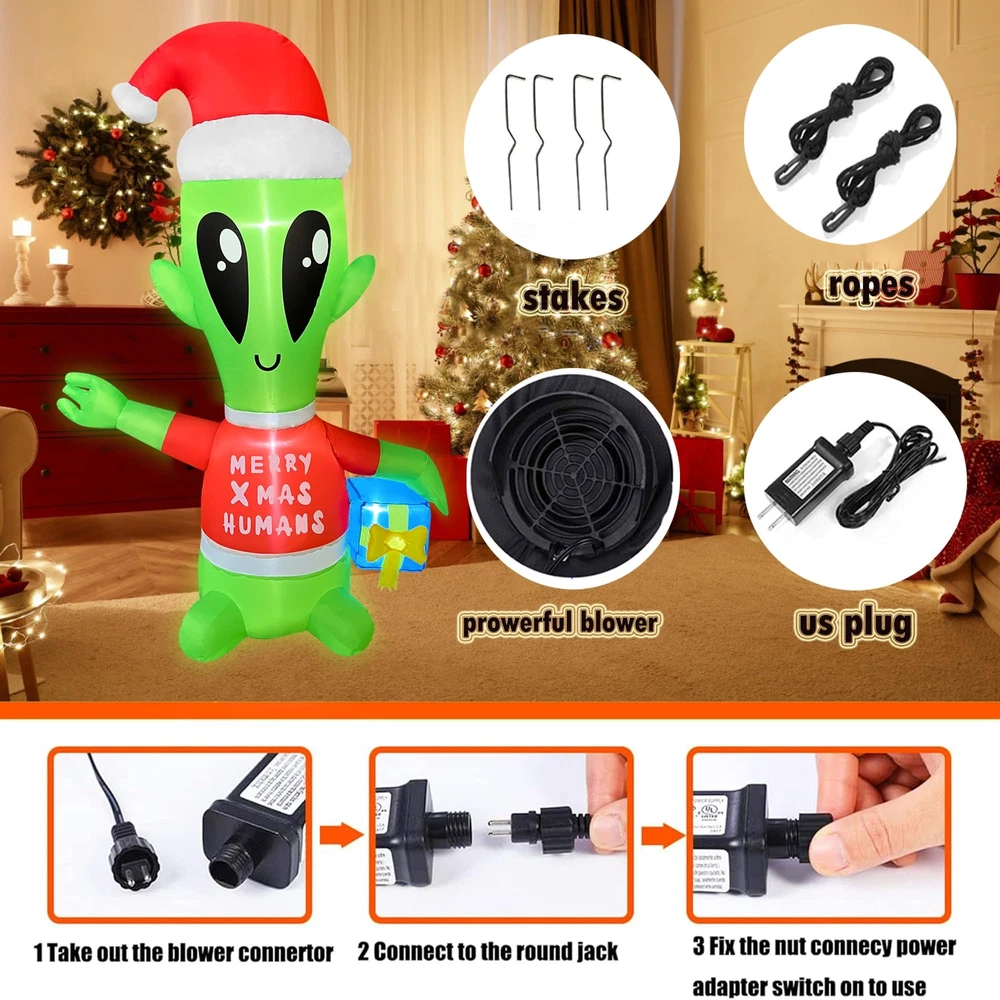 CHRISTMAS INFLATABLE: 4 FT Christmas Inflatable Alien with Gift Box is ideal Christmas blow-up yard decorations. The Christmas Inflatables will light up your yard and welcome your lovely neighbors BUILD-IN LED LIGHT: Christmas inflatables equipped with LED light, large and bright enough to illuminate the cheerful atmosphere of Christmas Night! Easy to spot! This 4 FT Christmas Inflatable Alien with Gift Box would be an ideal host to welcome your Xmas guests STABLE DESIGN: The christmas blow up decorations are designed to be stable and inflatable during the holiday. The inflatable comes with ropes and stakes to ensure the stability of the inflatables. EASY SET-UP AND USE: Just plug this christmas inflatables decorations in, it has a built-in fan and in only seconds it will be fully inflated, then secure it to the ground AFTER SERVICE: If you're unsatisfied or have any problems with Xmas Blow Up Yard Decoration please the seller through .