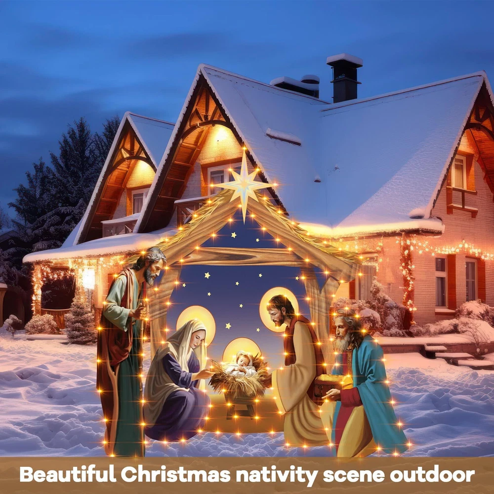 Features: The set includes a stable manger, realistic Jesus, Mary, and wise men. Each character expresses their joy at the arrival of a new life. This set also includes beautiful decorative lights, making this decoration shine beautifully at night. This oversized nativity scene outdoor is made from quality durable materials to ensure the quality and durability of the decorations. Our decorations are handmade, each piece is carefully crafted with good detail to better showcase the nativity scene. Specifications: Material: hollow board Color: multicolor Size: Nativity scenes: about 117 x 114 cm/ 3.84 ft x 3.74 ft Wise men: about 60 x 30 cm/ 1.97 ft x 0.98 ft Light strings: 5 meters and 3 meters long Package includes: 1 x Nativity scenes 2 x Wise men 3 x Light strings Notes: Manual measurement, please allow slight errors on size. The color may exist a slight difference due to different screen displays. Product Includes: Christmas nativity scene outdoor includes 1 manger scene religious signs, 2 wise men and 3 light strings; Classic design full of Christmas atmosphere, providing everything you need for a mesmerizing, illuminated display Large Sizes for Outdoor Use: with the nativity scenes measuring 117 x 114 cm/ 3.84 ft x 3.74 ft and the wise men at 60 x 30 cm/ 1.97 ft x 0.98 ft, this yard nativity scene outdoor adds significant visual appeal to your holiday decor; The length of our light string is 5 meters for 1 pcs and 3 meters for 2 pcs; The product does not include batteries; Please configure AA batteries yourself Reliable Material for Longevity: this nativity scene outdoor large lighted is made from a durable hollow board material, ensuring longevity; Nice for those seeking a stable and long lasting nativity set for Christmas outdoor decor Easy Assembly Outdoor Decor: this large outdoor nativity set for yard is designed for simply assembly, making it an easy addition to your Christmas outdoor decor; Once you set it up, it's sure to be an attention grabber for passersby Outstanding Outdoor Nativity Set: this nativity set for Christmas outdoor decor meets the needs of customers who want a durable, and visually stunning accessory; With easy assembly, impressive size, it's easy to enhance the holiday spirit