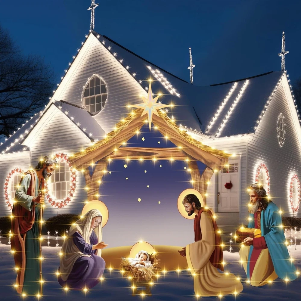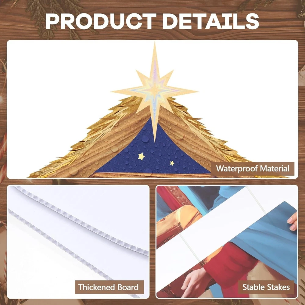 Product Includes: Christmas nativity scene outdoor includes 1 manger scene religious signs, 2 wise men and 3 light strings; Classic design full of Christmas atmosphere, providing everything you need for a mesmerizing, illuminated display Large Sizes for Outdoor Use: with the nativity scenes measuring 117 x 114 cm/ 3.84 ft x 3.74 ft and the wise men at 60 x 30 cm/ 1.97 ft x 0.98 ft, this yard nativity scene outdoor adds significant visual appeal to your holiday decor; The length of our light string is 5 meters for 1 pcs and 3 meters for 2 pcs; The product does not include batteries; Please configure AA batteries yourself Reliable Material for Longevity: this nativity scene outdoor large lighted is made from a durable hollow board material, ensuring longevity; Nice for those seeking a stable and long lasting nativity set for Christmas outdoor decor Easy and Convenient Installation: the set comes with a suitable number of white round rods to connect each board; It should be noted that the number of round rods between the boards needs to be more, otherwise it is easy to be unstable; The number and position of the round rods can be adjusted to make the product firm; The iron bracket can be fixed on the lawn or snow; Pay attention to the plug connected to the lamp and use it carefully Outstanding Outdoor Nativity Set: this nativity set for Christmas outdoor decor meets the needs of customers who want a durable, and visually stunning accessory; With easy assembly, impressive size, it's easy to enhance the holiday spirit