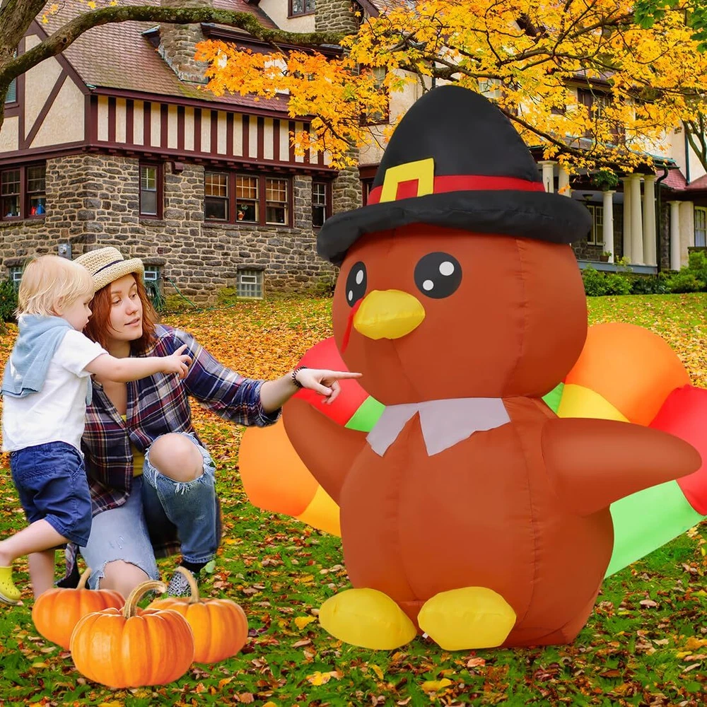 Baby Turkeys Inflatable: Embrace the heartwarming spirit of Thanksgiving with our 4 FT long Thanksgiving inflatables turkey, colorful tail symbols the harvest season. This adorable inflatable turkey is a great way to say "Happy Thanksgiving" to neighbors and guests Easy to Set: This thanksgiving inflatable effortlessly fills with air in no time, thanks to its built-in waterproof and strong air blower. Simply plug it in and watch as blow up turkey inflatable inflates to a fun and impressive height. The CE and UL standard safety-certified adapter with a 10 FT power cord Bright LED Lights: Blow up turkey inflatable includes 4 built-in LED lights, perfect for night display. Set the inflatable thanksgiving decorations out in your front yard to complement a fall scene for the holidays and inspire thanksgiving cheer for anyone driving through your neighborhood Package Includes: 1*blower,1*storage bag,4*stakes and 2*ropes. No worries any more about if the turkey inflatable outdoor decoration might fly away by the wind or not. Thanksgiving inflatables outdoor decorations is perfect for both indoor and outdoor use, spreading joy and holiday cheer wherever it's placed Happy Thanksgiving for You: inflatable turkey outdoor comes with everything you need for a glowing nighttime display that will be the talk of the neighborhood! Outdoor thanksgiving decorations would be ideal for Thanksgiving event decoration, Holiday blow-ups, Thanksgiving night event, Fall Thanksgiving prop, classroom decorations and more