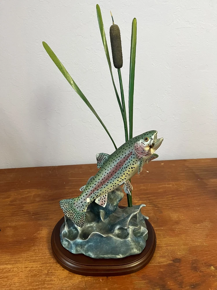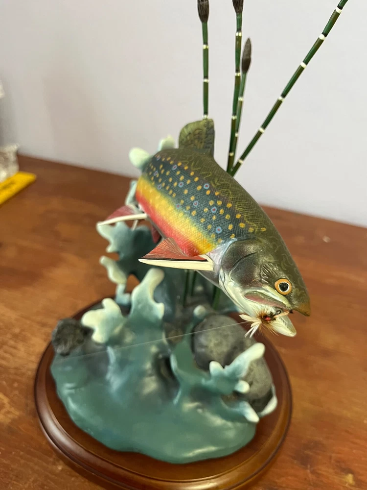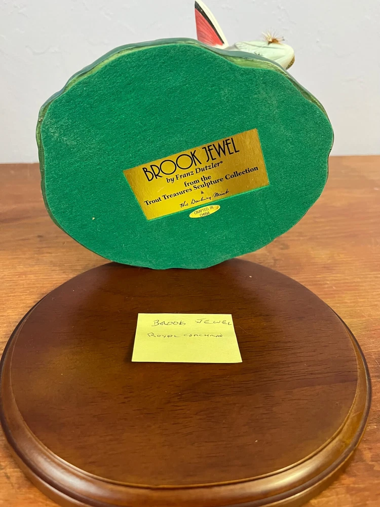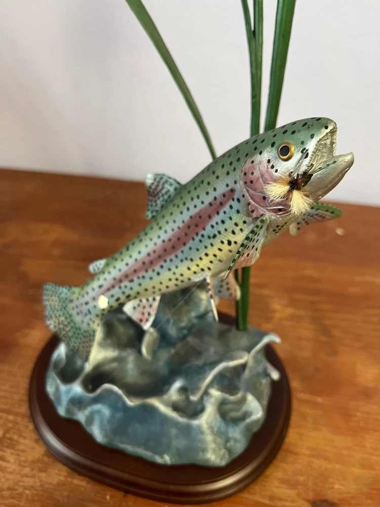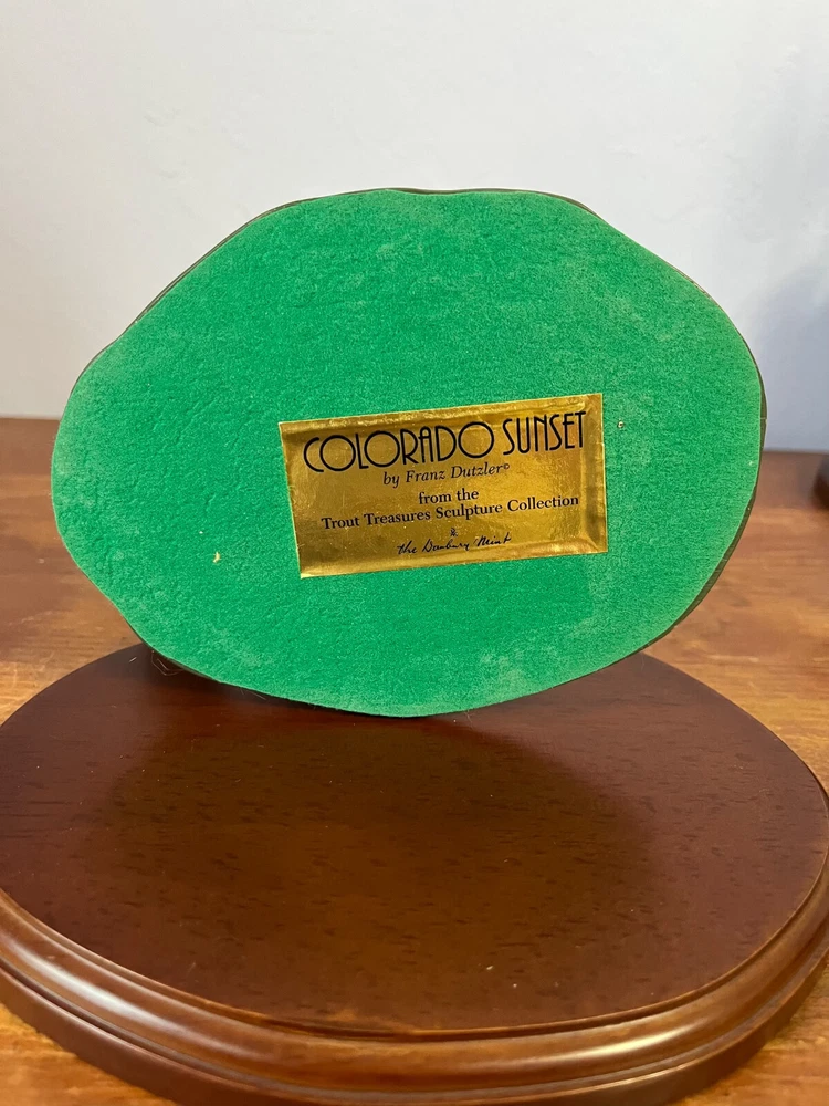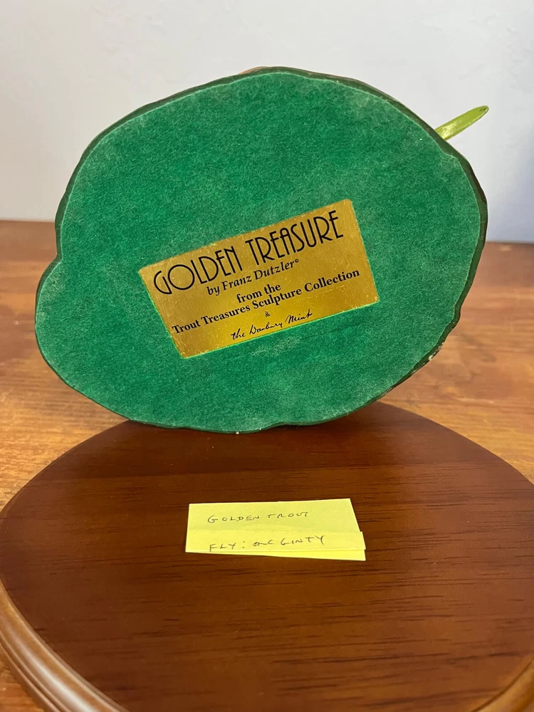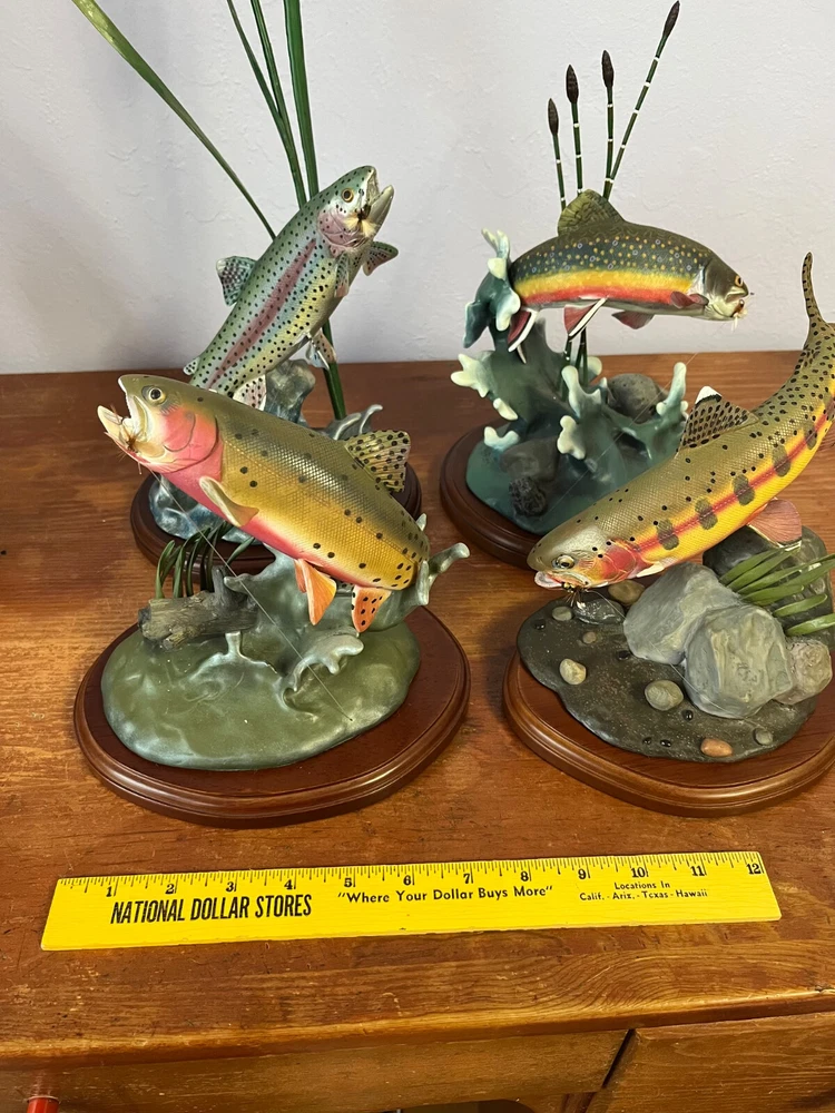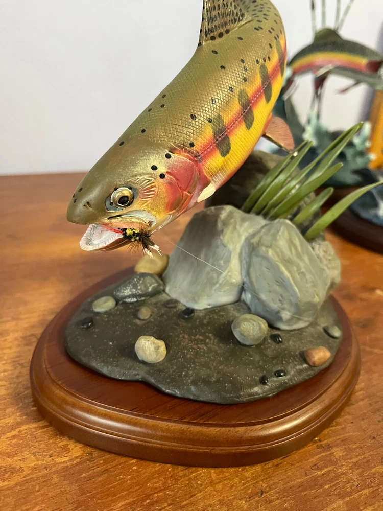Unused sculptures from "Trout Treasure Sculpture Collection" by Franz Dutzler from The Danbury Mint. Any blemishes are in photos. Each sculpture have its own wood base shaped specifically for each sculpture. The four fish in the collection include: - Rainbow Rising (rainbow trout with royal wolff fly) - Golden Treasure (golden trout with mcginty fly) - Colorado Sunset (Colorado river with a cut throat, pink lady fly) - Brook Jewel (brook trout with royal coachman fly)