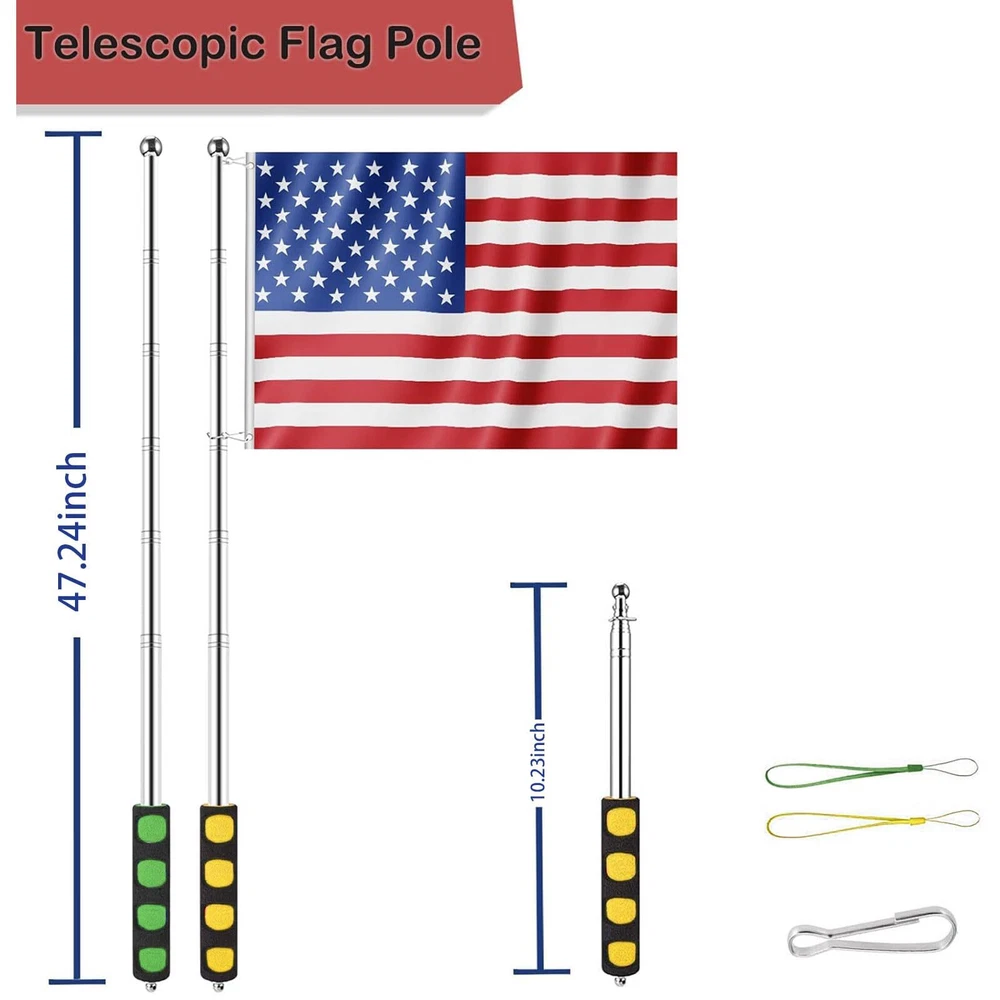 Specification: Material: Premium stainless steel and sponge Size: 160cm (stretched), 28cm (unstretched) Weight: each weights 110g Color: red, blue Package Includes: 1 × Blue telescopic flag pole 1 × Red telescopic flag pole 4× clips Features: Retractable design: The flagpole can be extended from 28cm to 160cm, easy to and carry. Stable and strong wind resistance:The inner slot is reinforced with the built-in copper cards , so the telescopic pole will become tighter as the stretched length is longer. High quality material: made up of premium stainless steel, the telescopic pole is anti-rust and wear-resistant, suitable for long-time outdoor use. Wide applications: camping flag poles, tourist guide, travelling, presentation pointer. Sturdy and Durable: Our flag pole is made up of premium stainless steel,which is anti-rust and wear-resistant, while the handle is made up of eco-friendly sponge with ergonomic finger pressing design, easy to grip and non-slip. Reinforced Inner Slot: With the built-in copper cards in the inner slot, the telescopic pole will become tighter as the stretched length is longer, Stable and strong wind resistance. Telescopic Design: These flagpoles are all telescopic design.It is 160 cm when fully unstretched and 28 cm when folded. Total 7 section.It hardly takes up space in your backpack when you are out camping. Wide Application: These telescopic sticks can be not only used as flag poles for camping, travelling and tourist guide but also can be use as presentation pointer for teachers. 2 Colors Set: Includes 2 telescopic poles with sturdy lanyard (red, blue), 4pcs clips
