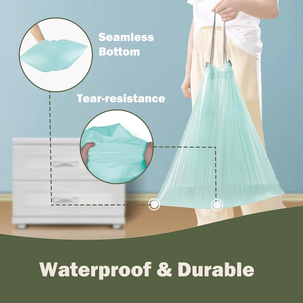 THE SIZE OF THE 100% COMPOSTABLE TRASF BAGS: 4-5 gallon/15-20 liter: 17.7'' * 15.7 inch '' (45*40cm), 0.78 Mils; 10 counts per roll x 3 rolls = 30 counts (Green). Fit most of small trash cans CERTIFIED COMPOSTABLE IN U.S. & EUROPE: Our compost garbage bags are certified to american standard ASTM D6400 (BPI) and european standard EN 13432 (ok compost home), guaranteed to be 100% compostable in home composting facilities Multipurpose: Our compostable waste bags unscented leak-proof, drawstring, strong.They provide the perfect fit for kitchen food waste, office trash, bathroom, bedroom, use for cat litter bags, baby poop bags INSTRUCTIONS FOR USE: Our organic garbage bag are made of starch-based materials. Avoid overheating, place the compost bag in a cool and dry place and use it up within one year after purchase. Let's work together to make our home better and better and give our next generation a more comfortable environment. Replacing plastic with our sustainably manufactured, compostable bags. Let's make Earth a better place.