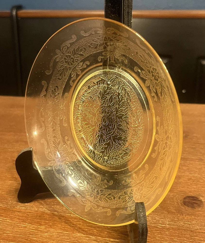 This set of 4 Hazel-Atlas Florentine #2 poppy yellow sherbet plates is a great addition to any collection. The plates measure 6" and feature a round shape with a glossy finish. The decorative Florentine pattern adds a touch of elegance to any table setting.