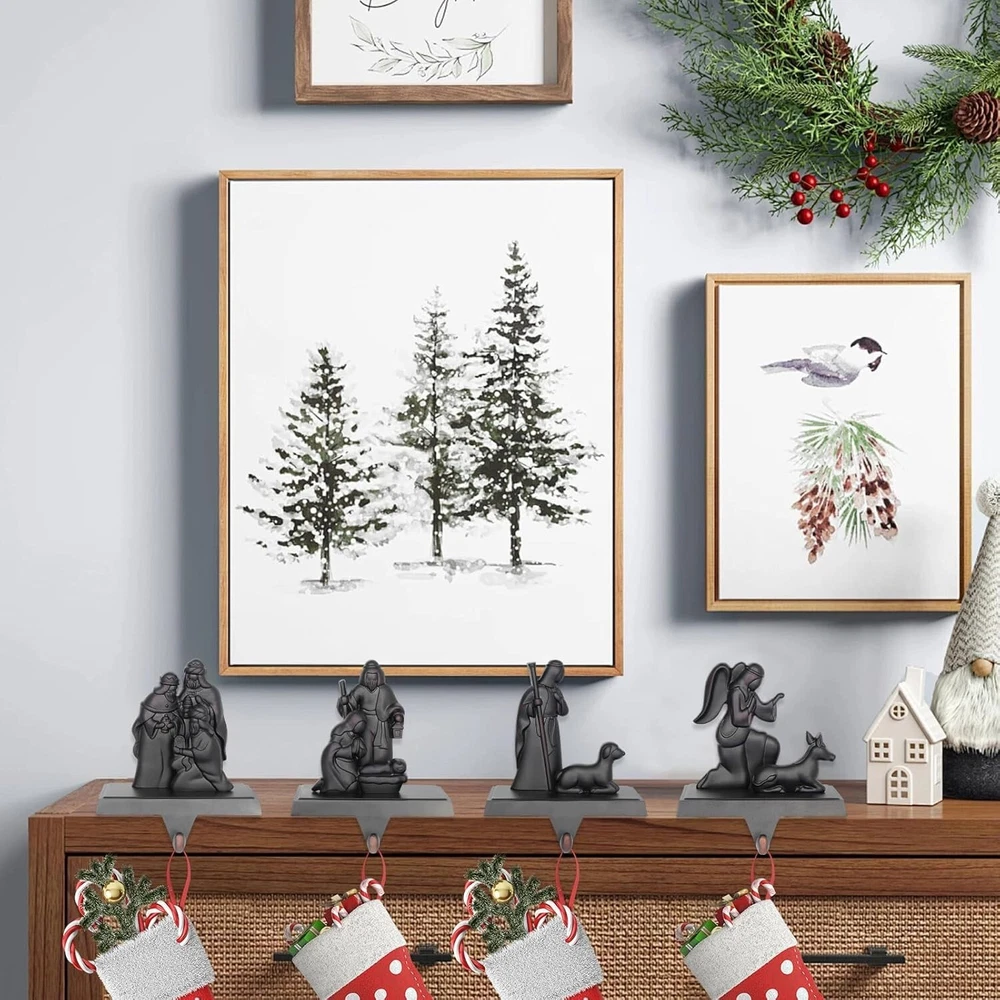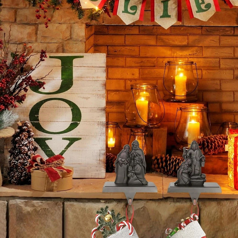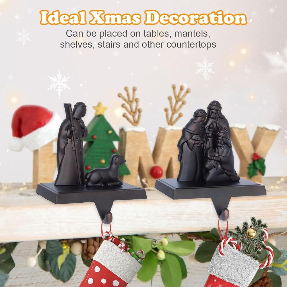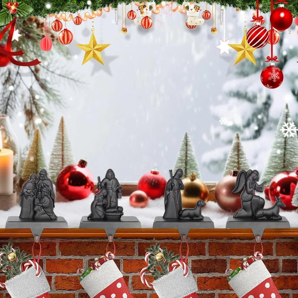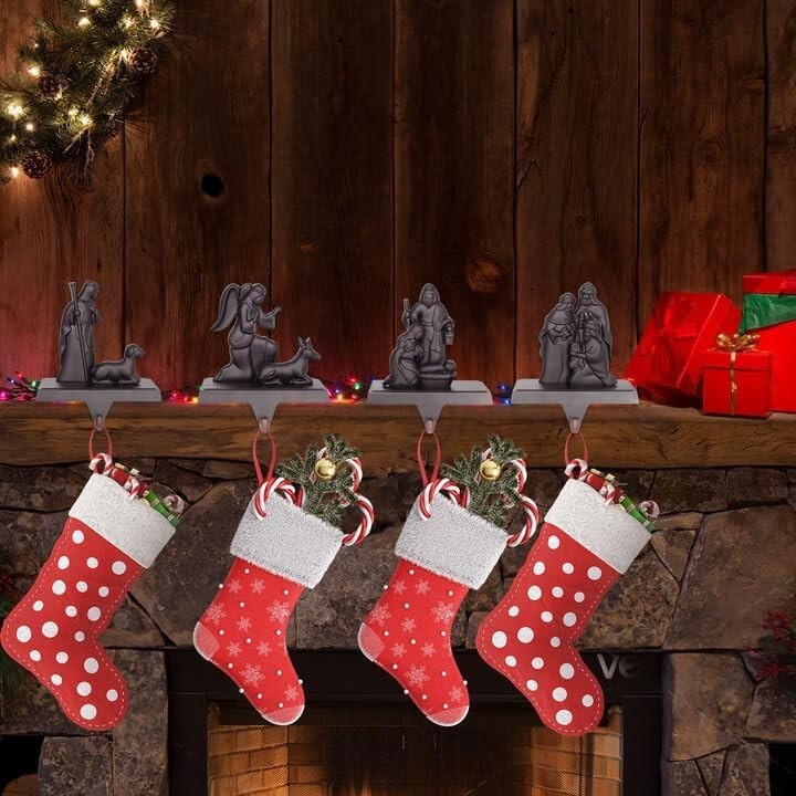 Package Includes : You will receive 4 mantel sock holders, including 4 Nativity scene ornaments, the size of the angel and the donkey is about 12.5*8.5*14cm; the size of the shepherd and the lamb is about 12.5*8.5*15cm; the size of the Virgin and Jesus is about 12.5*8.5*14.5cm; the size of the Three Kings is about 12.5*8.5*14.5cm Christmas Sock Holder : The bronze Nativity mantel is more unique and retro, and the bottom of the Christmas sock holder is covered with soft and non-slip material, which makes it not easy to slide, while protecting your desktop from scratches. With thickened hooks, you can fill more gifts in the Christmas stockings Metal Sock Holder : The Christmas sock holder is made of high-quality metal, which is durable and has a long service life. Decorating the Nativity theme mantel sock holder at home will bring you and your family more beautiful Christmas memories Christmas Decoration : Decorating the weighted mantel sock holder on the mantel, table, windowsill and shelf will bring you a richer Christmas atmosphere. Decorating Christmas stocking hangers at home will bring more different and wonderful memories to you and your family