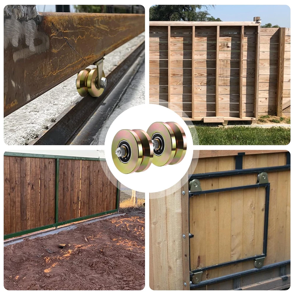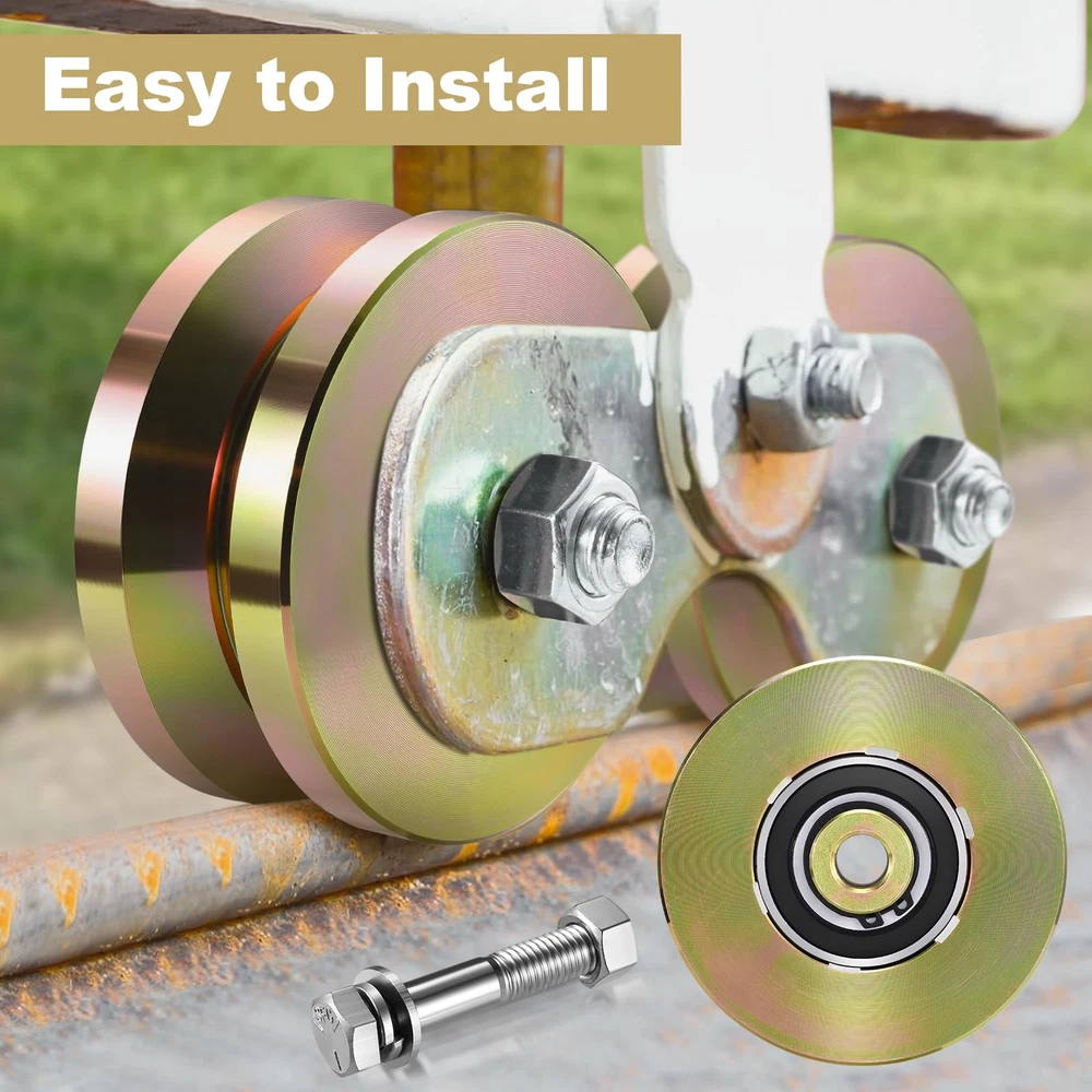Package Includes:2 pieces 4 inches V groove wheels with 2 pieces M12*85mm screws.Our wheels are heavy duty, sturdy, and corrosion resistant. This gate wheel is about 4 inches in diameter and about 1-3/4" in thickness, the installation aperture of the wheel axle is 0.51 "(13mm),designed to handle heavy duty applications with its impressive 3000 lbs sliding capacity each, ensuring smooth and effortless movement for sliding gates Distinctive Appearance: this V track gate wheel is coated with gold finish with a bright surface, anti corrosion and anti rust, looks nice and with solid support.Material:Made of high quality standard steel AISI 1045(45 # steel) Our sliding gate rollers are usually applied for sliding doors or slide rails, and the bearings are sealed, requiring no maintenance or lubrication, its sturdy construction ensures that it can withstand the toughest conditions, maintaining good performance for years to come Easy Installation: this rolling gate hardware kit comes with a convenient package that includes 2 caster wheels, 2 screws, and washers, providing everything you need for a hassle free installation process.