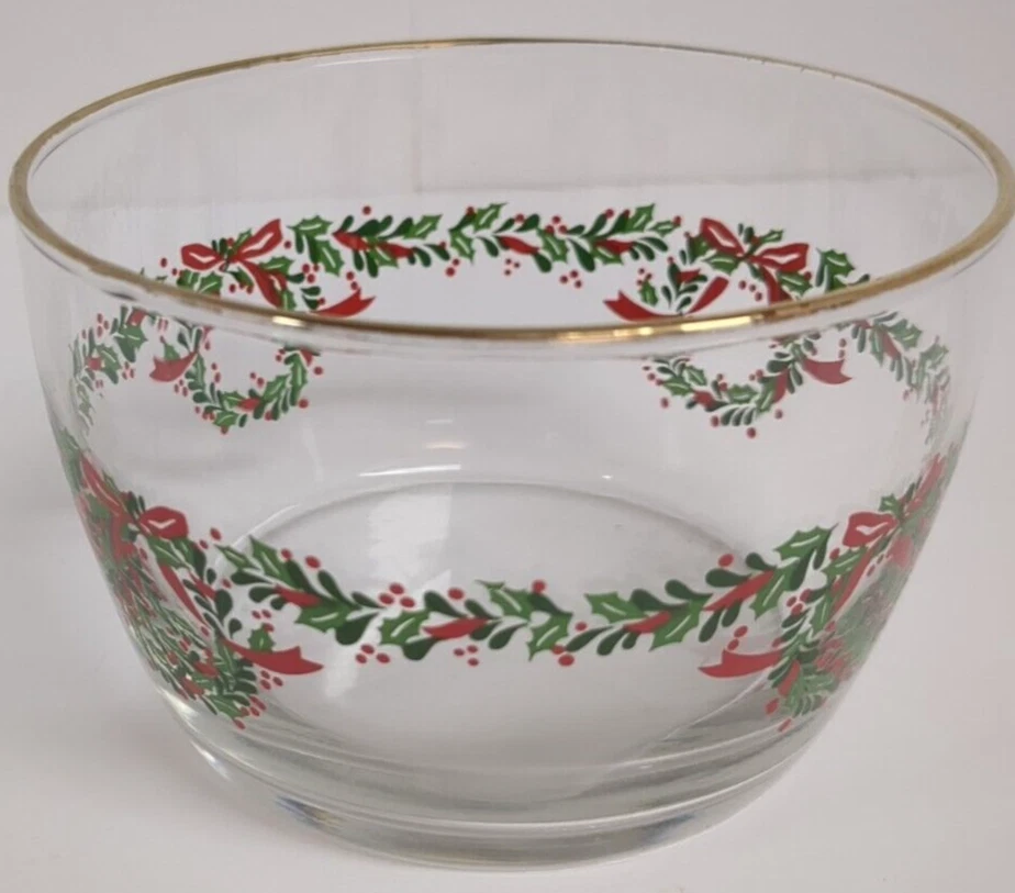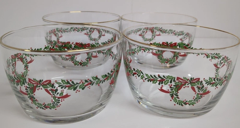 This set of 4 vintage Libbey salad bowls features a festive Holly Berry pattern, making them perfect for a Christmas occasion. The bowls are made of clear glass with red and green accents, showcasing a round shape and a wreath design. These charming bowls are ideal for serving desserts or salads during the holiday season, adding a touch of festive flair to any table setting.